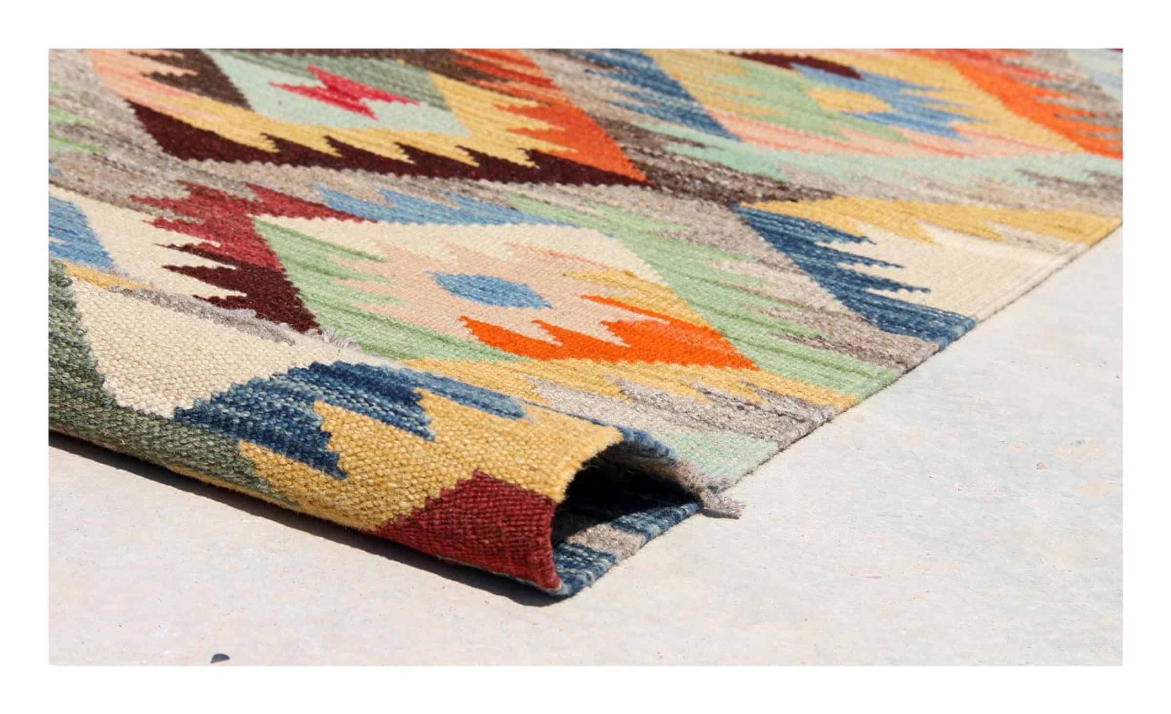 These Kilim rugs have a significant difference from hand-knotted rugs—they are handwoven. As a result, they do not have a high pile of wool and are often flatter and rougher than knotted wool rugs. Their construction is less intricate, making them generally much more affordable. Additionally, Kilim rugs are much lighter and can be laid out on either side. Handwoven Kilims originally come from what was once Persia and are now also widely produced in Afghanistan. They typically feature simple, straight-line patterns, which are characteristic of their weaving technique.