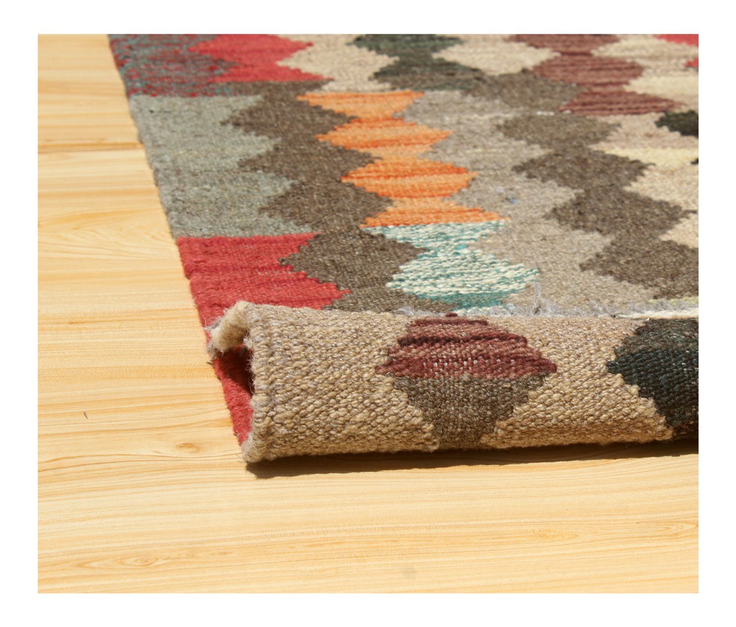 These Kilim rugs have a significant difference from hand-knotted rugs—they are handwoven. As a result, they do not have a high pile of wool and are often flatter and rougher than knotted wool rugs. Their construction is less intricate, making them generally much more affordable. Additionally, Kilim rugs are much lighter and can be laid out on either side. Handwoven Kilims originally come from what was once Persia and are now also widely produced in Afghanistan. They typically feature simple, straight-line patterns, which are characteristic of their weaving technique.