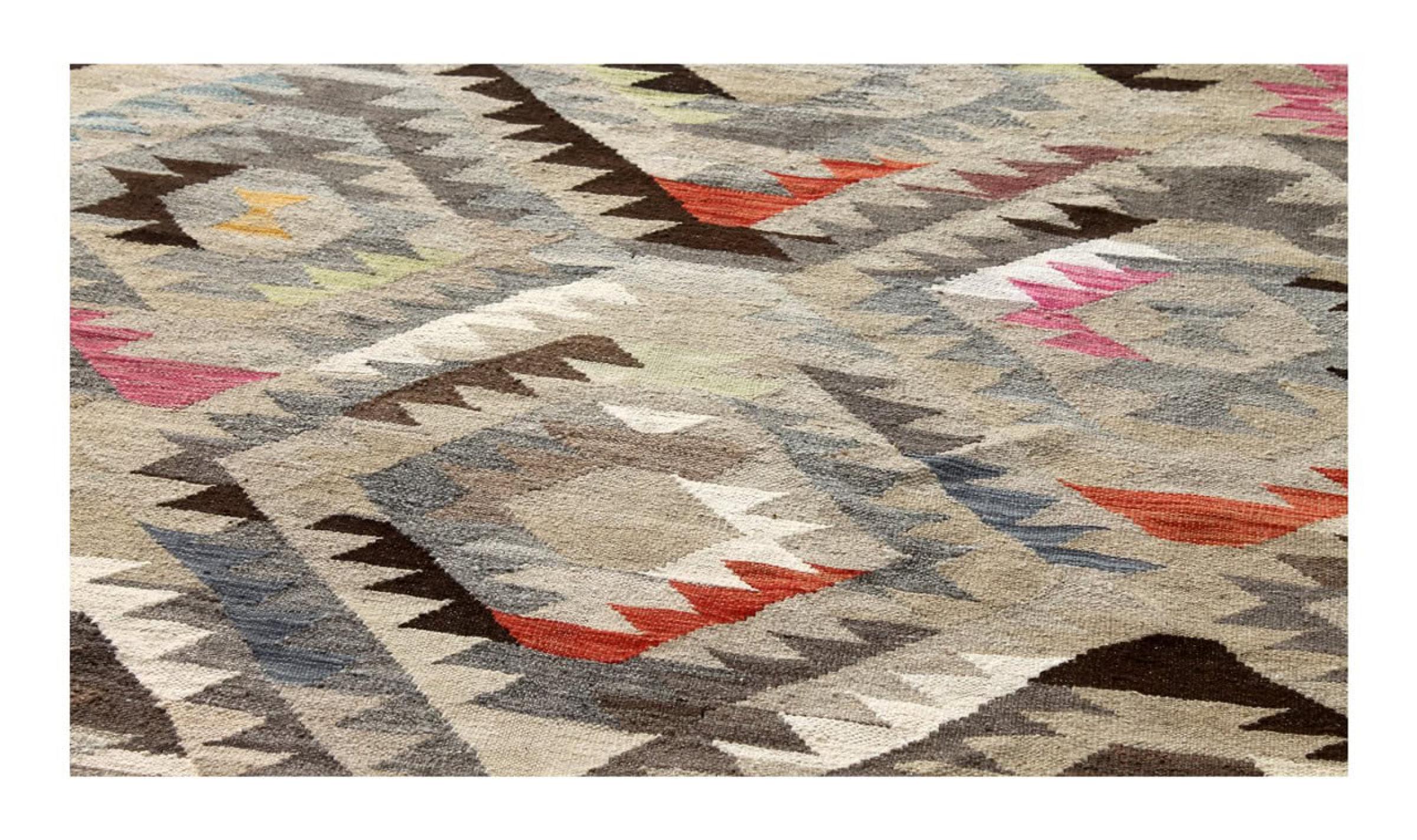 These Kilim rugs have a significant difference from hand-knotted rugs—they are handwoven. As a result, they do not have a high pile of wool and are often flatter and rougher than knotted wool rugs. Their construction is less intricate, making them generally much more affordable. Additionally, Kilim rugs are much lighter and can be laid out on either side. Handwoven Kilims originally come from what was once Persia and are now also widely produced in Afghanistan. They typically feature simple, straight-line patterns, which are characteristic of their weaving technique.