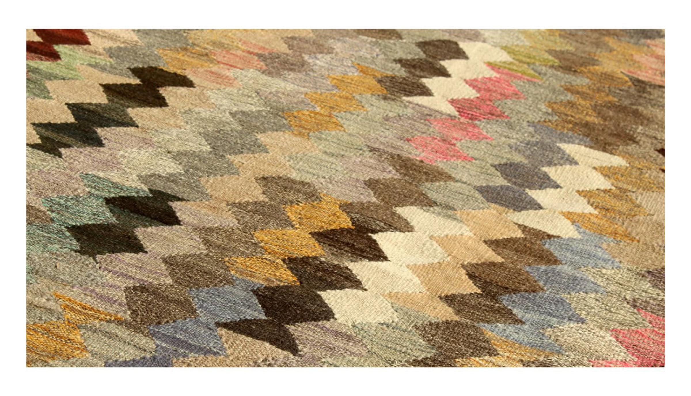 These Kilim rugs have a significant difference from hand-knotted rugs—they are handwoven. As a result, they do not have a high pile of wool and are often flatter and rougher than knotted wool rugs. Their construction is less intricate, making them generally much more affordable. Additionally, Kilim rugs are much lighter and can be laid out on either side. Handwoven Kilims originally come from what was once Persia and are now also widely produced in Afghanistan. They typically feature simple, straight-line patterns, which are characteristic of their weaving technique.