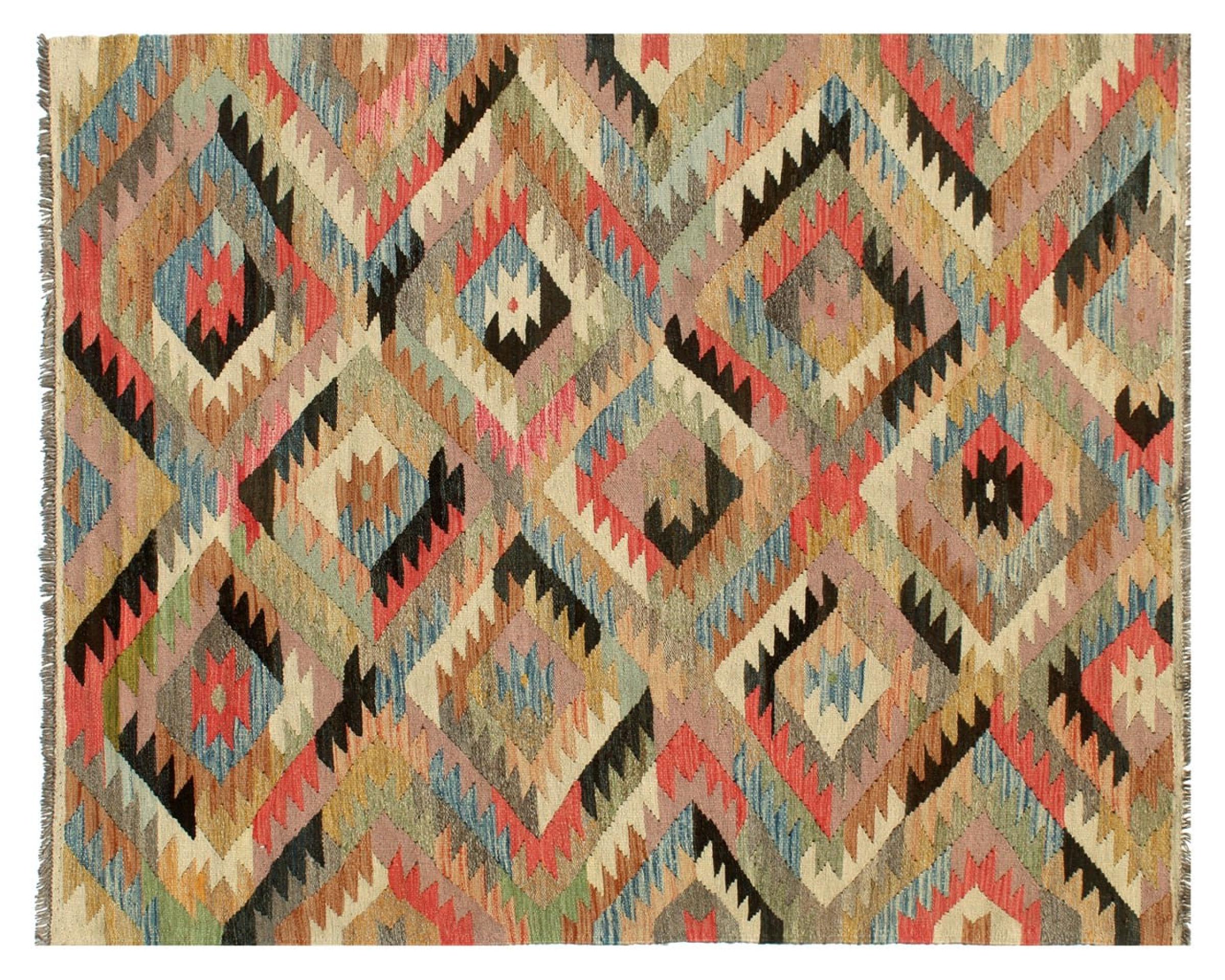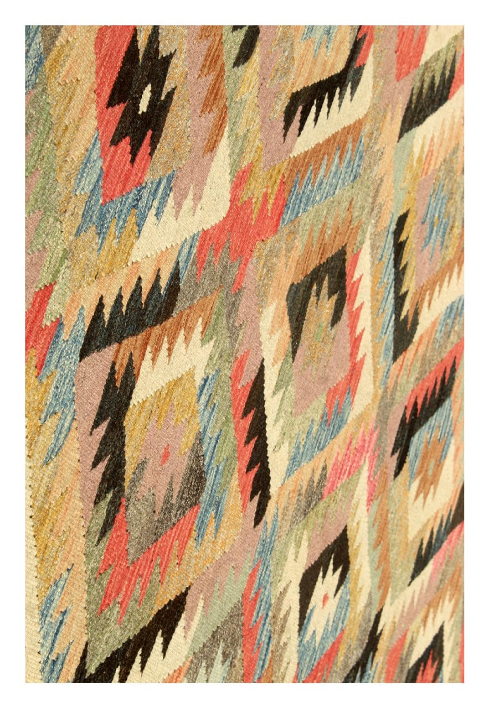 These Kilim rugs have a significant difference from hand-knotted rugs—they are handwoven. As a result, they do not have a high pile of wool and are often flatter and rougher than knotted wool rugs. Their construction is less intricate, making them generally much more affordable. Additionally, Kilim rugs are much lighter and can be laid out on either side. Handwoven Kilims originally come from what was once Persia and are now also widely produced in Afghanistan. They typically feature simple, straight-line patterns, which are characteristic of their weaving technique.