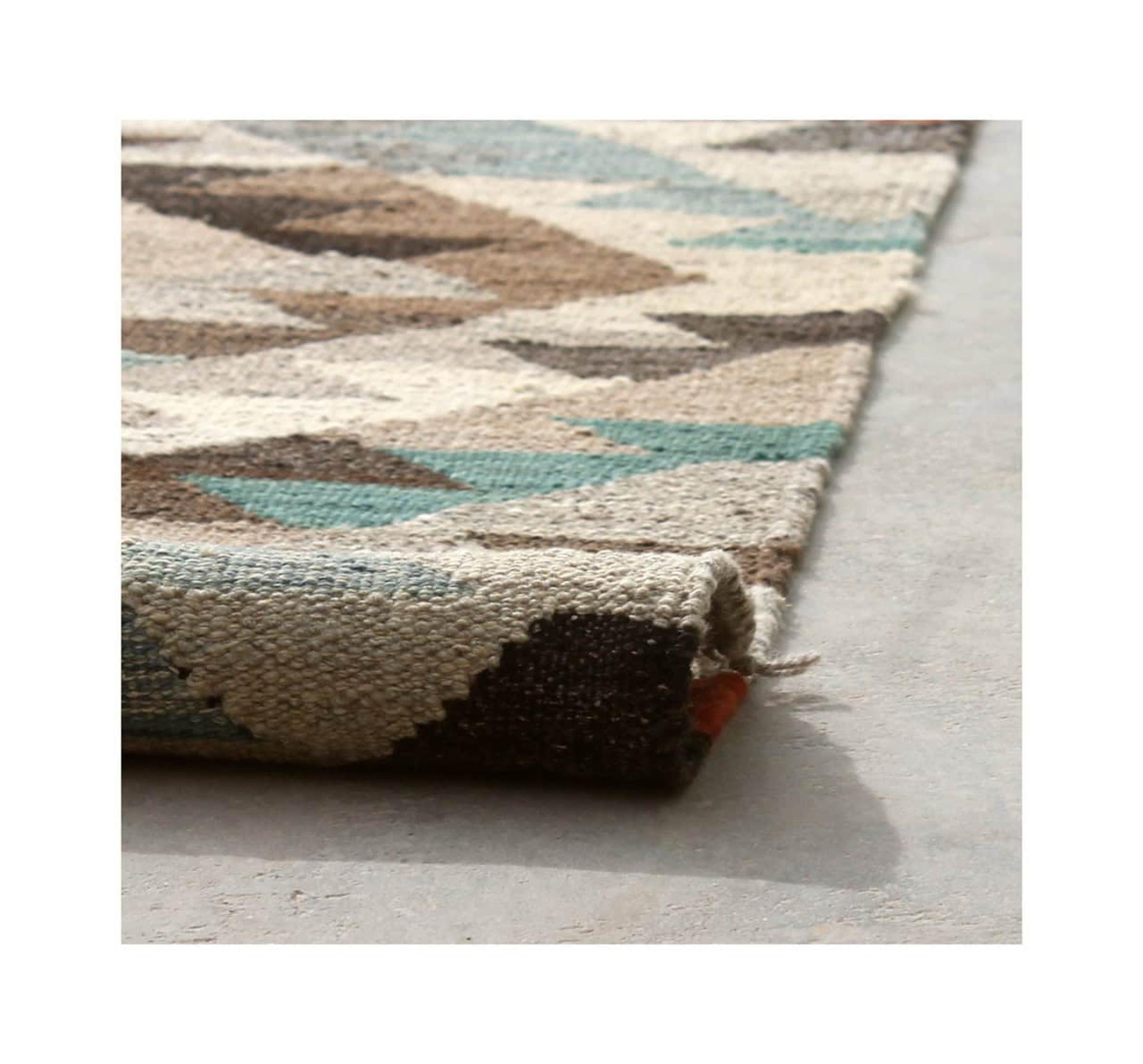 This rug was made as a flat weave by hand on a loom. Flatweave is the term used to describe rugs that have no pile. As the name promises, these rugs are woven and not knotted. This results in a flat rug with a structured surface. Flatweaves are not as soft and usually thinner than knotted rugs. At the same time they are much less complex to manufacture and can usually be laid out from both sides (front and back). Their patterns are usually geometric, which is determined by the fabric.