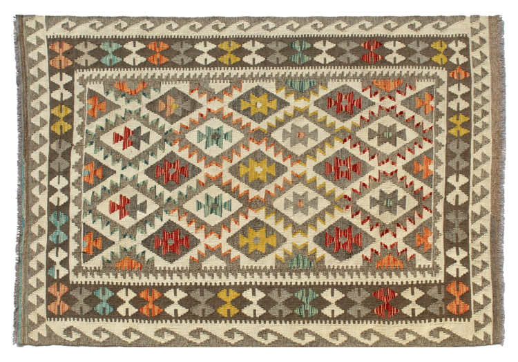 These Kilim rugs have a significant difference from hand-knotted rugs—they are handwoven. As a result, they do not have a high pile of wool and are often flatter and rougher than knotted wool rugs. Their construction is less intricate, making them generally much more affordable. Additionally, Kilim rugs are much lighter and can be laid out on either side. Handwoven Kilims originally come from what was once Persia and are now also widely produced in Afghanistan. They typically feature simple, straight-line patterns, which are characteristic of their weaving technique.