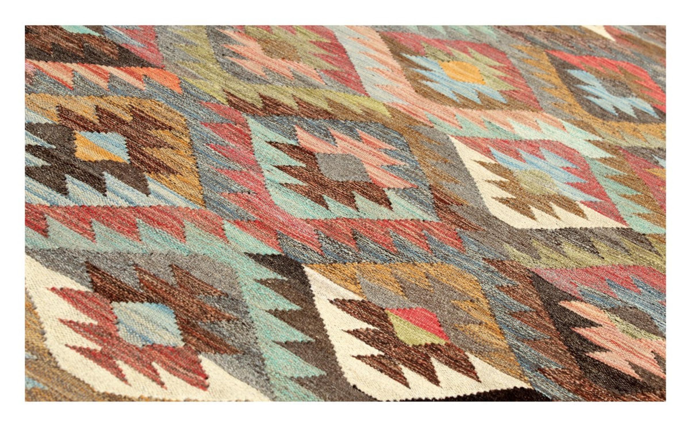 These Kilim rugs have a significant difference from hand-knotted rugs—they are handwoven. As a result, they do not have a high pile of wool and are often flatter and rougher than knotted wool rugs. Their construction is less intricate, making them generally much more affordable. Additionally, Kilim rugs are much lighter and can be laid out on either side. Handwoven Kilims originally come from what was once Persia and are now also widely produced in Afghanistan. They typically feature simple, straight-line patterns, which are characteristic of their weaving technique.