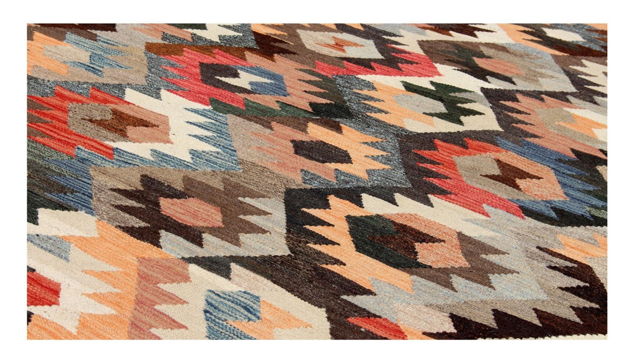 These Kilim rugs have a significant difference from hand-knotted rugs—they are handwoven. As a result, they do not have a high pile of wool and are often flatter and rougher than knotted wool rugs. Their construction is less intricate, making them generally much more affordable. Additionally, Kilim rugs are much lighter and can be laid out on either side. Handwoven Kilims originally come from what was once Persia and are now also widely produced in Afghanistan. They typically feature simple, straight-line patterns, which are characteristic of their weaving technique.