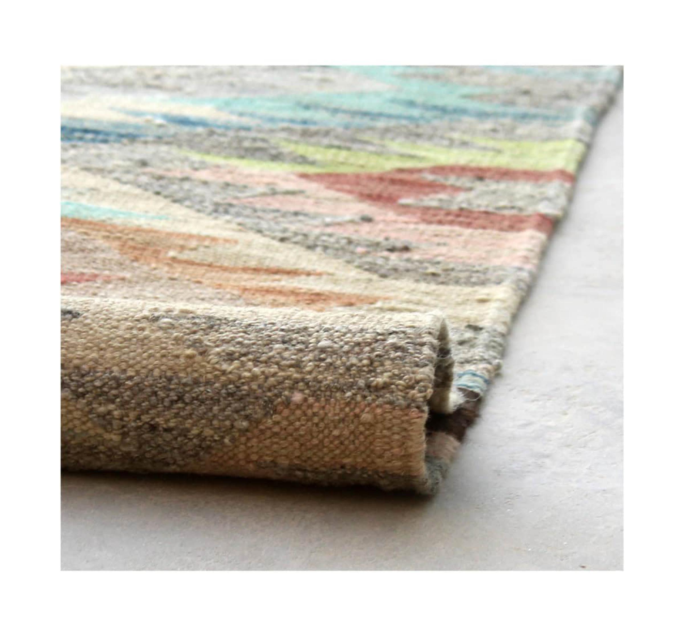 This rug was made as a flat weave by hand on a loom. Flatweave is the term used to describe rugs that have no pile. As the name promises, these rugs are woven and not knotted. This results in a flat rug with a structured surface. Flatweaves are not as soft and usually thinner than knotted rugs. At the same time they are much less complex to manufacture and can usually be laid out from both sides (front and back). Their patterns are usually geometric, which is determined by the fabric.