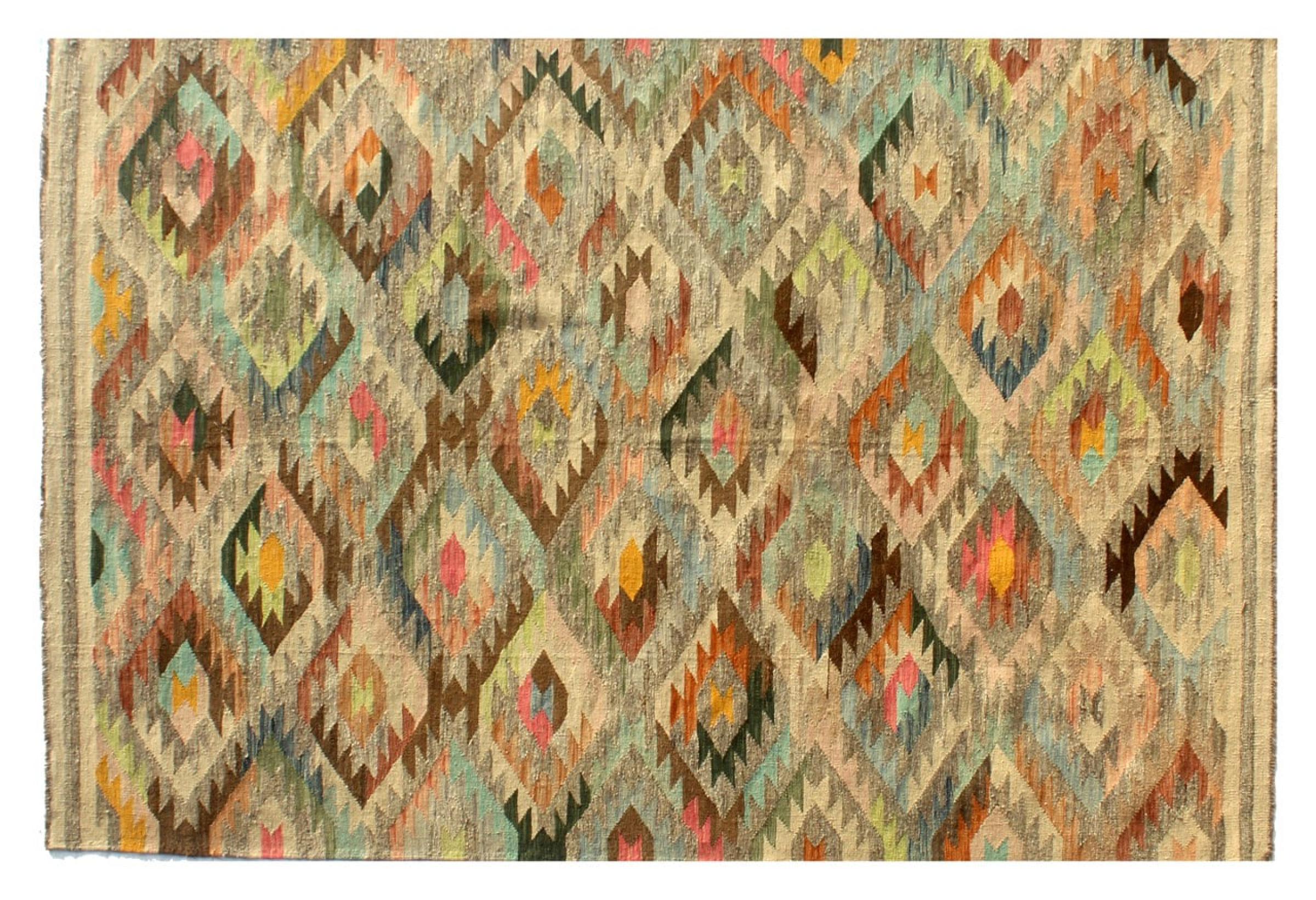 These Kilim rugs have a significant difference from hand-knotted rugs—they are handwoven. As a result, they do not have a high pile of wool and are often flatter and rougher than knotted wool rugs. Their construction is less intricate, making them generally much more affordable. Additionally, Kilim rugs are much lighter and can be laid out on either side. Handwoven Kilims originally come from what was once Persia and are now also widely produced in Afghanistan. They typically feature simple, straight-line patterns, which are characteristic of their weaving technique.