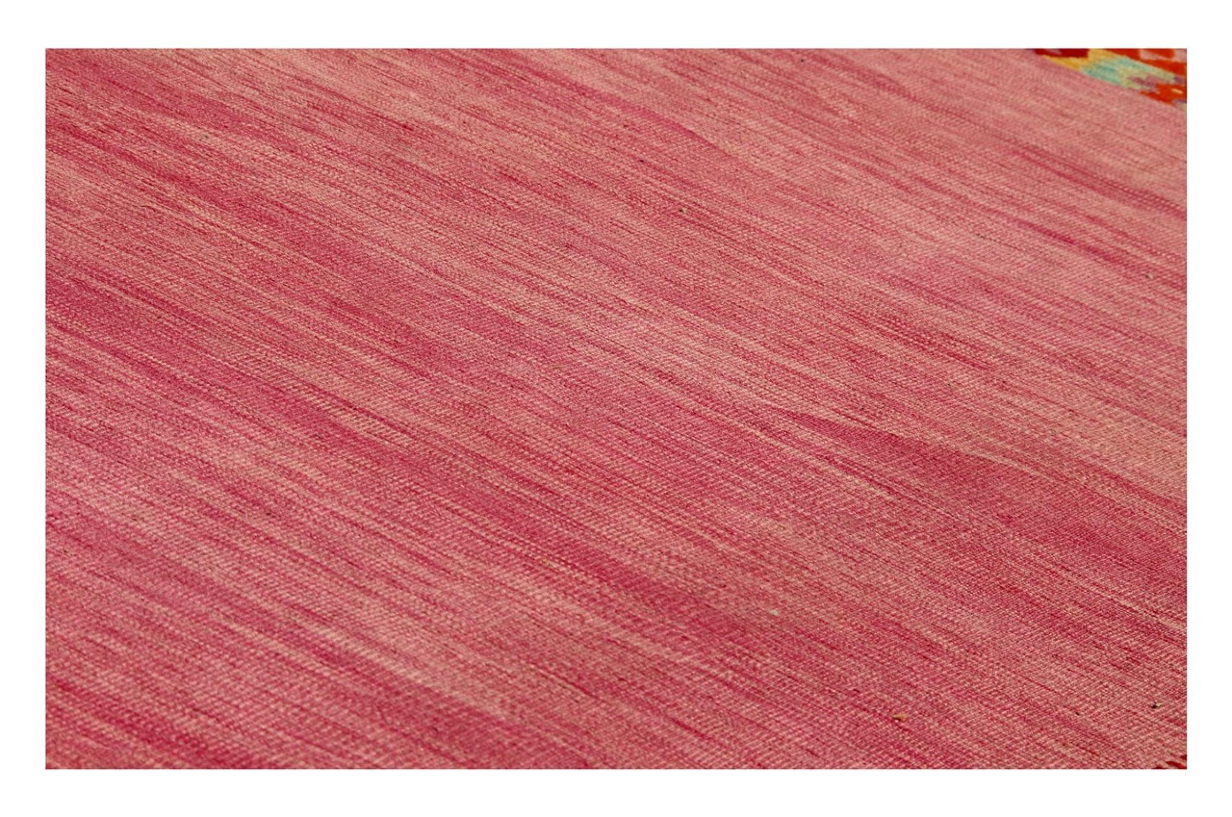 This rug was made as a flat weave by hand on a loom. Flatweave is the term used to describe rugs that have no pile. As the name promises, these rugs are woven and not knotted. This results in a flat rug with a structured surface. Flatweaves are not as soft and usually thinner than knotted rugs. At the same time they are much less complex to manufacture and can usually be laid out from both sides (front and back). Their patterns are usually geometric, which is determined by the fabric.