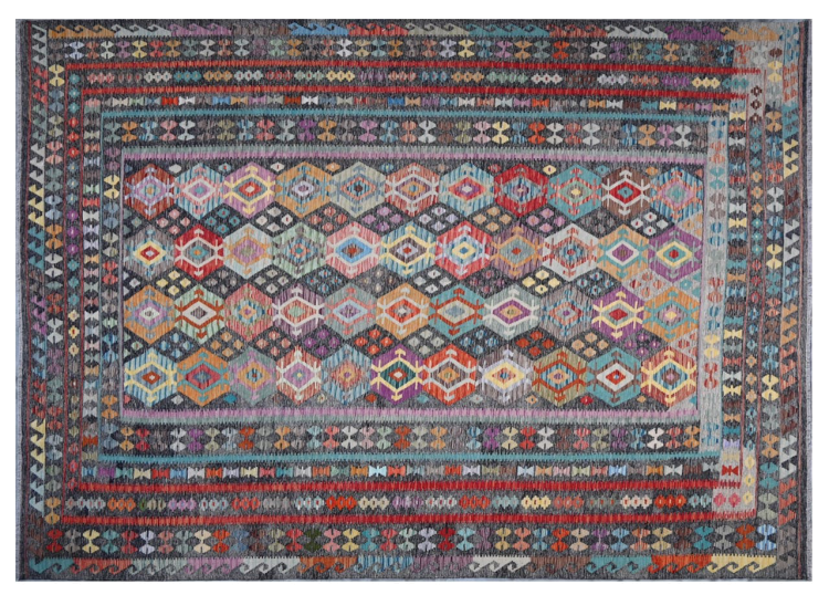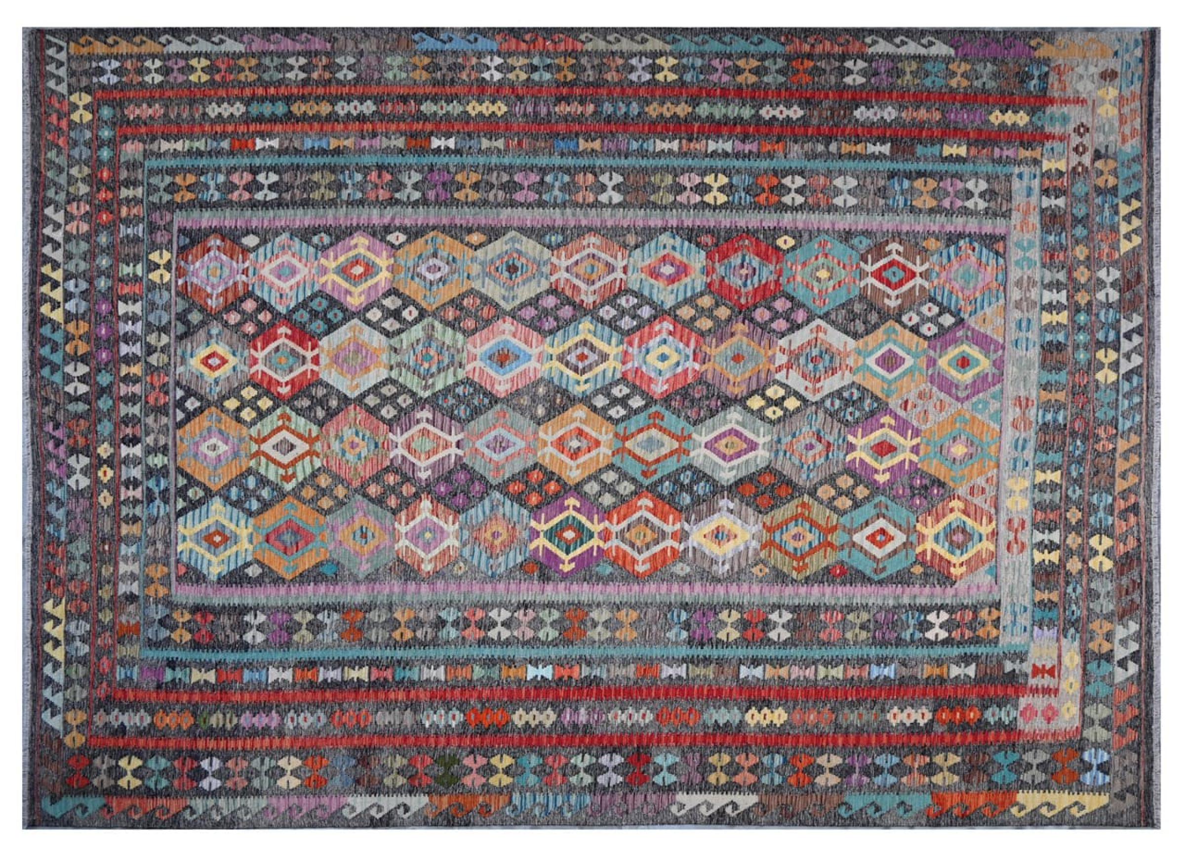 These Kilim rugs have a significant difference from hand-knotted rugs—they are handwoven. As a result, they do not have a high pile of wool and are often flatter and rougher than knotted wool rugs. Their construction is less intricate, making them generally much more affordable. Additionally, Kilim rugs are much lighter and can be laid out on either side. Handwoven Kilims originally come from what was once Persia and are now also widely produced in Afghanistan. They typically feature simple, straight-line patterns, which are characteristic of their weaving technique.