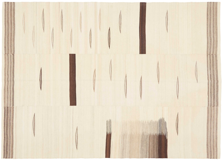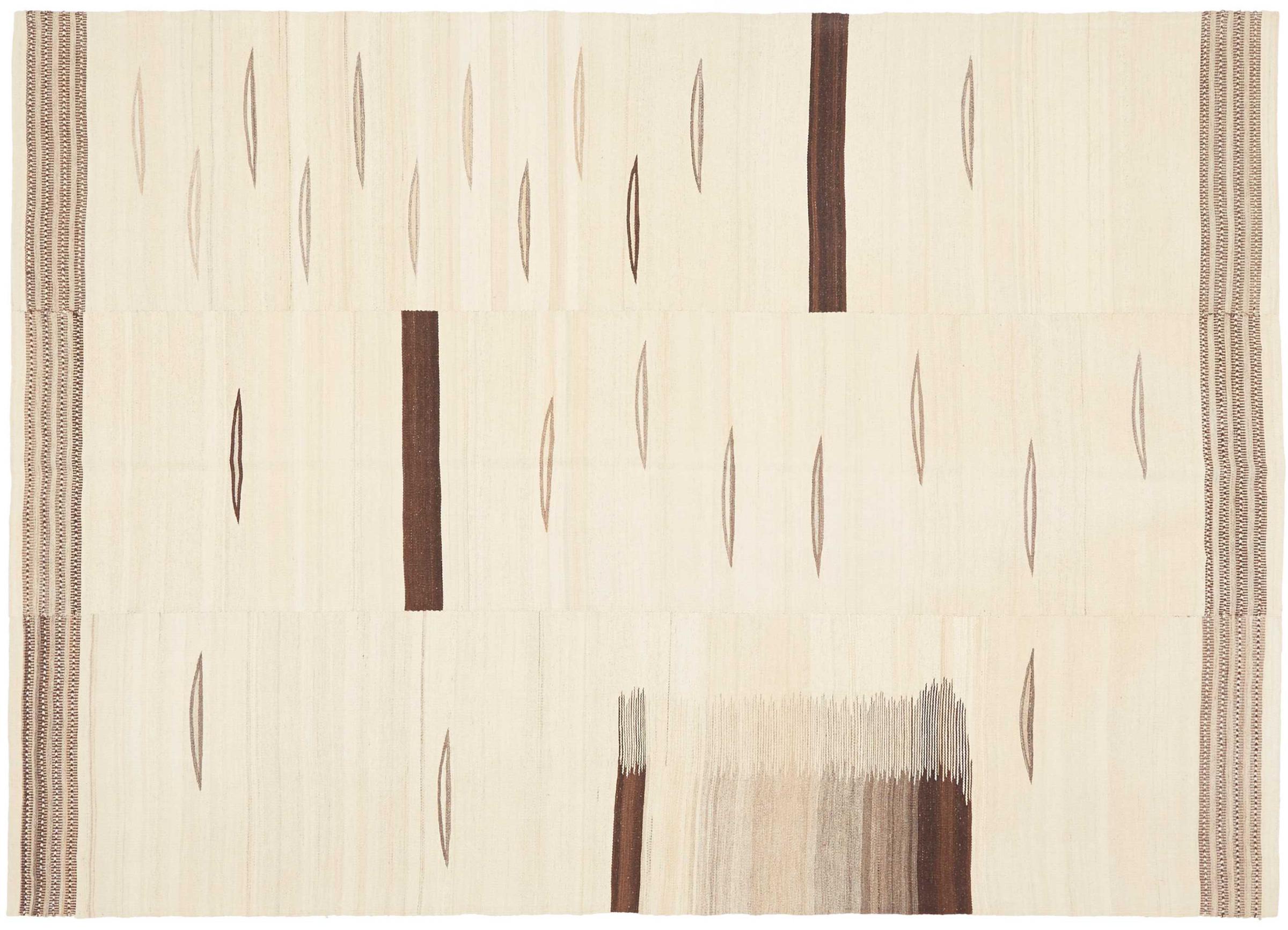 This rug was made as a flat weave by hand on a loom. Flatweave is the term used to describe rugs that have no pile. As the name promises, these rugs are woven and not knotted. This results in a flat rug with a structured surface. Flatweaves are not as soft and usually thinner than knotted rugs. At the same time they are much less complex to manufacture and can usually be laid out from both sides (front and back). Their patterns are usually geometric, which is determined by the fabric.