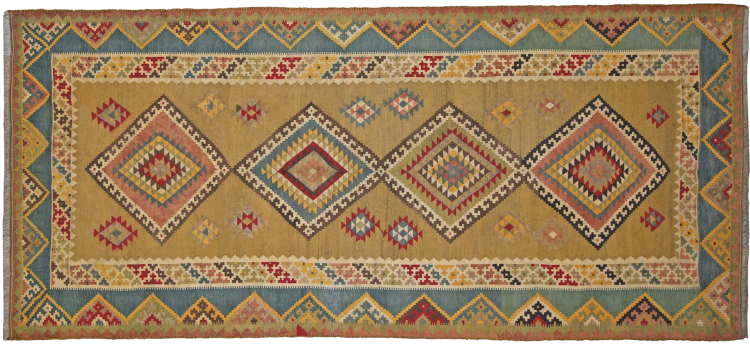 These Kilim rugs have a significant difference from hand-knotted rugs—they are handwoven. As a result, they do not have a high pile of wool and are often flatter and rougher than knotted wool rugs. Their construction is less intricate, making them generally much more affordable. Additionally, Kilim rugs are much lighter and can be laid out on either side. Handwoven Kilims originally come from what was once Persia and are now also widely produced in Afghanistan. They typically feature simple, straight-line patterns, which are characteristic of their weaving technique.