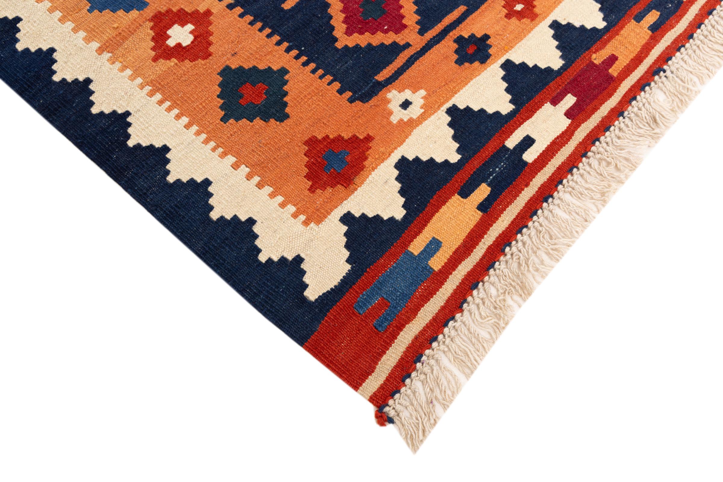 This rug was made as a flat weave by hand on a loom. Flatweave is the term used to describe rugs that have no pile. As the name promises, these rugs are woven and not knotted. This results in a flat rug with a structured surface. Flatweaves are not as soft and usually thinner than knotted rugs. At the same time they are much less complex to manufacture and can usually be laid out from both sides (front and back). Their patterns are usually geometric, which is determined by the fabric.