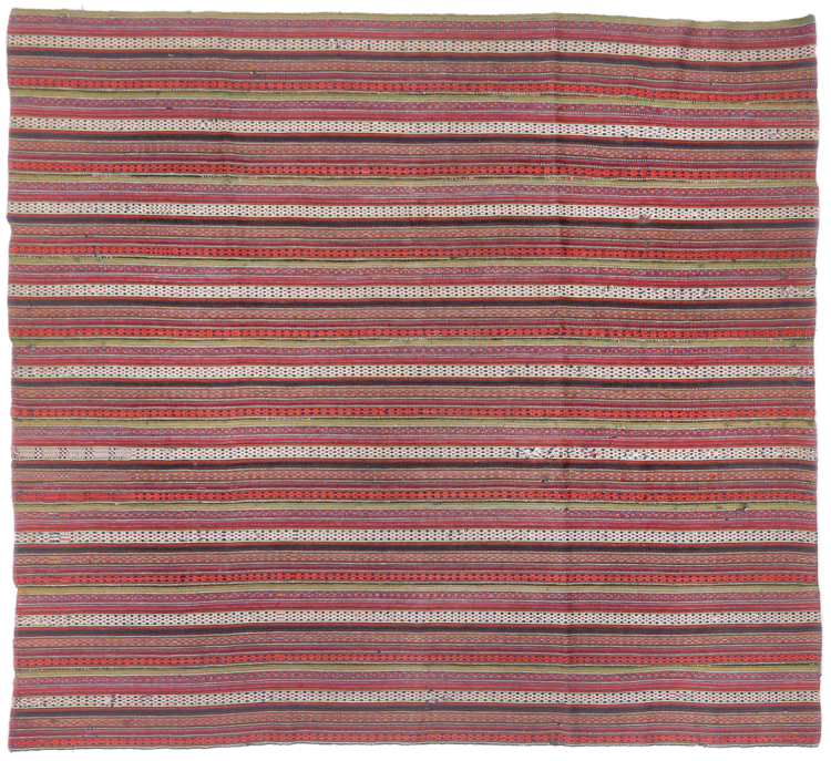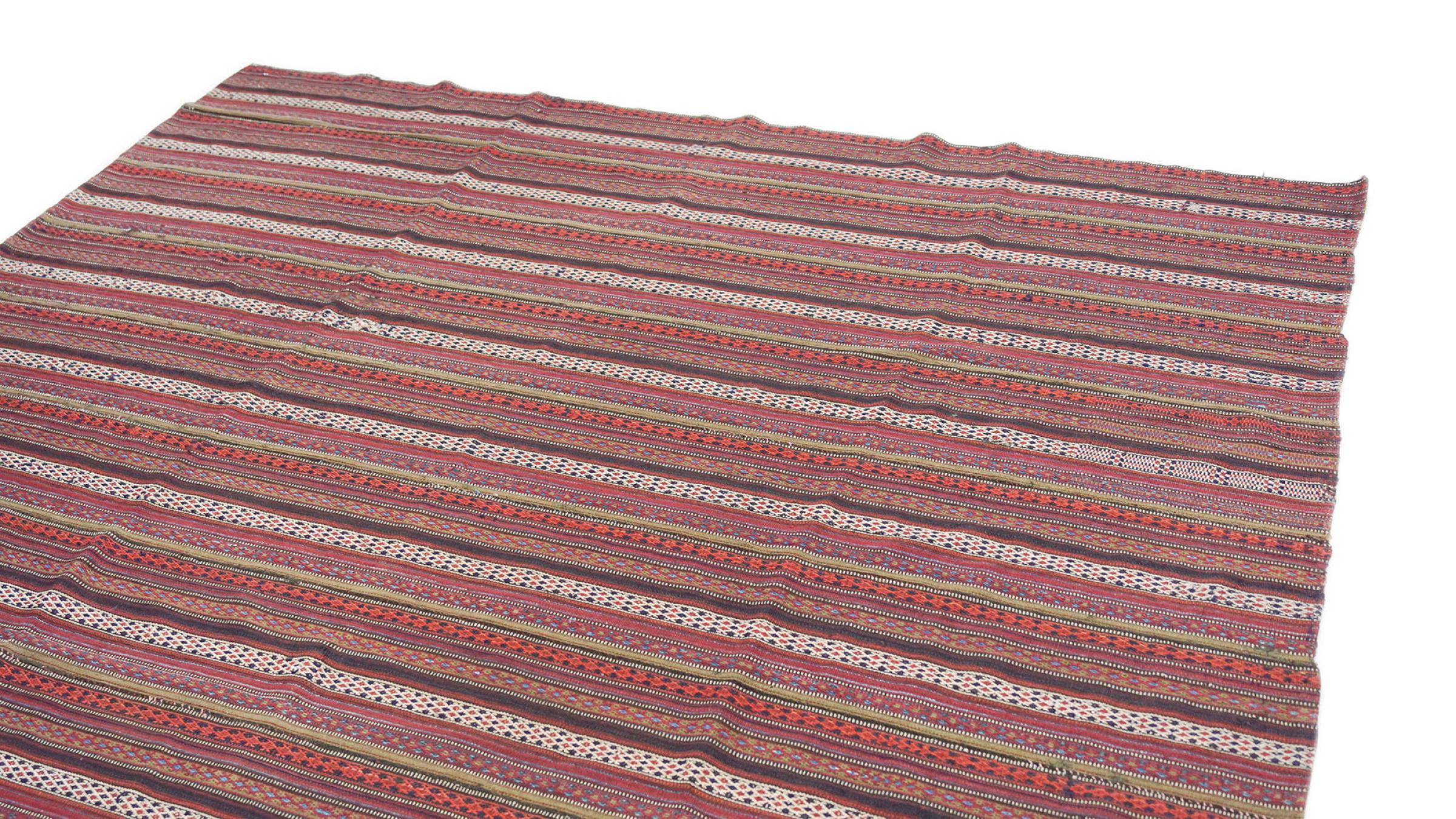 This rug was made as a flat weave by hand on a loom. Flatweave is the term used to describe rugs that have no pile. As the name promises, these rugs are woven and not knotted. This results in a flat rug with a structured surface. Flatweaves are not as soft and usually thinner than knotted rugs. At the same time they are much less complex to manufacture and can usually be laid out from both sides (front and back). Their patterns are usually geometric, which is determined by the fabric.