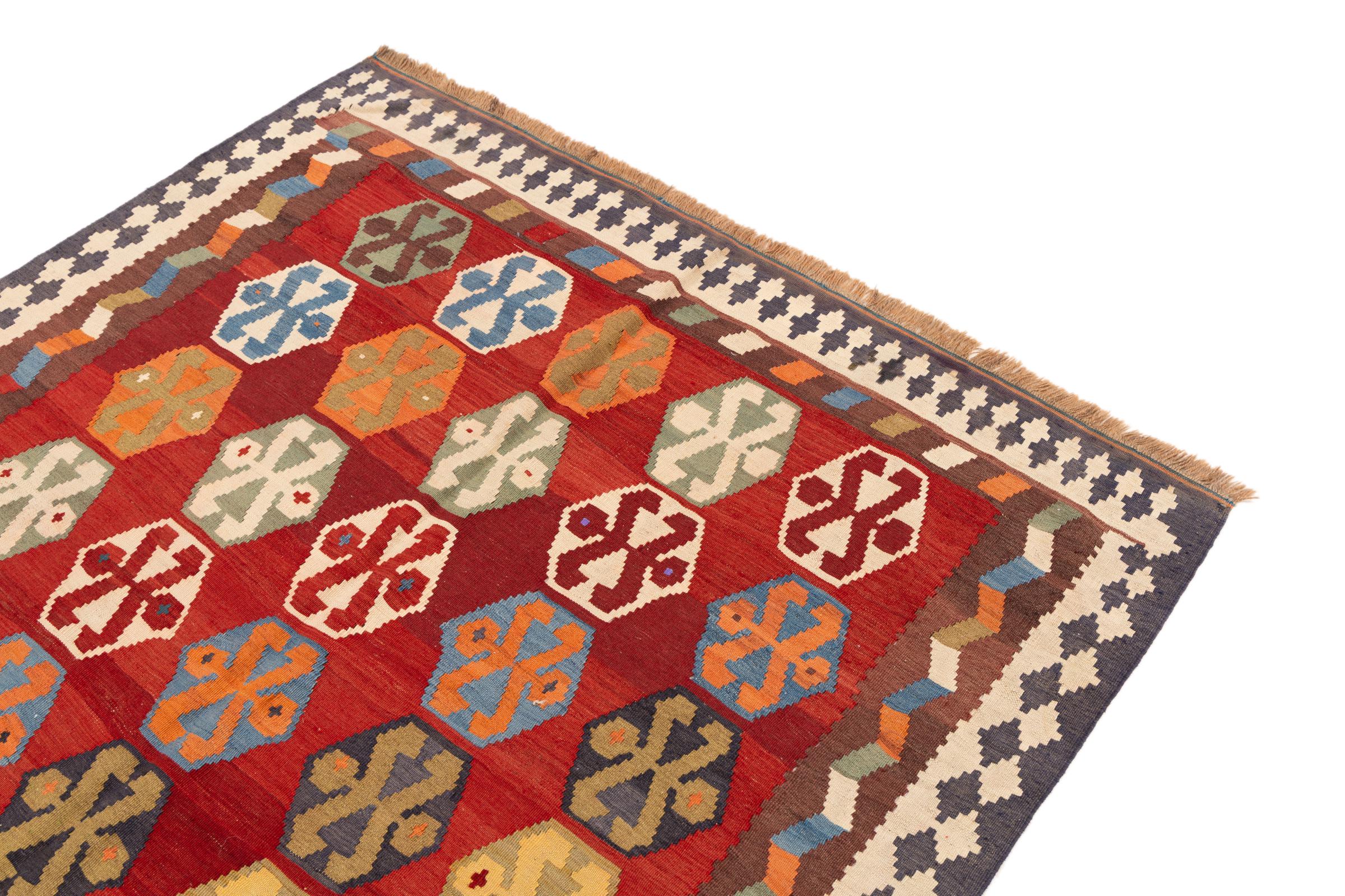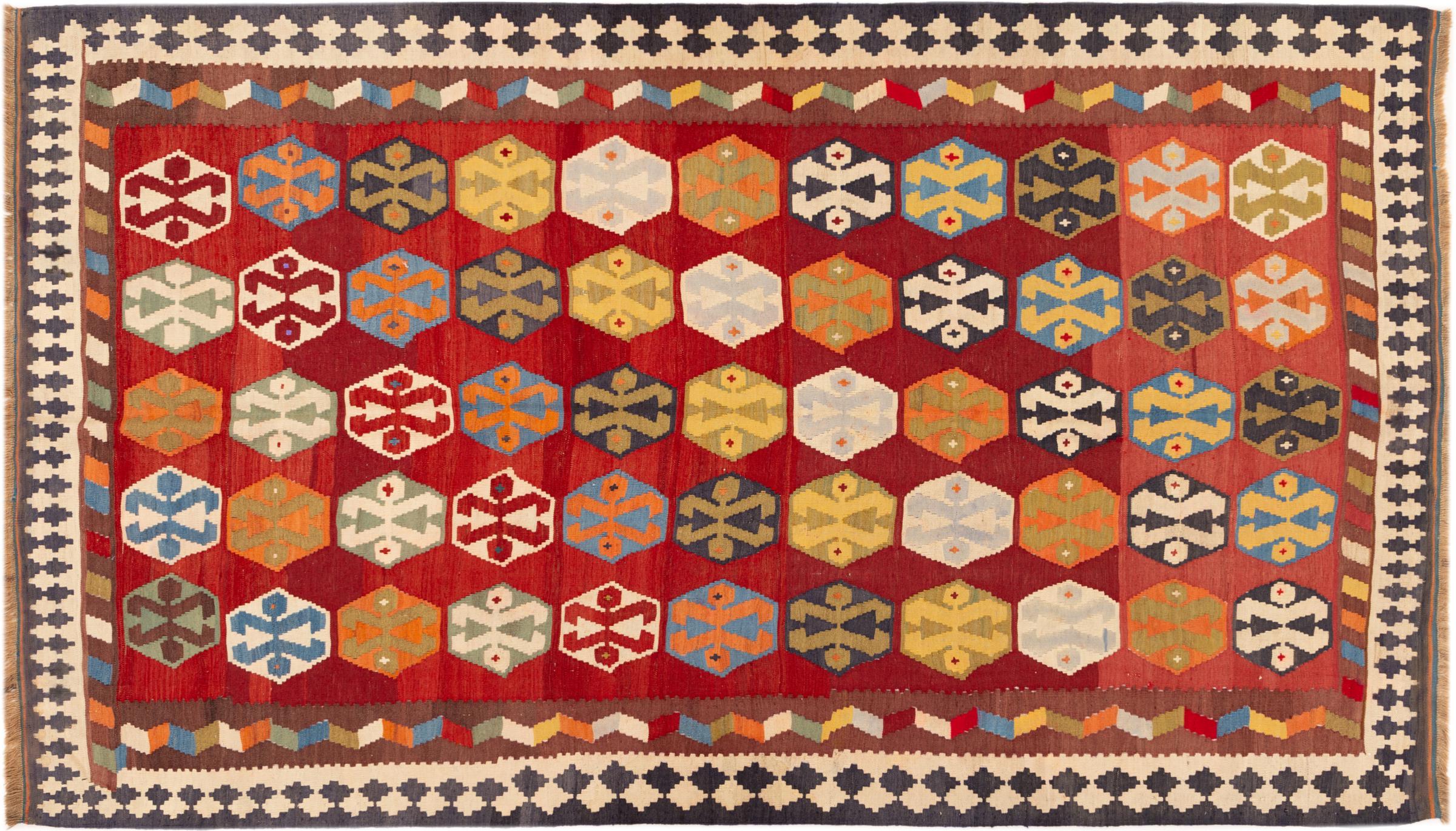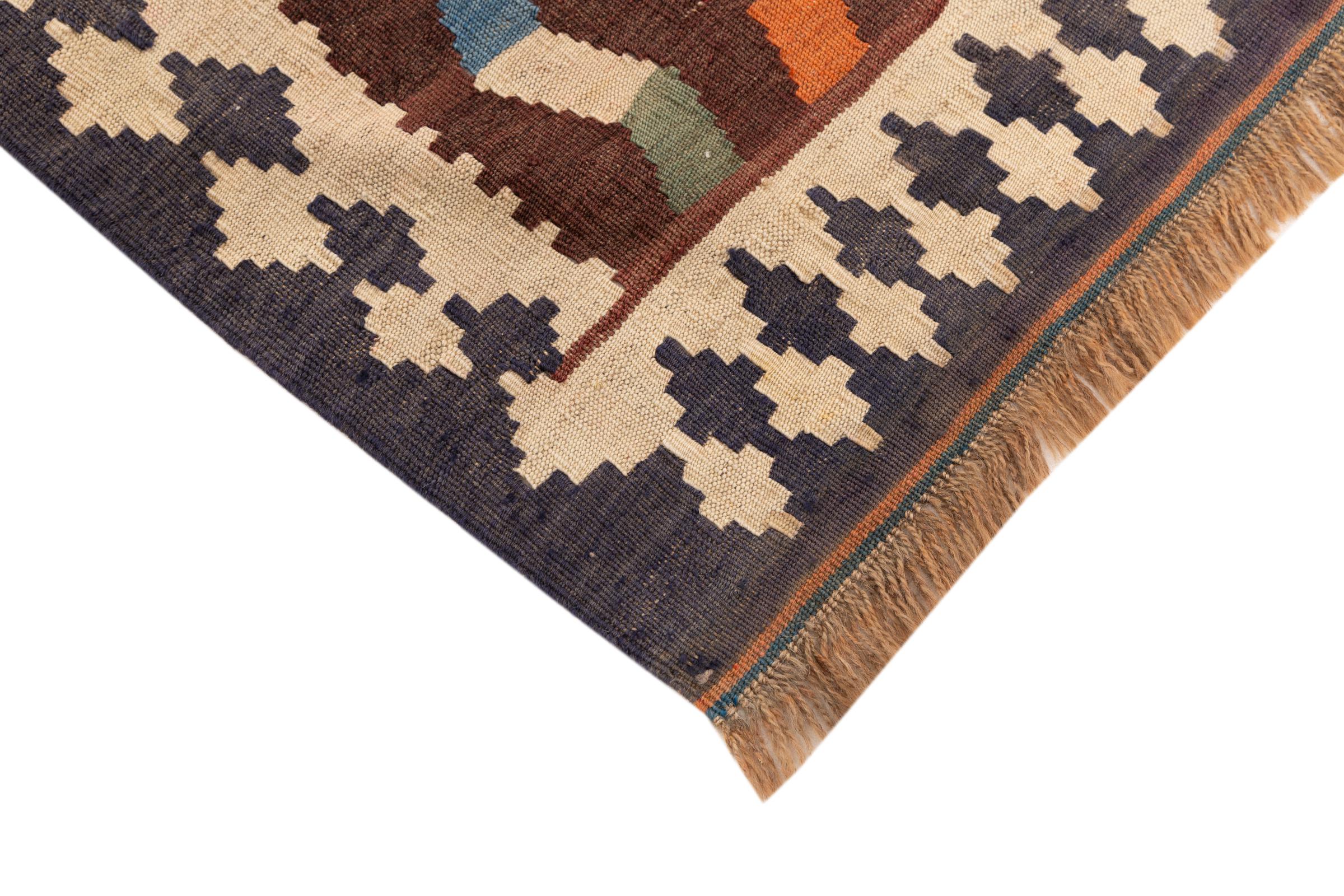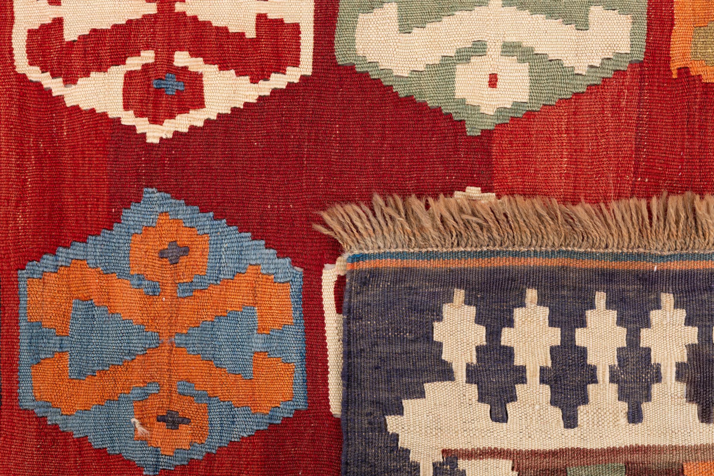 This rug was made as a flat weave by hand on a loom. Flatweave is the term used to describe rugs that have no pile. As the name promises, these rugs are woven and not knotted. This results in a flat rug with a structured surface. Flatweaves are not as soft and usually thinner than knotted rugs. At the same time they are much less complex to manufacture and can usually be laid out from both sides (front and back). Their patterns are usually geometric, which is determined by the fabric.