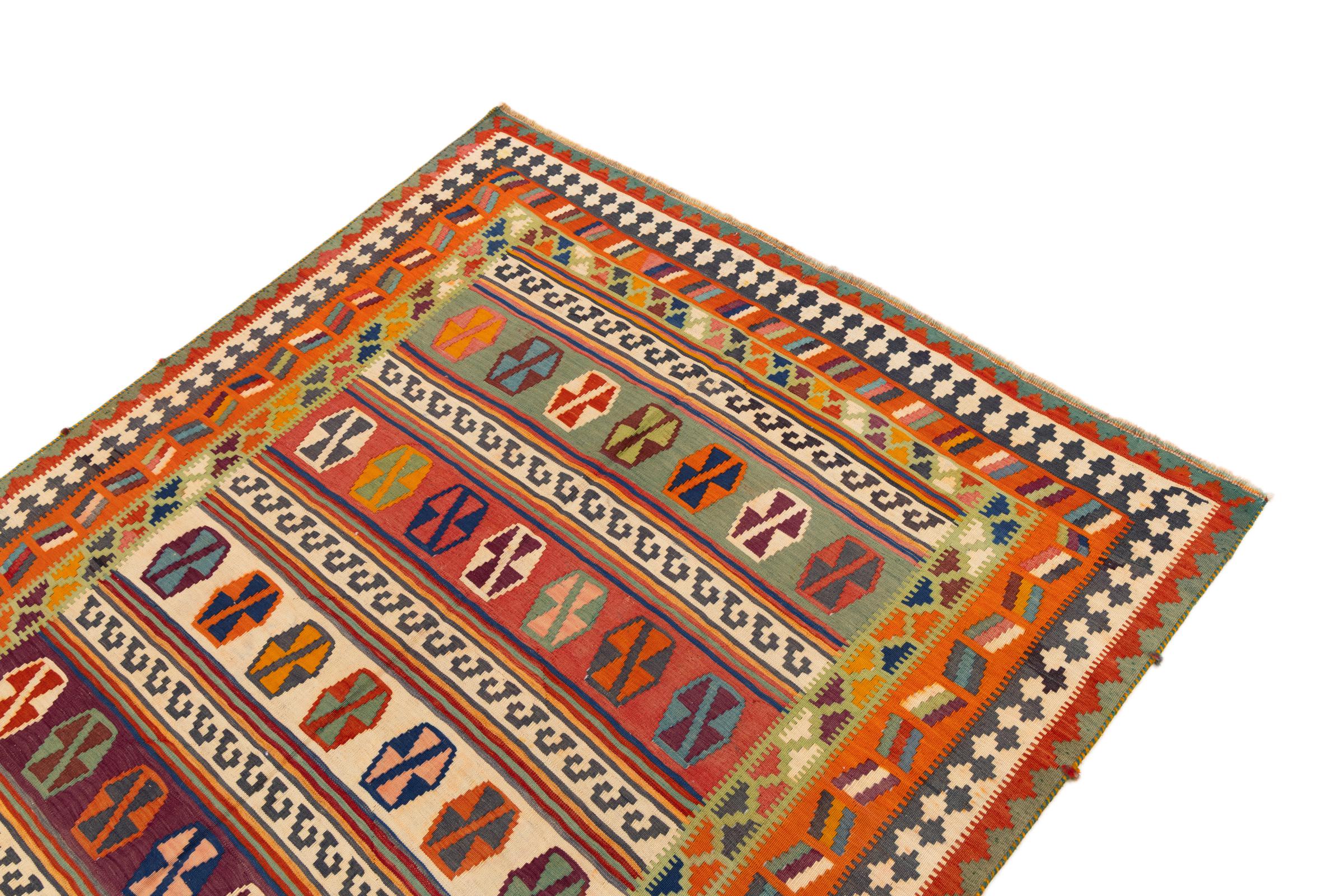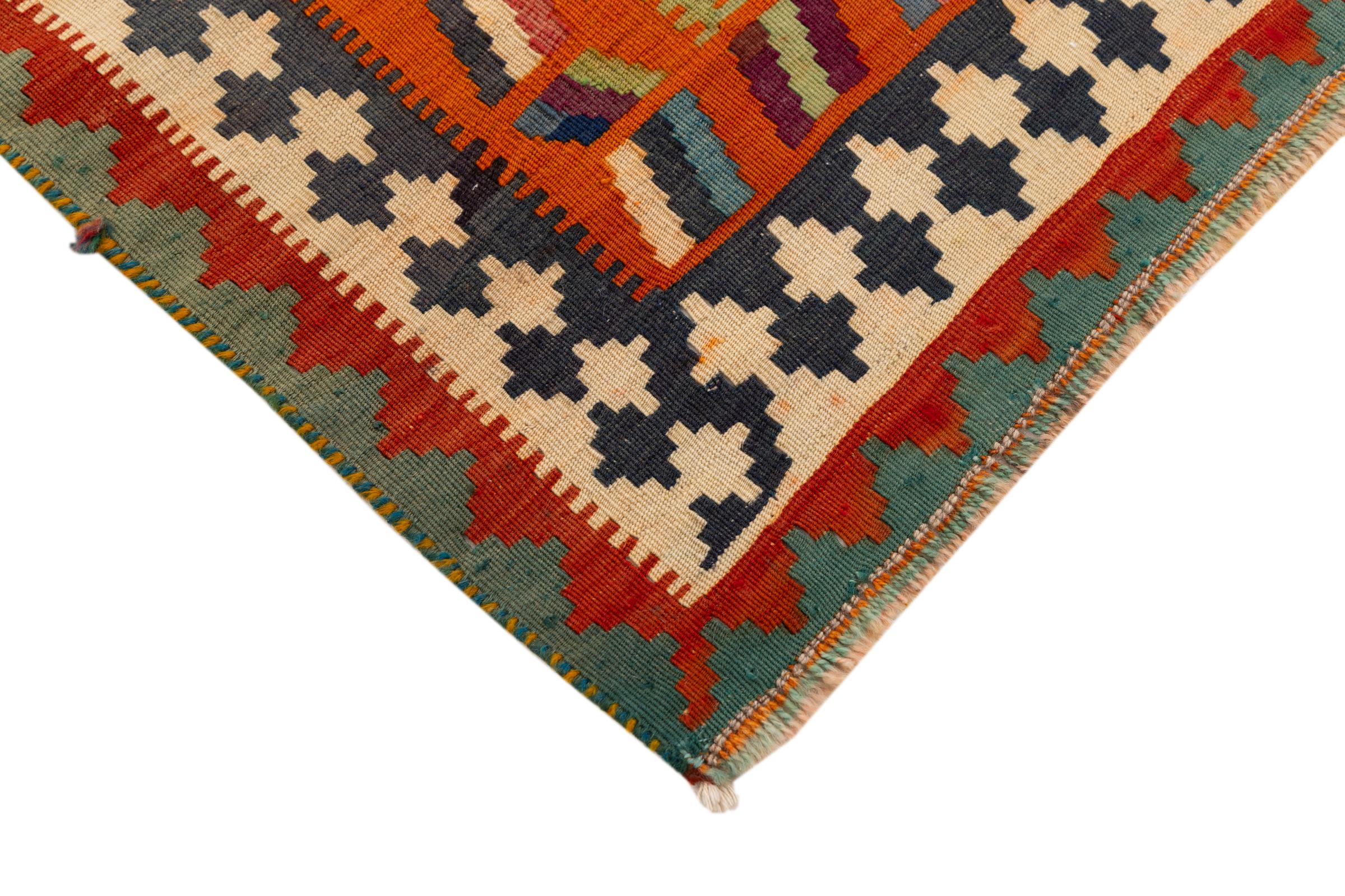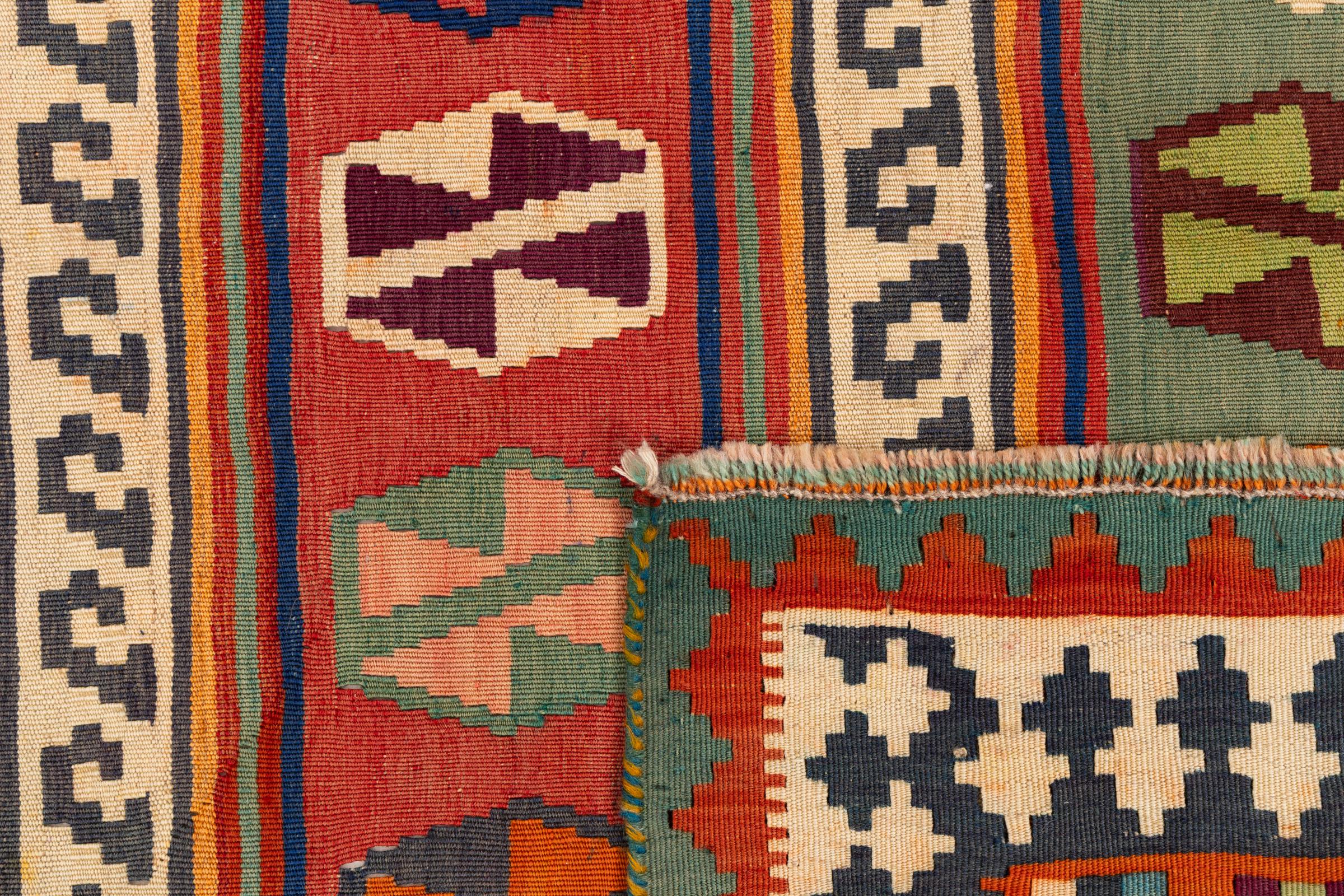This rug was made as a flat weave by hand on a loom. Flatweave is the term used to describe rugs that have no pile. As the name promises, these rugs are woven and not knotted. This results in a flat rug with a structured surface. Flatweaves are not as soft and usually thinner than knotted rugs. At the same time they are much less complex to manufacture and can usually be laid out from both sides (front and back). Their patterns are usually geometric, which is determined by the fabric.