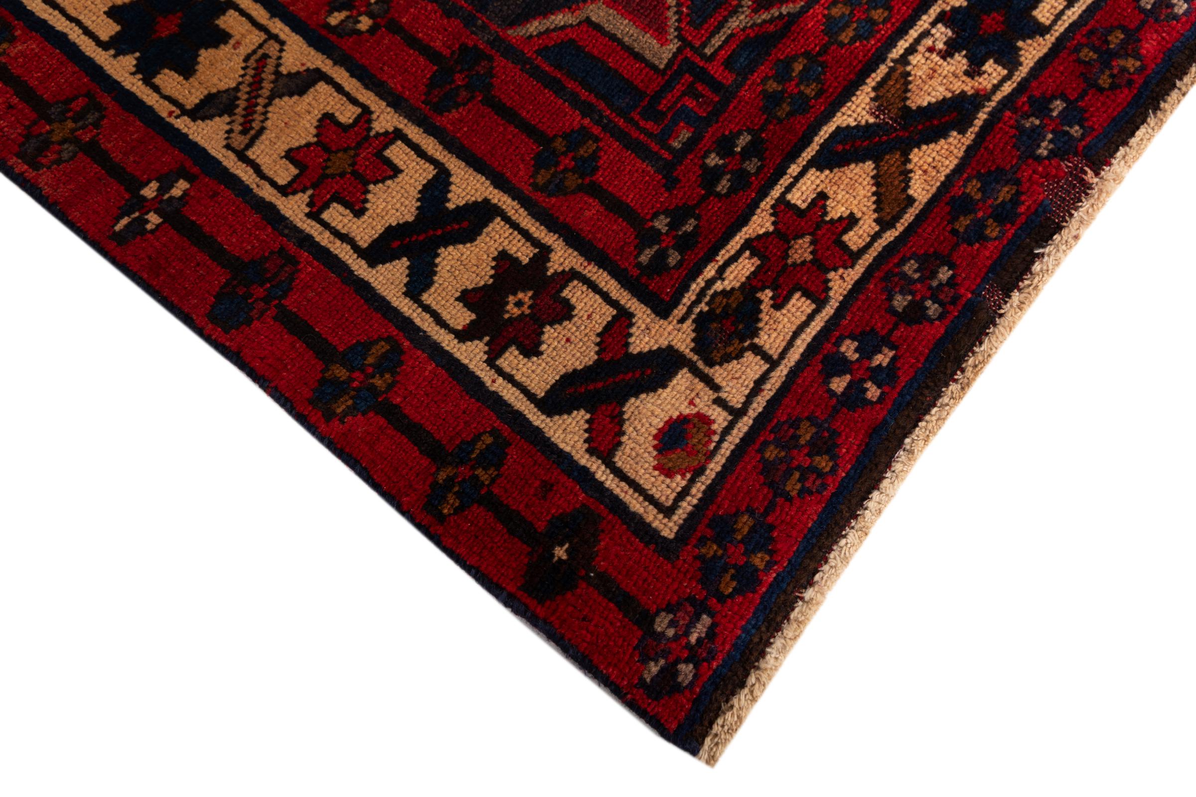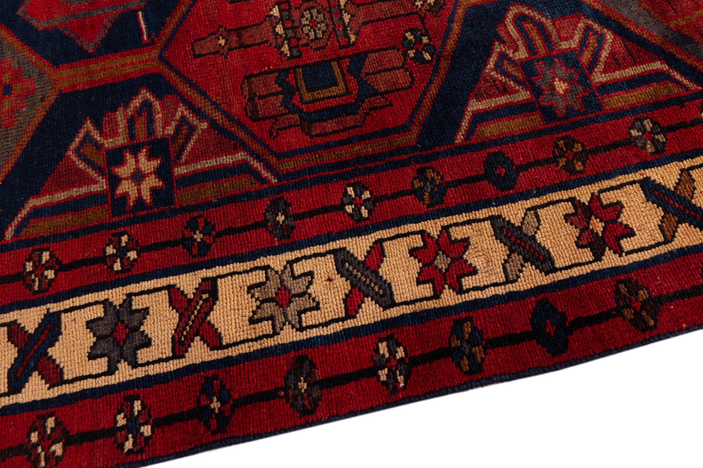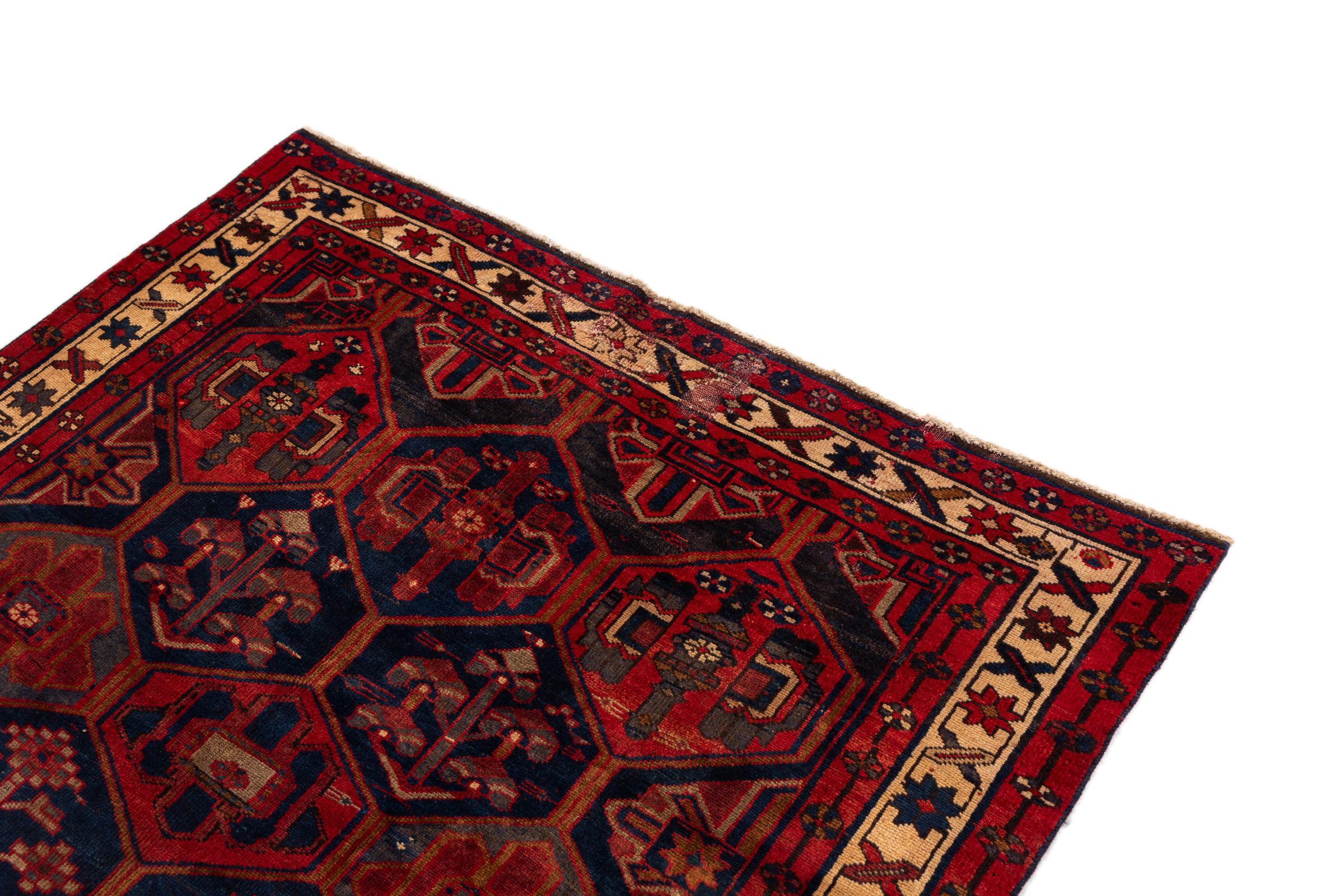 This carpet belongs to the village and nomadic carpets from Iran, the former Persia. This kind of carpets is hand knotted in smaller towns and villages in ancient tradition. Even nomads still knot Persian carpets in the open air. The carpets are knotted without a draft and entirely from memory. They are characterized by classical ornaments arranged in linear and geometric patterns. Thanks to their cultural and traditional origins, these rugs possess a unique character that embodies ancient Persia.