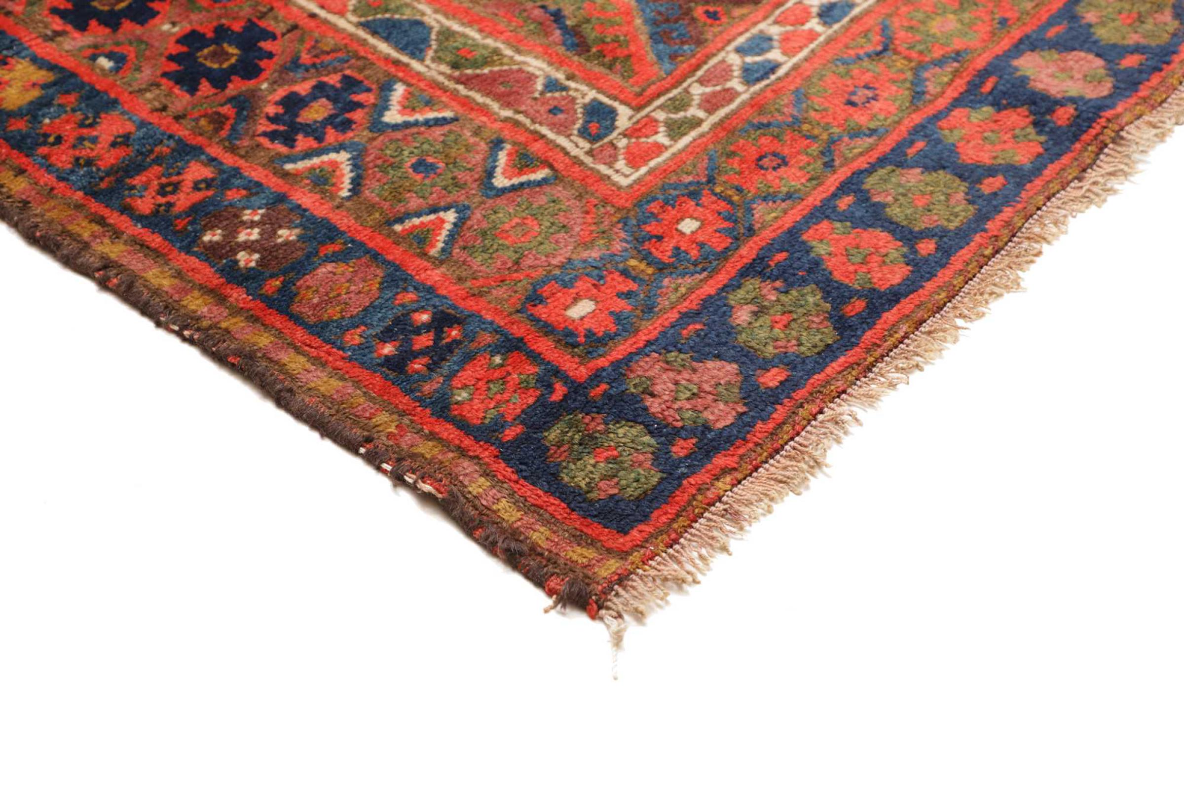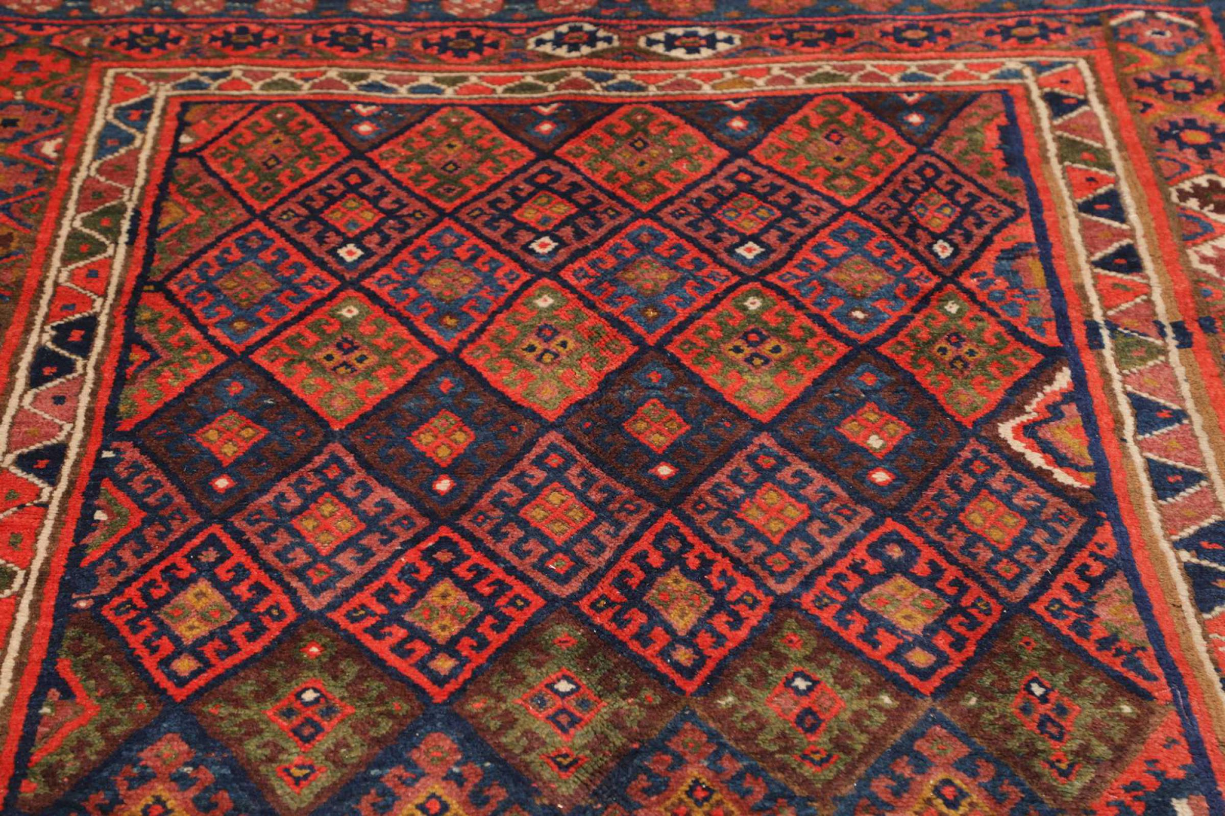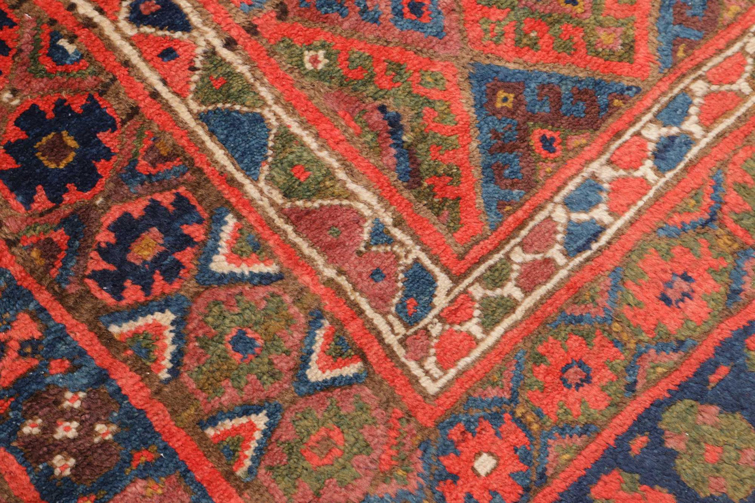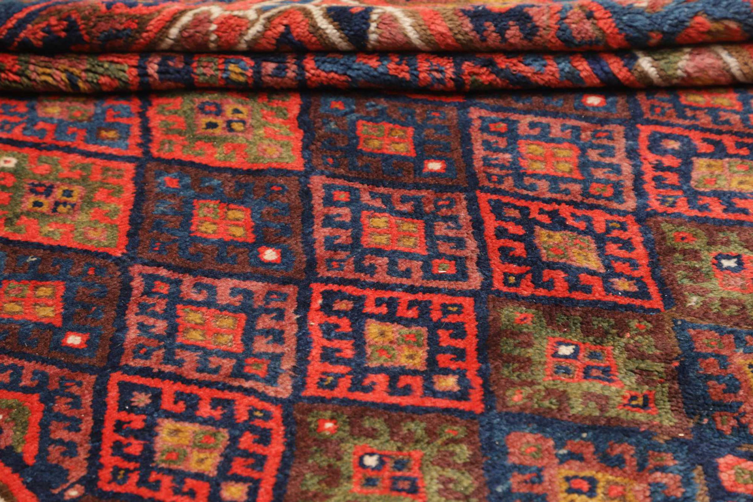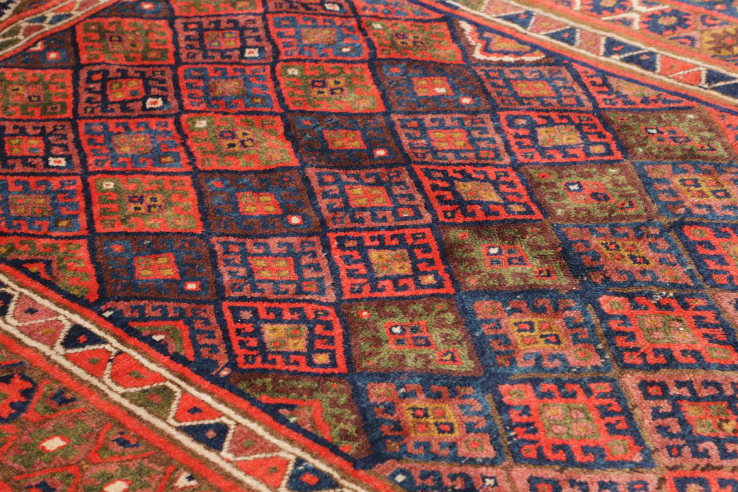 This carpet belongs to the village and nomadic carpets from Iran, the former Persia. This kind of carpets is hand knotted in smaller towns and villages in ancient tradition. Even nomads still knot Persian carpets in the open air. The carpets are knotted without a draft and entirely from memory. They are characterized by classical ornaments arranged in linear and geometric patterns. Thanks to their cultural and traditional origins, these rugs possess a unique character that embodies ancient Persia.