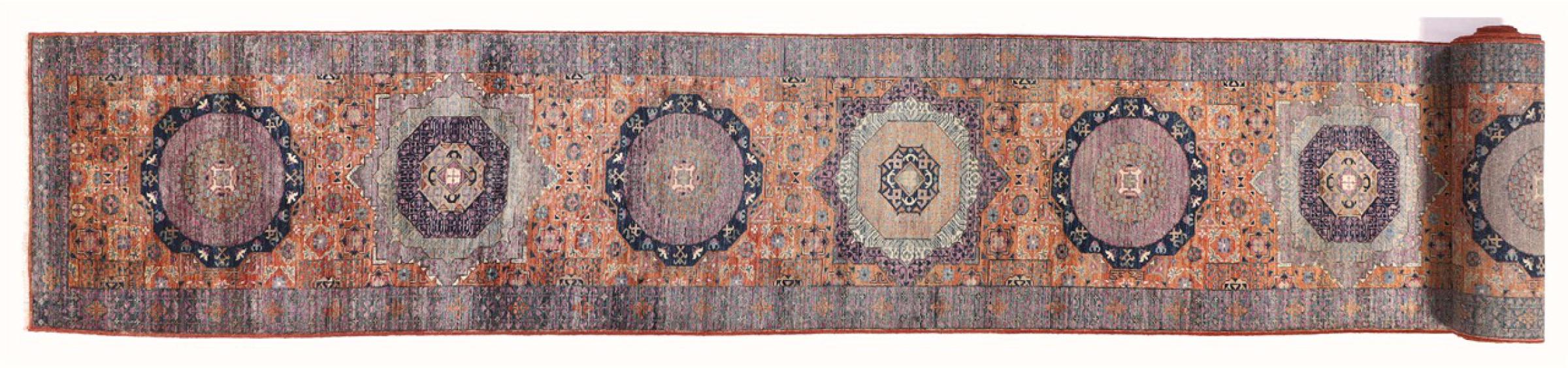 This Mamluk rug has been knotted by hand in traditional patterns and ornaments as known from the ancient rugs from Egypt. In the 15th century this type of rug evolved from the Mamluks. The rug has beautiful colors and consists of natural material.