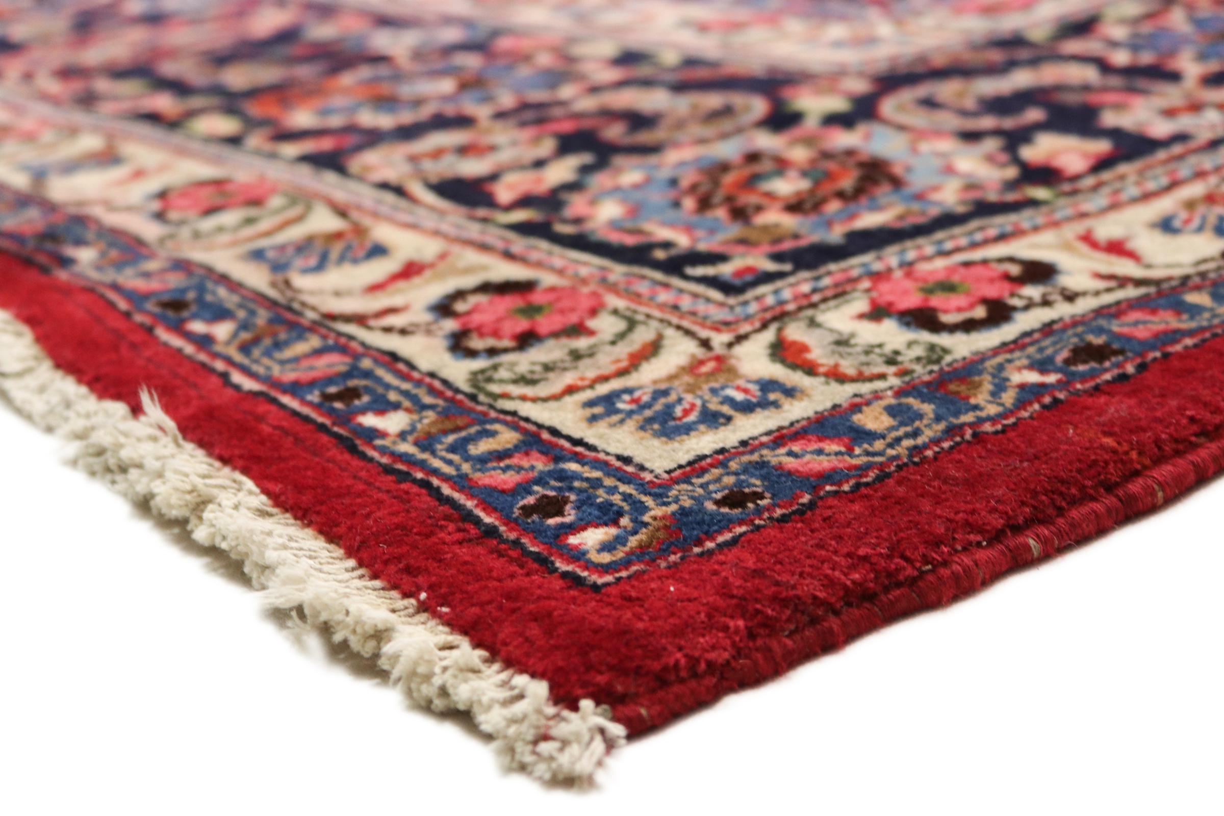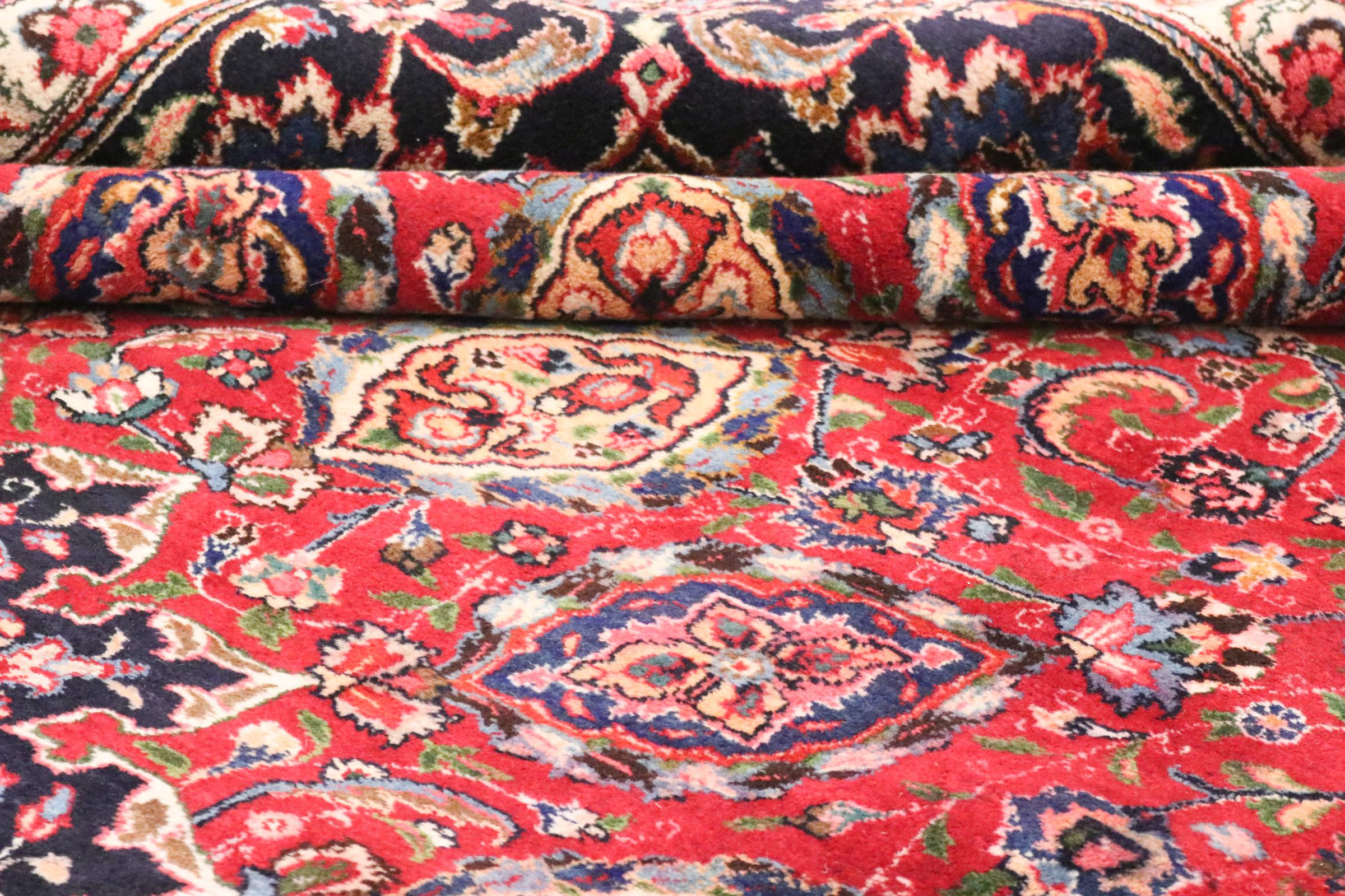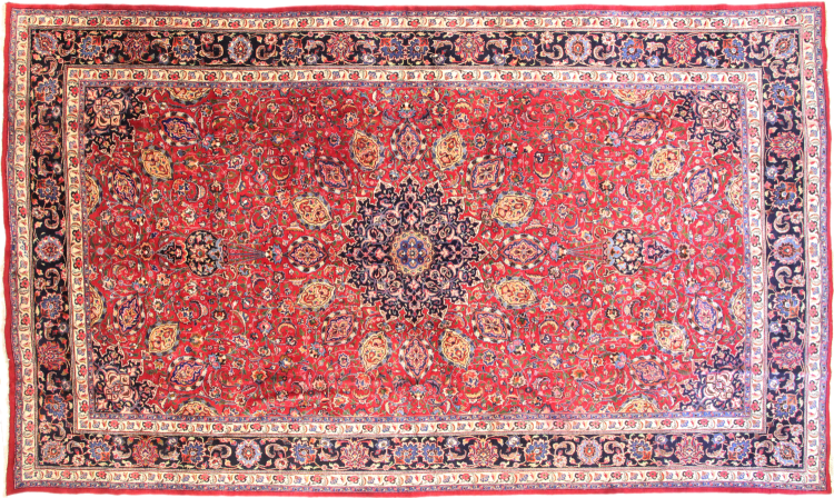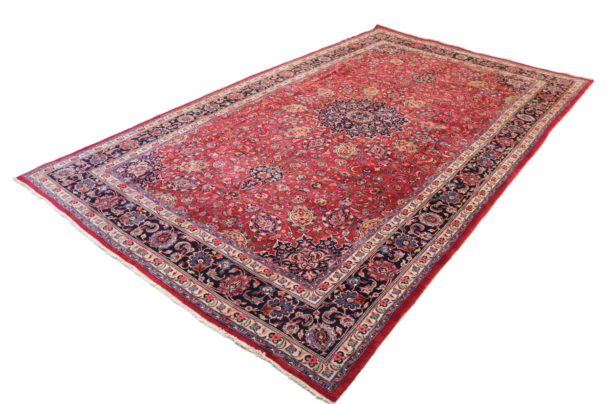 Mashhad is a city of millions in eastern Iran, counted among Islam's holiest cities with a large number of pilgrims visiting the tomb of the eighth Imam. Hand-knotted Persian rugs from Mashhad are typically oversized, often featuring a central medallion and dark color tones.