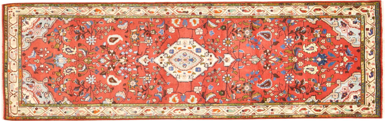 Rug ID: 300930001659663 Size: 8'9"x2'8" ft Thickness: ap. 0.47 in Knot density: 82 - 103 / square inch Manufacturing: Knotted by hand Pile: Handspun wool Warp: Cotton Origin: Persia / Iran Age: New Weight: ap. 18 lb Also know as Meriban In stock: Unique - Only 1 in stock