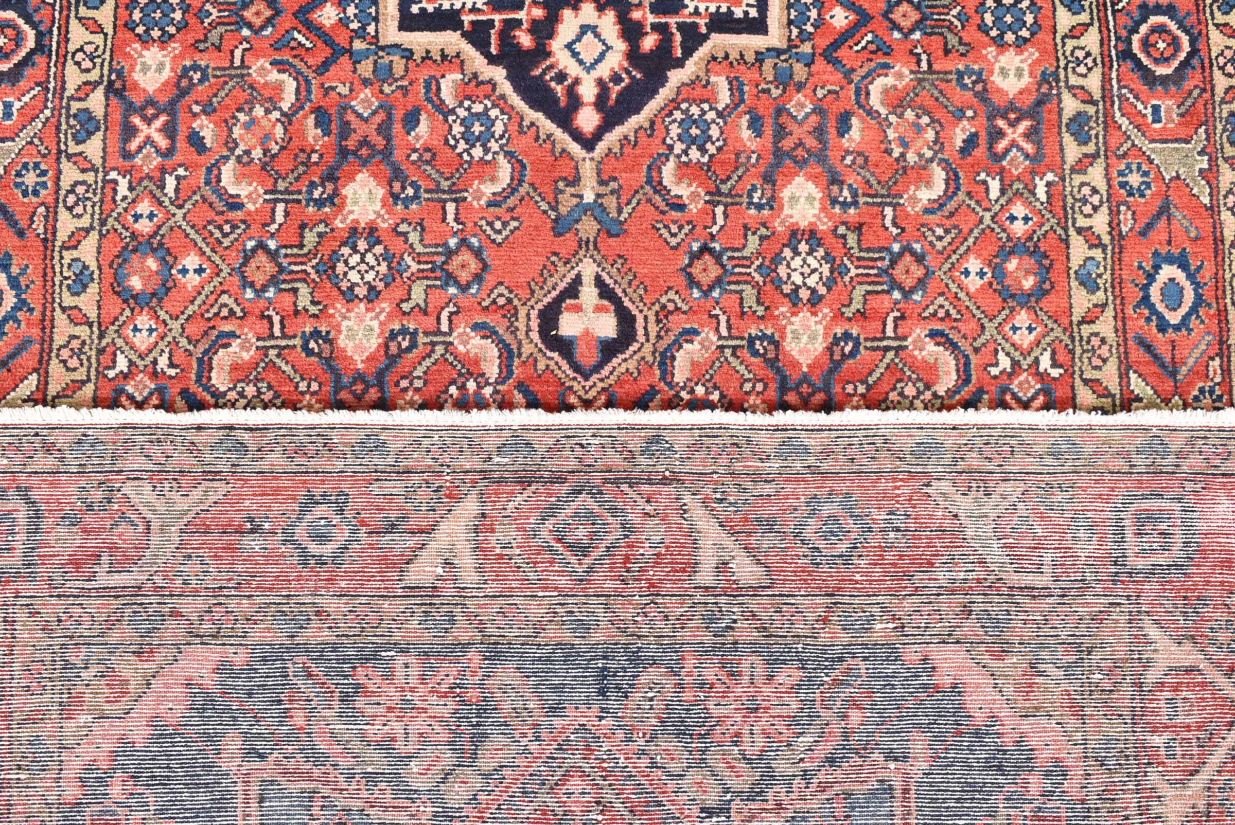 This carpet belongs to the village and nomadic carpets from Iran, the former Persia. This kind of carpets is hand knotted in smaller towns and villages in ancient tradition. Even nomads still knot Persian carpets in the open air. The carpets are knotted without a draft and entirely from memory. They are characterized by classical ornaments arranged in linear and geometric patterns. Thanks to their cultural and traditional origins, these rugs possess a unique character that embodies ancient Persia.