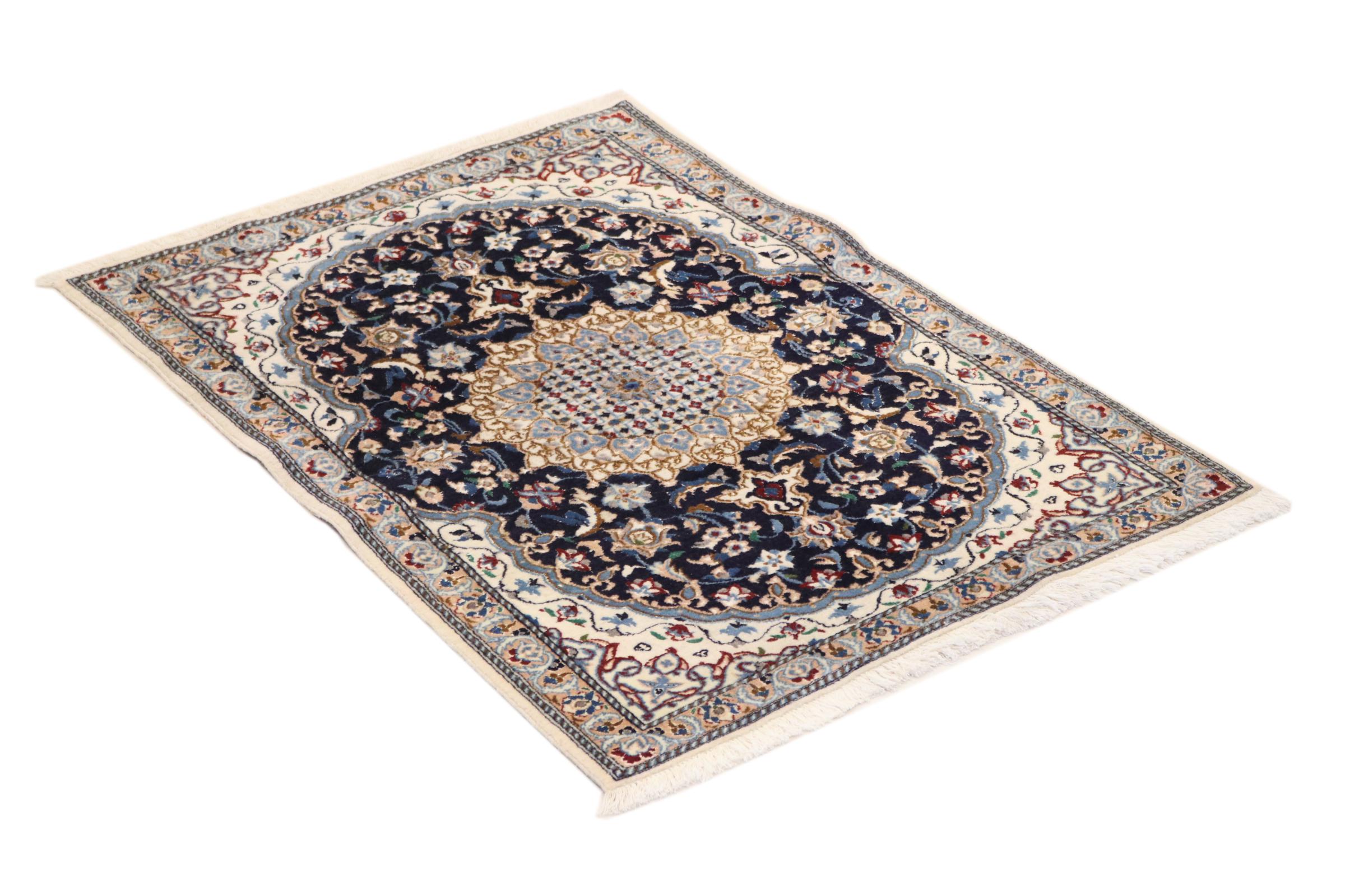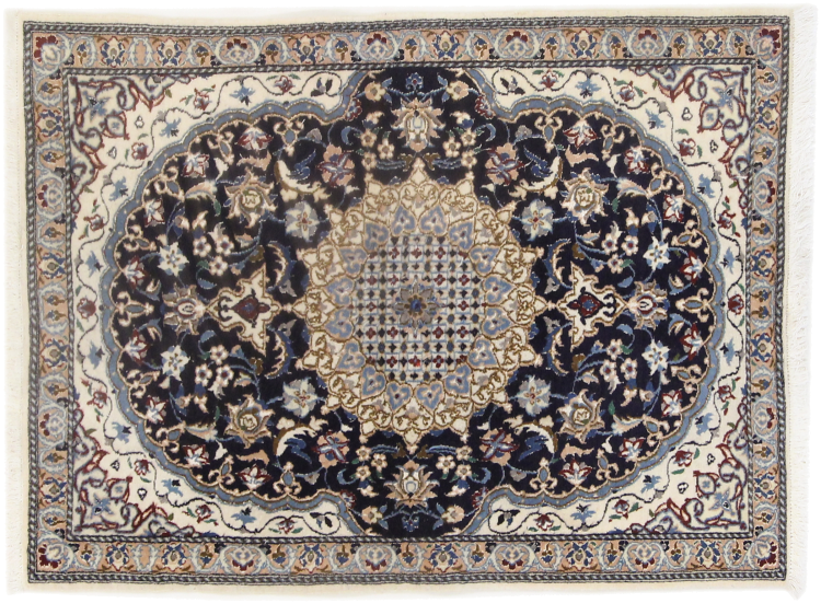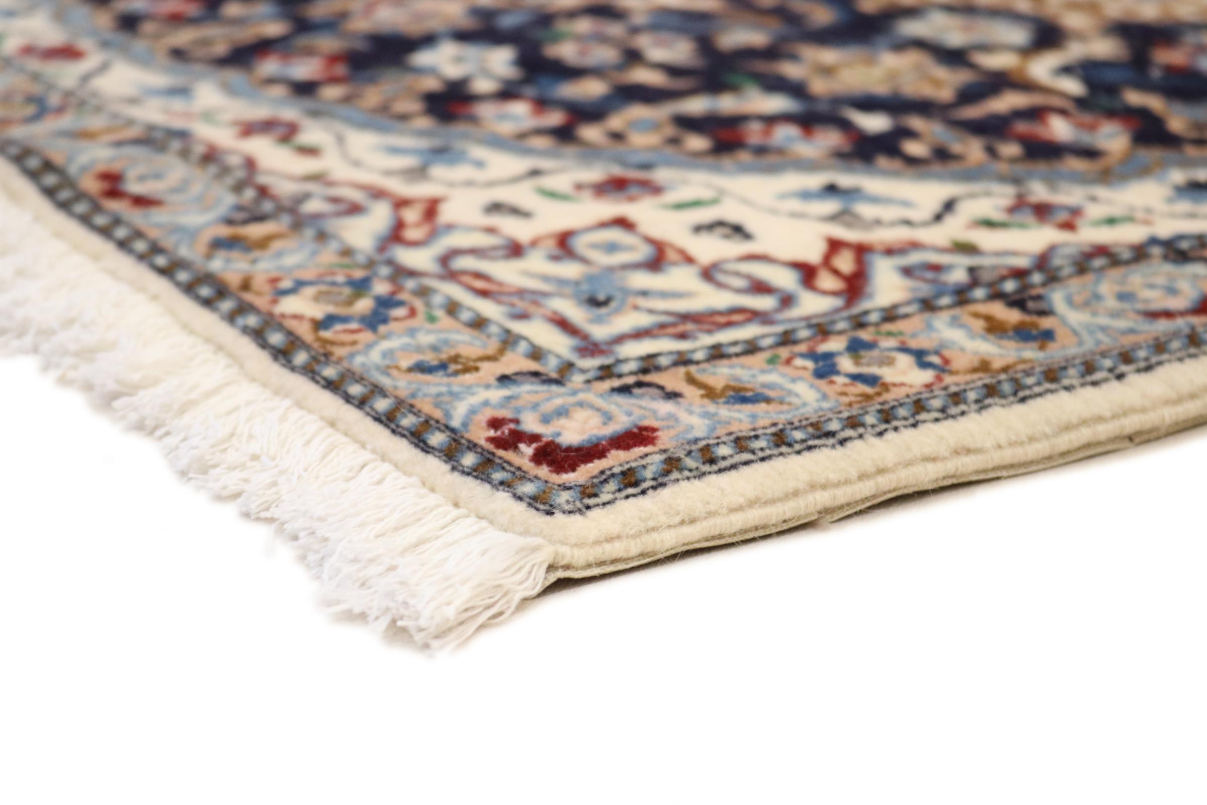 Rugs from the city of Nain, located near one of Iran's largest deserts, are among the most renowned Persian rugs in the world. Their typical design is unmistakable, featuring floral ornaments, a central medallion, and tones of beige, red, or blue. Thanks to their designations of 4La, 6La, 9La, and 12La, the fineness of a Nain rug can be easily identified at a glance. The rule is, the lower the "La" number, the higher the knot density and thus the finer the rug.