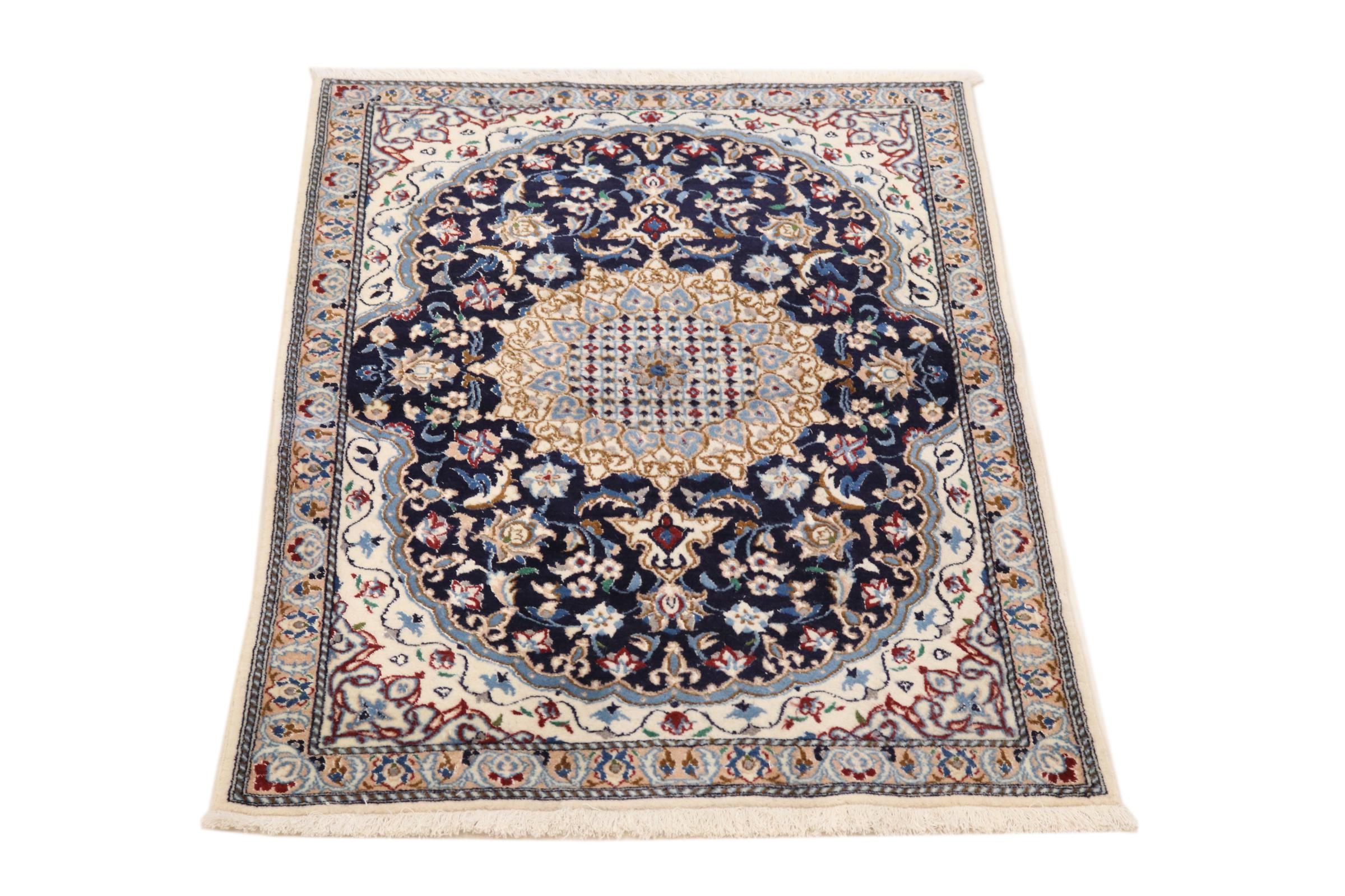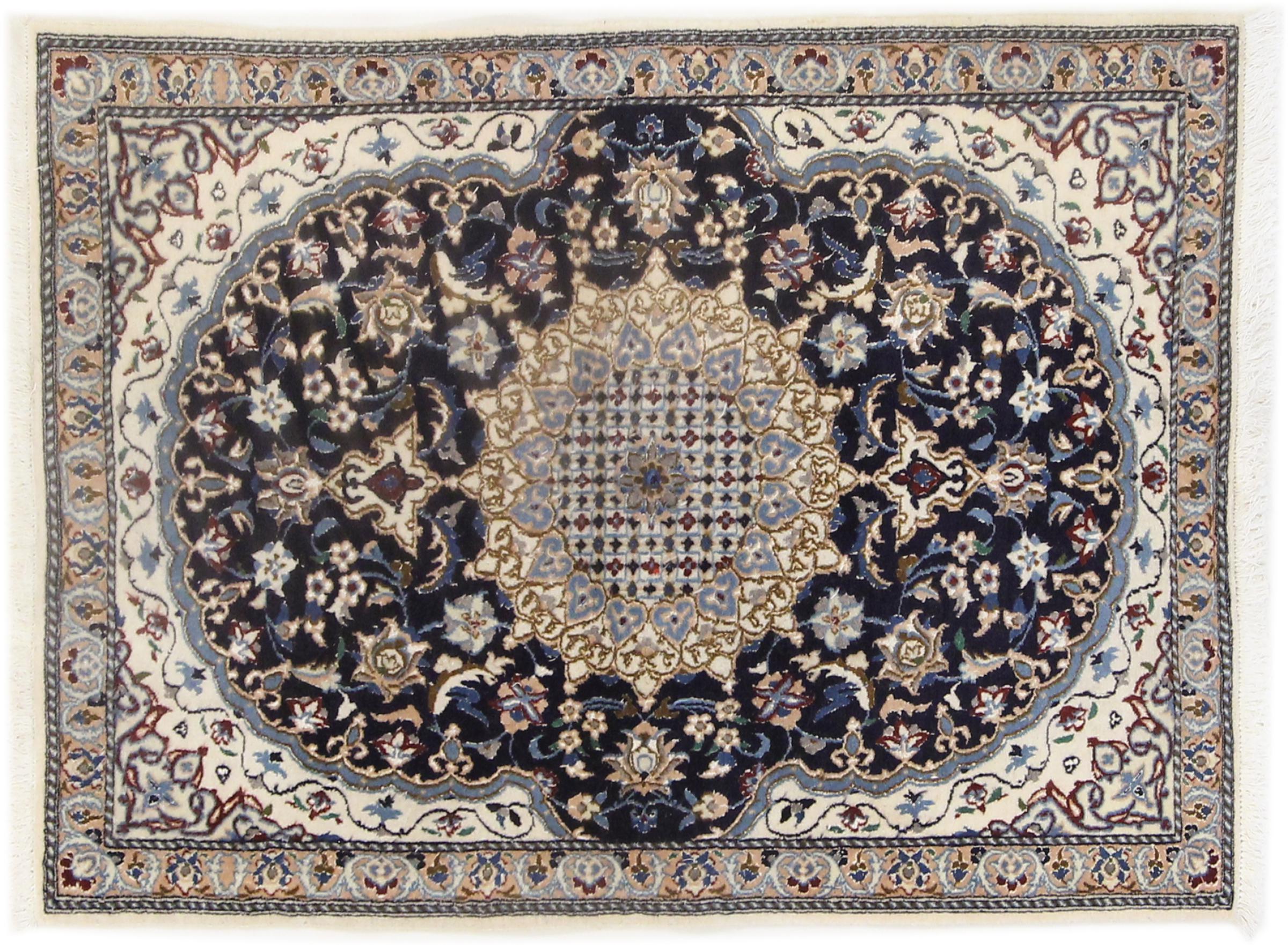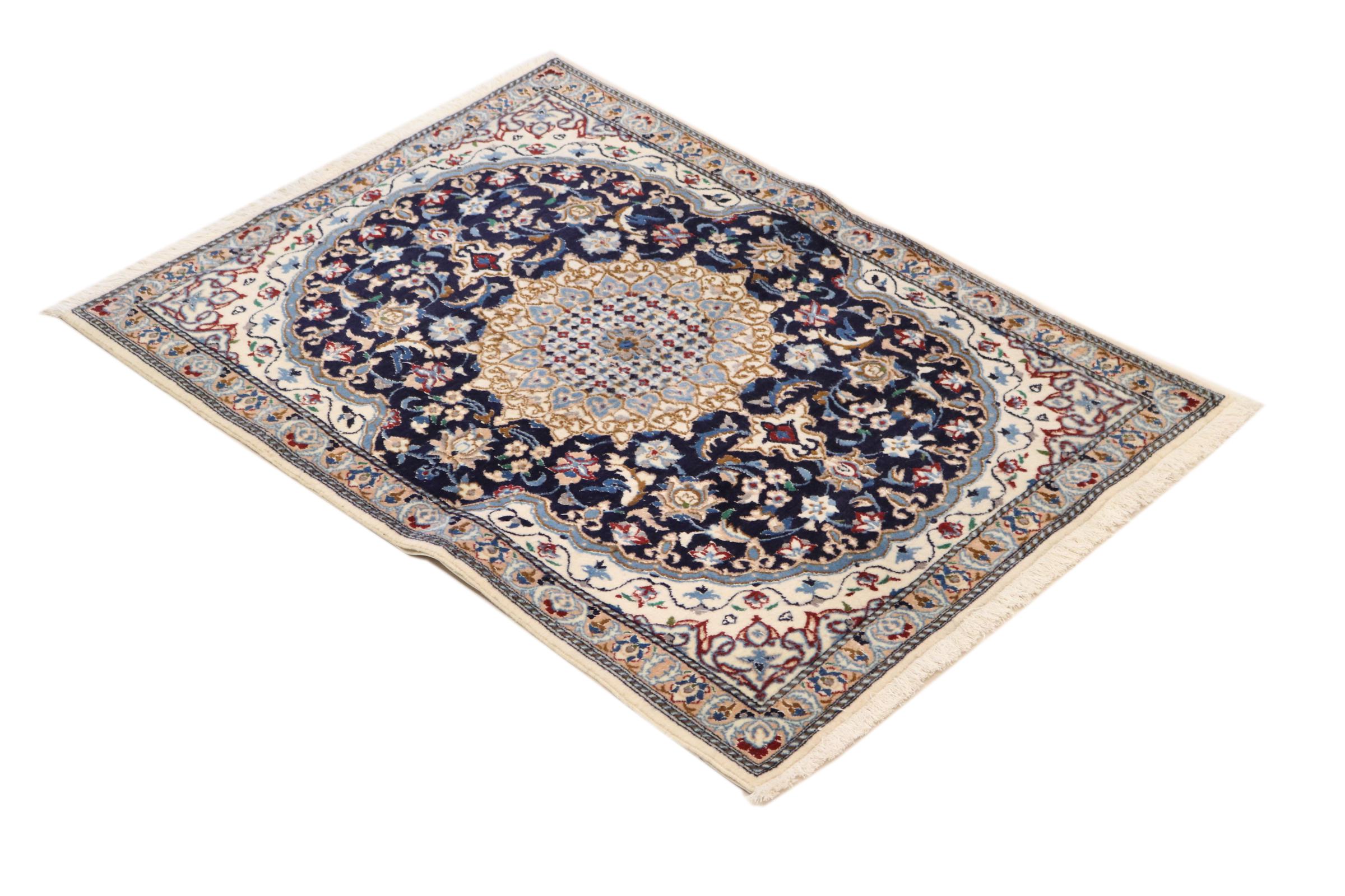 Rugs from the city of Nain, located near one of Iran's largest deserts, are among the most renowned Persian rugs in the world. Their typical design is unmistakable, featuring floral ornaments, a central medallion, and tones of beige, red, or blue. Thanks to their designations of 4La, 6La, 9La, and 12La, the fineness of a Nain rug can be easily identified at a glance. The rule is, the lower the "La" number, the higher the knot density and thus the finer the rug.