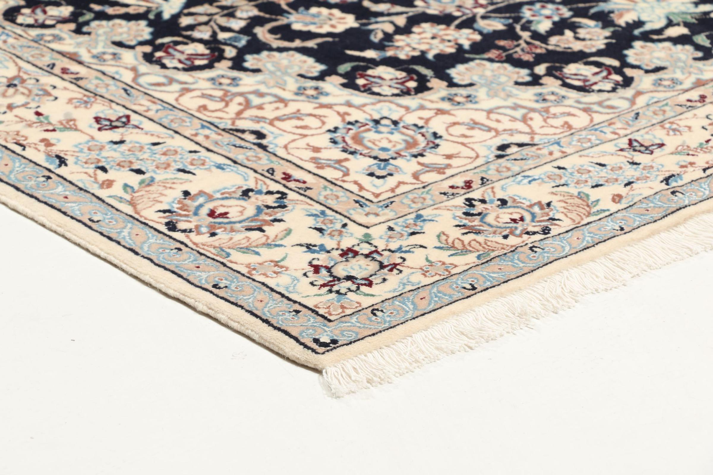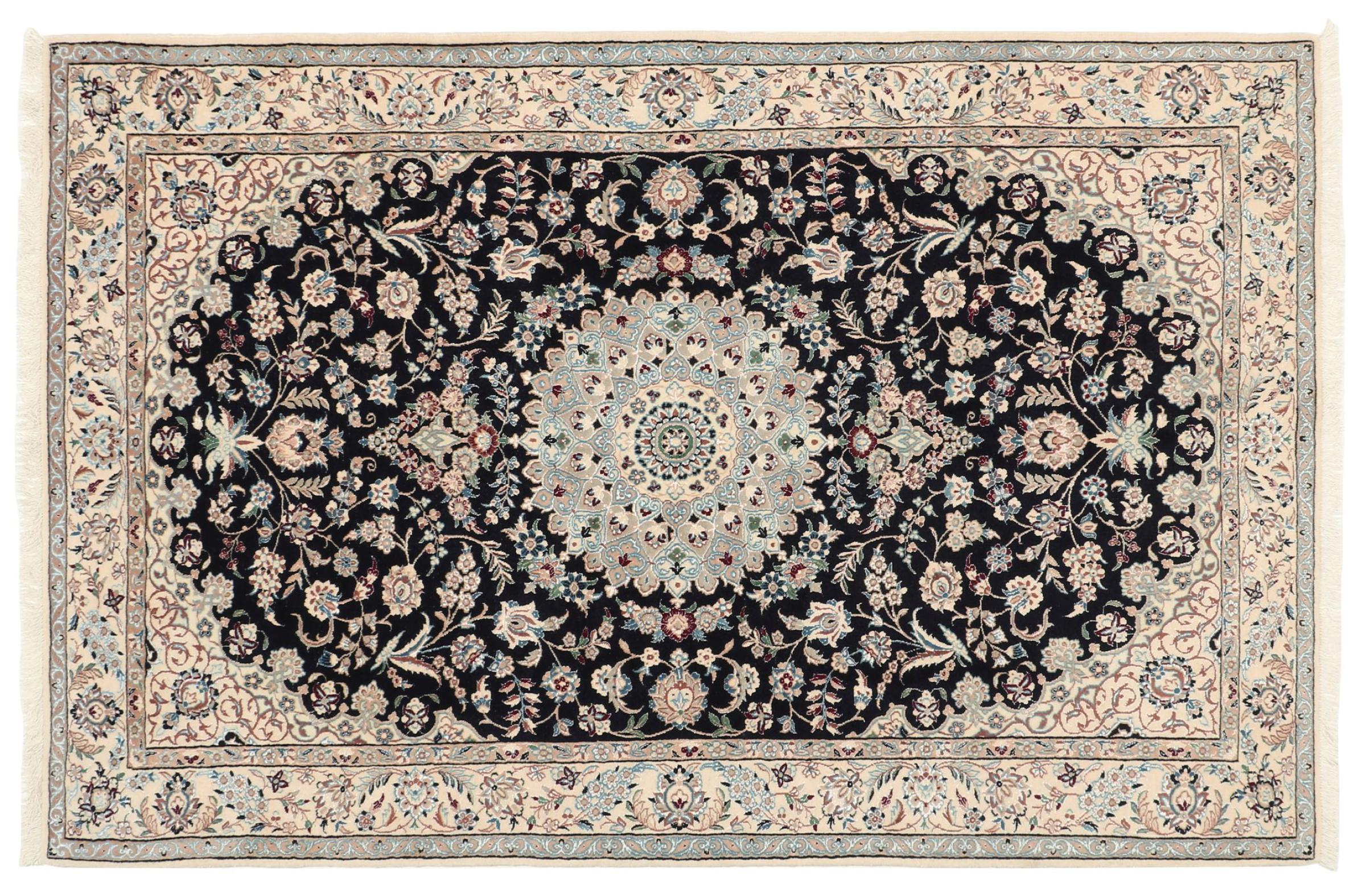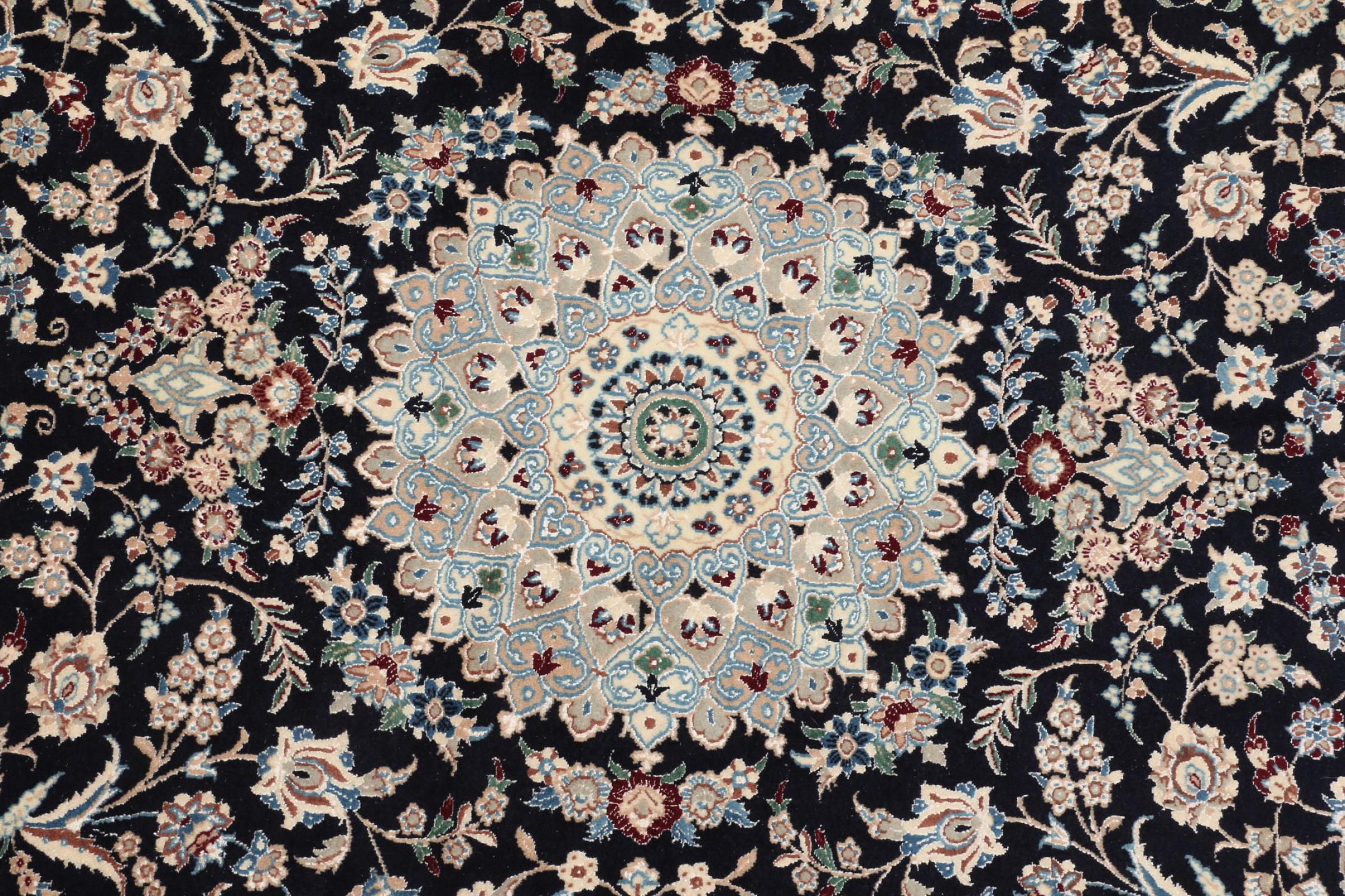 Rugs from the city of Nain, located near one of Iran's largest deserts, are among the most renowned Persian rugs in the world. Their typical design is unmistakable, featuring floral ornaments, a central medallion, and tones of beige, red, or blue. Thanks to their designations of 4La, 6La, 9La, and 12La, the fineness of a Nain rug can be easily identified at a glance. The rule is, the lower the "La" number, the higher the knot density and thus the finer the rug.