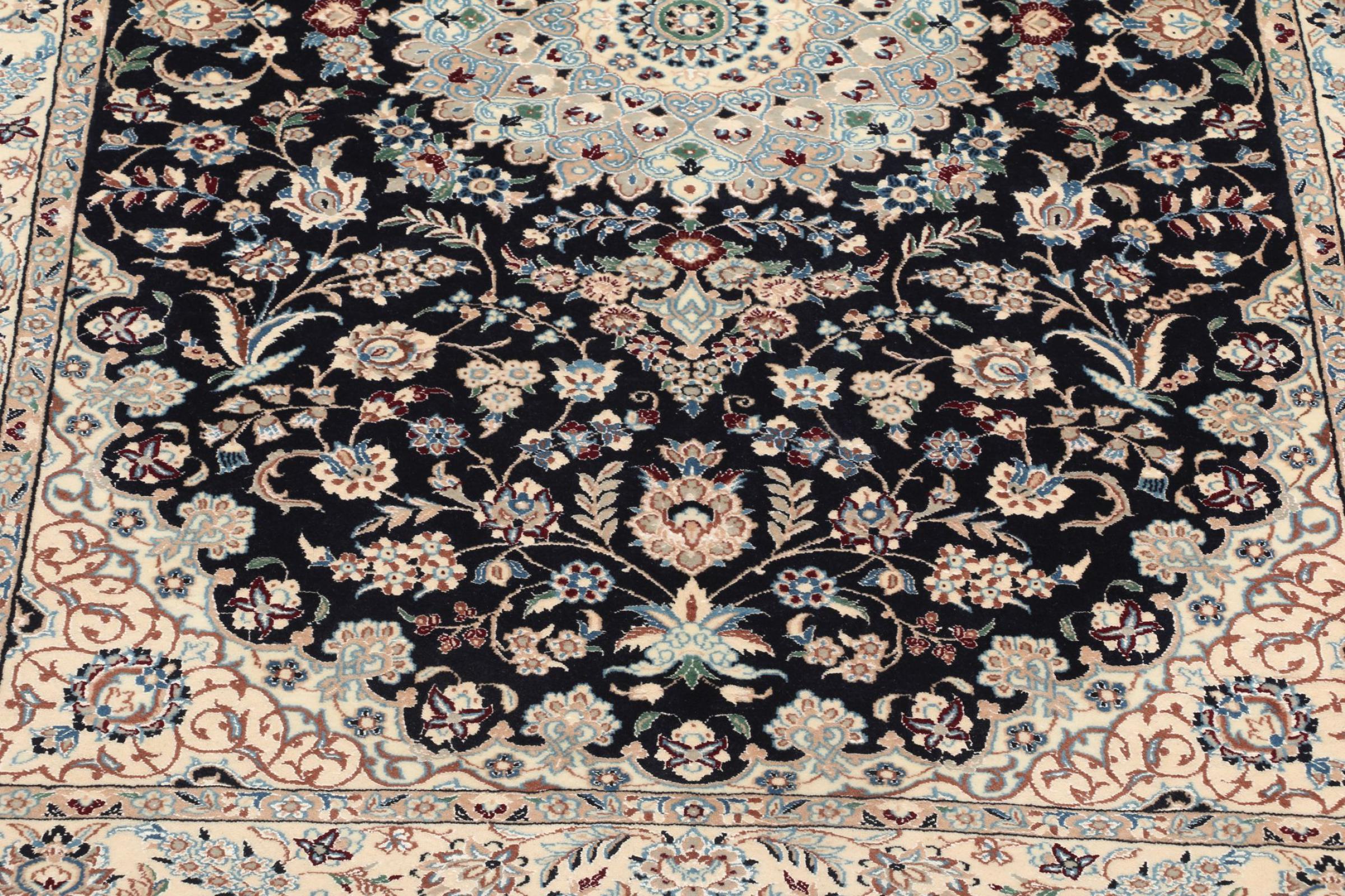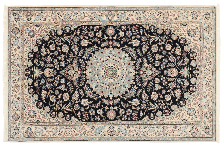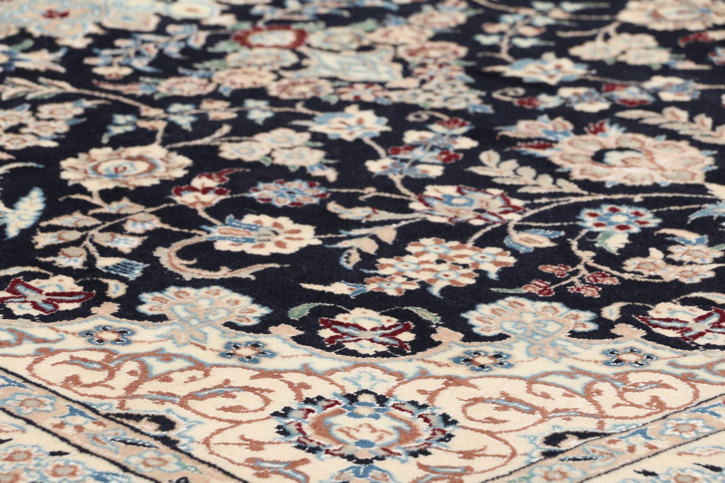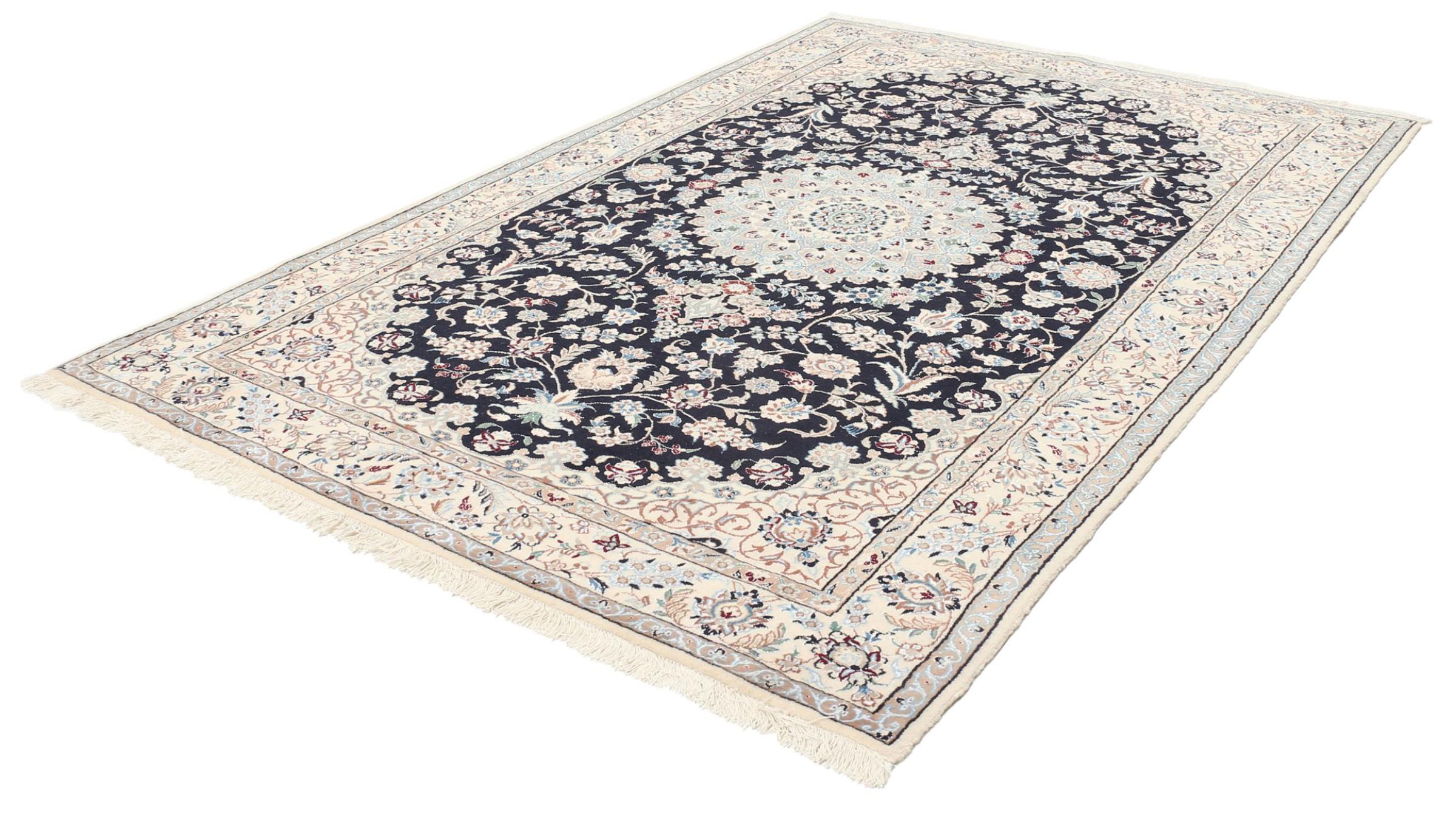 Rugs from the city of Nain, located near one of Iran's largest deserts, are among the most renowned Persian rugs in the world. Their typical design is unmistakable, featuring floral ornaments, a central medallion, and tones of beige, red, or blue. Thanks to their designations of 4La, 6La, 9La, and 12La, the fineness of a Nain rug can be easily identified at a glance. The rule is, the lower the "La" number, the higher the knot density and thus the finer the rug.