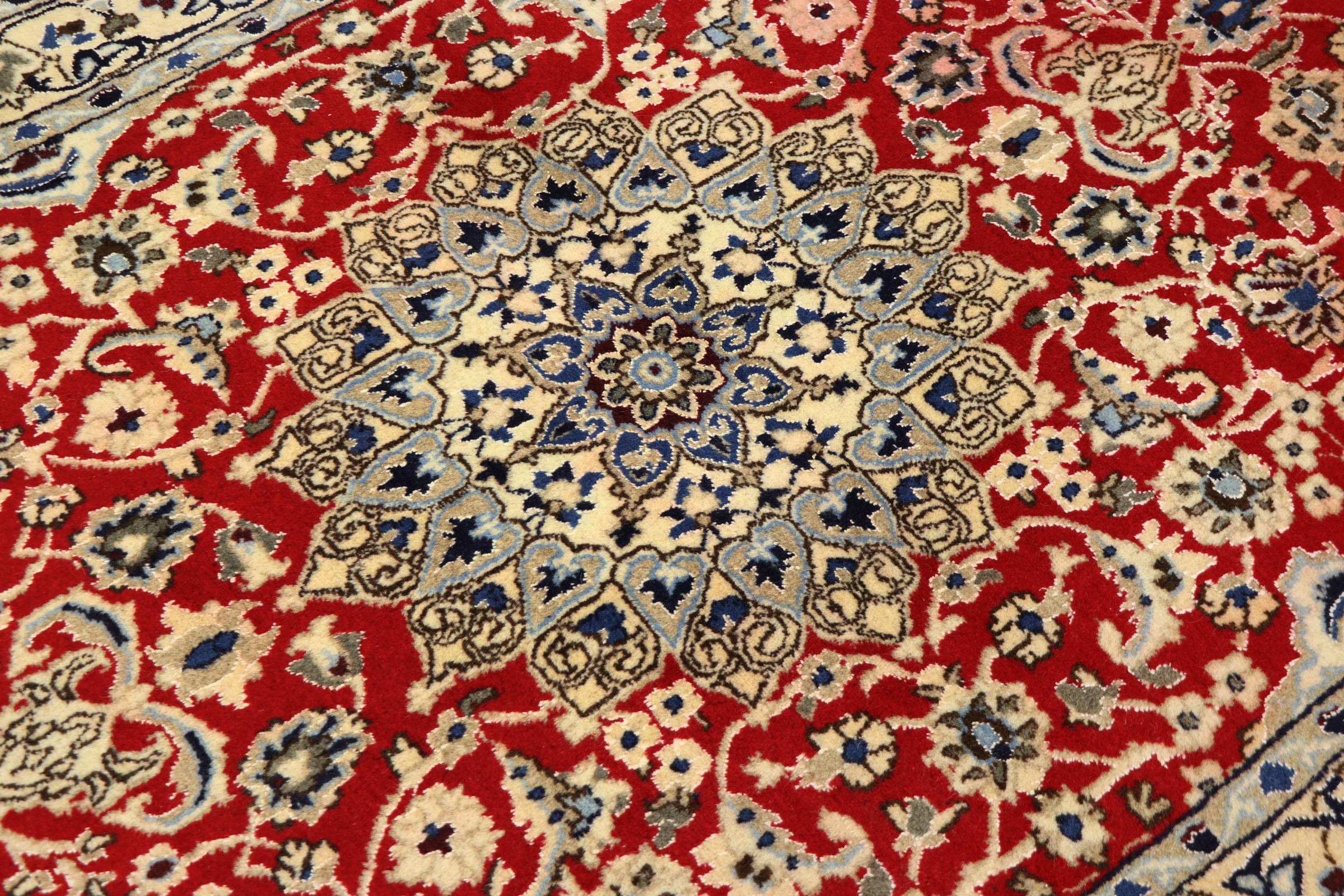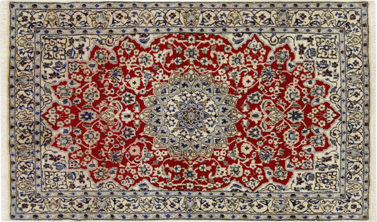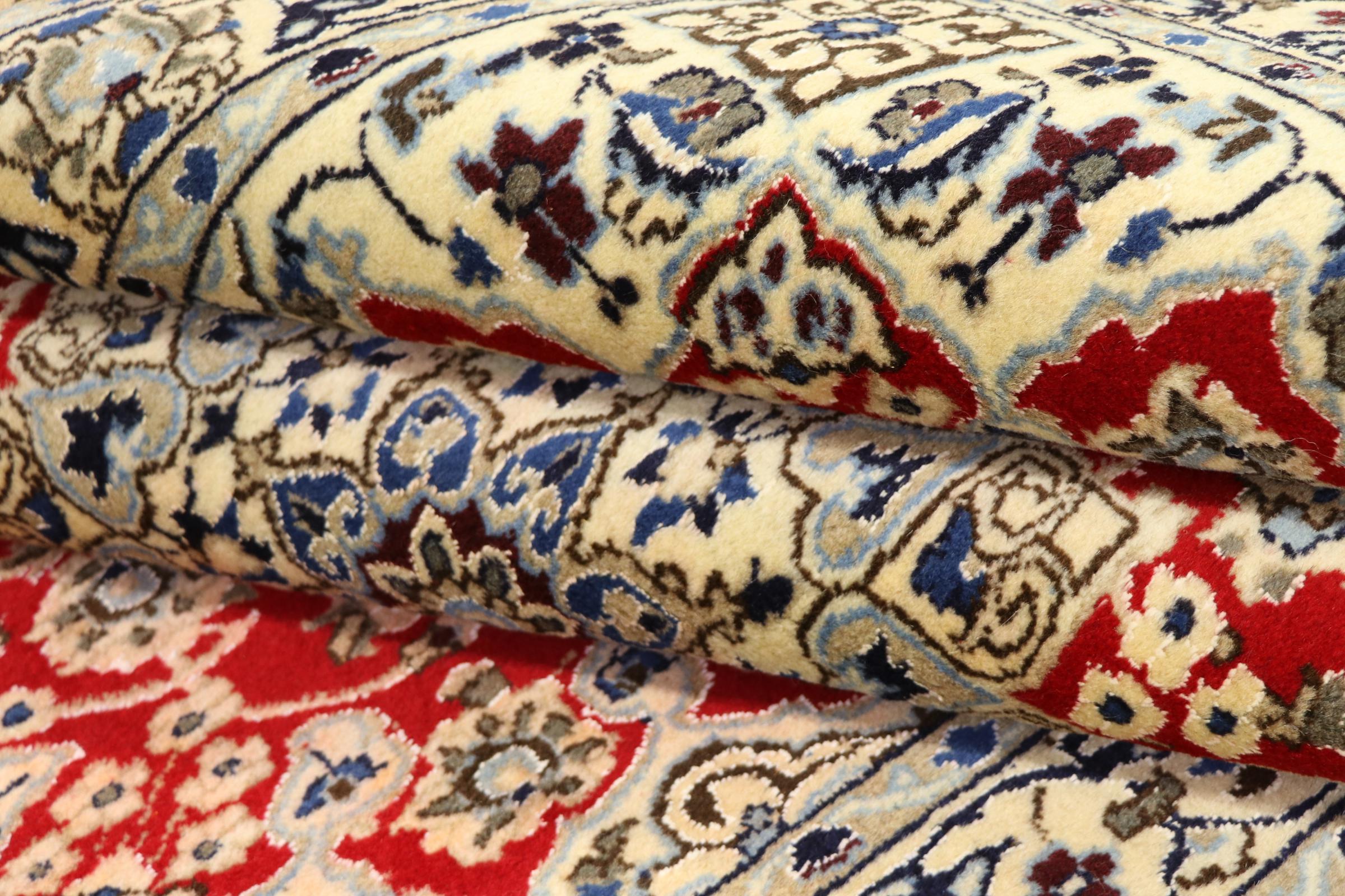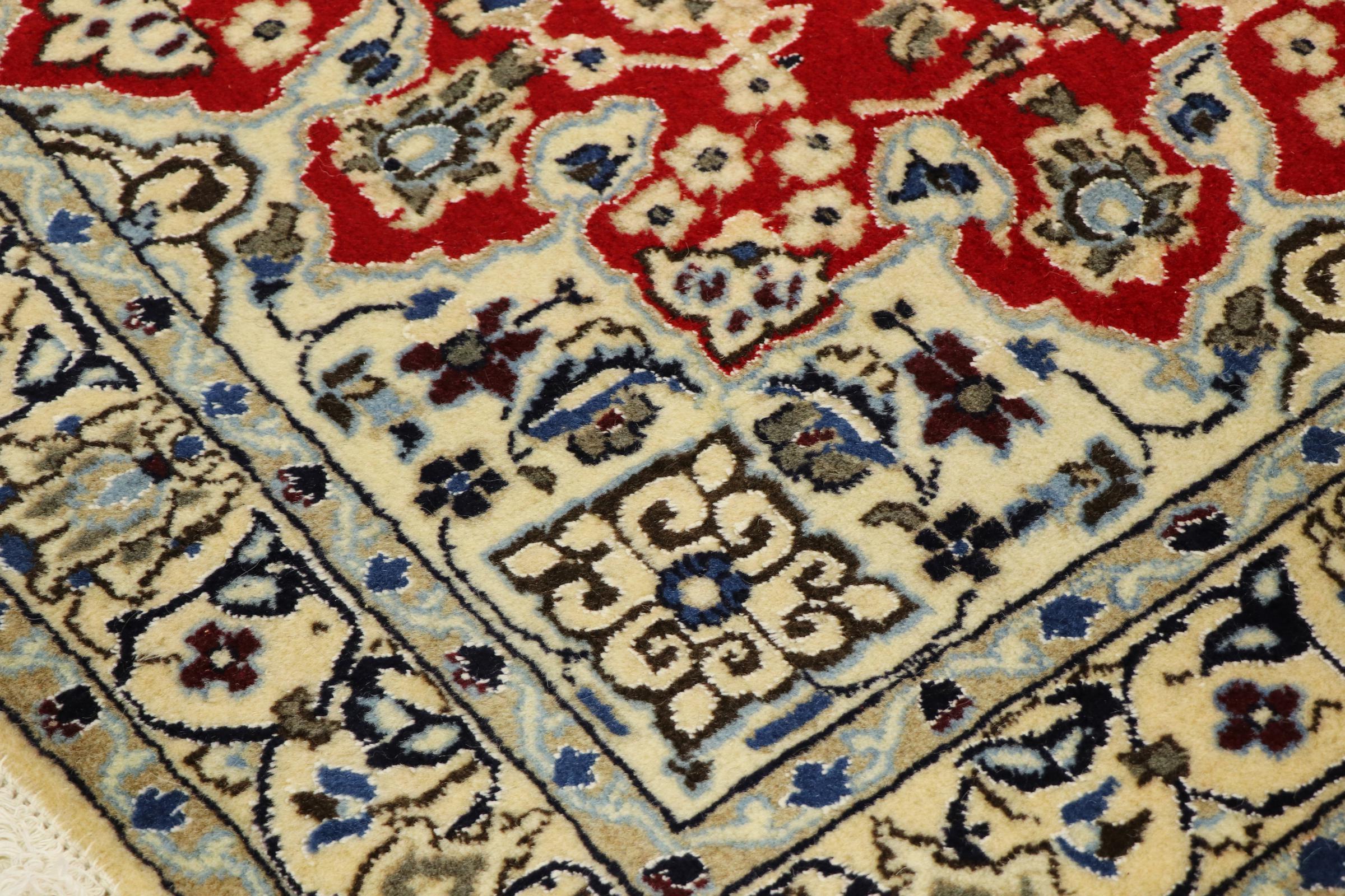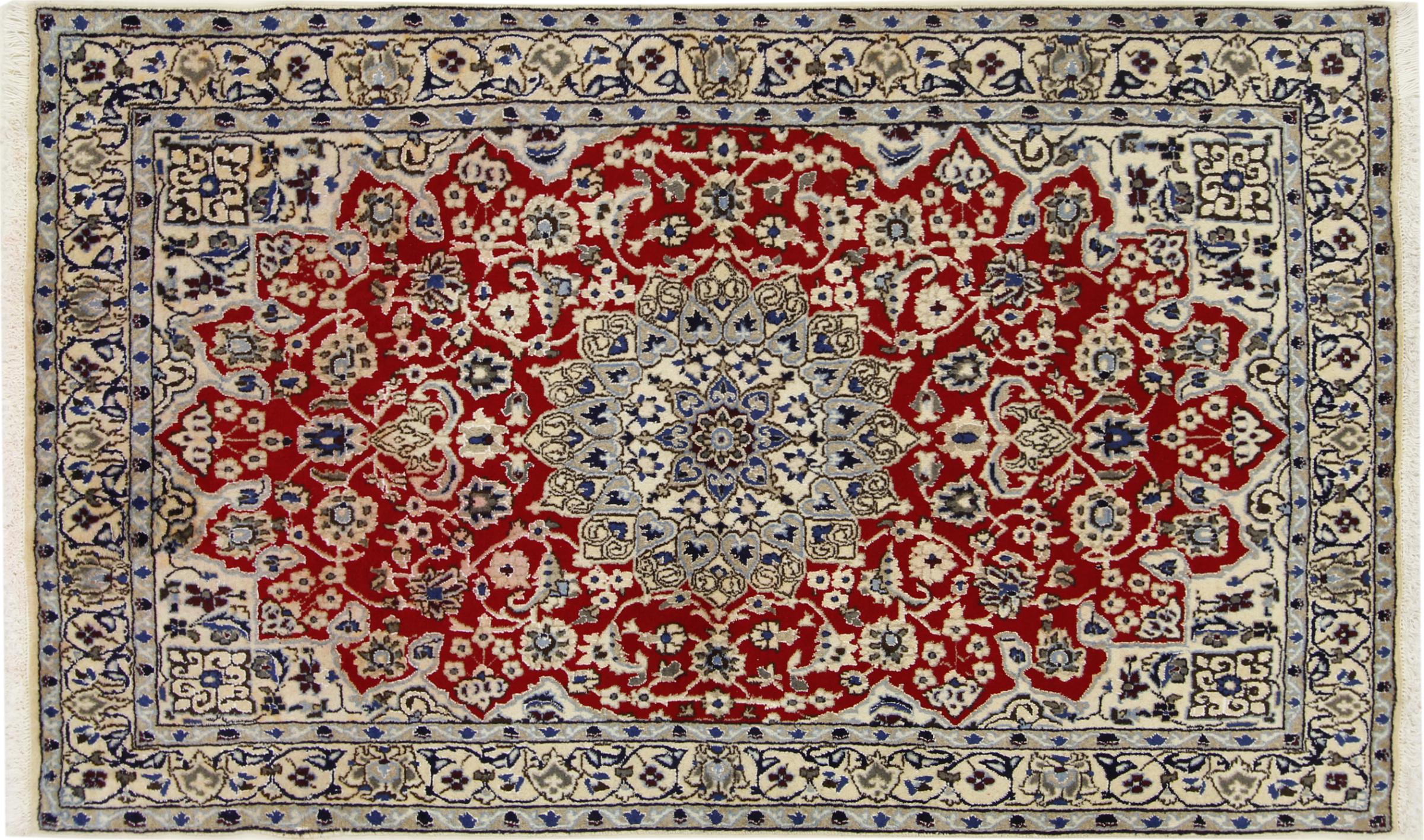 Rugs from the city of Nain, located near one of Iran's largest deserts, are among the most renowned Persian rugs in the world. Their typical design is unmistakable, featuring floral ornaments, a central medallion, and tones of beige, red, or blue. Thanks to their designations of 4La, 6La, 9La, and 12La, the fineness of a Nain rug can be easily identified at a glance. The rule is, the lower the "La" number, the higher the knot density and thus the finer the rug.