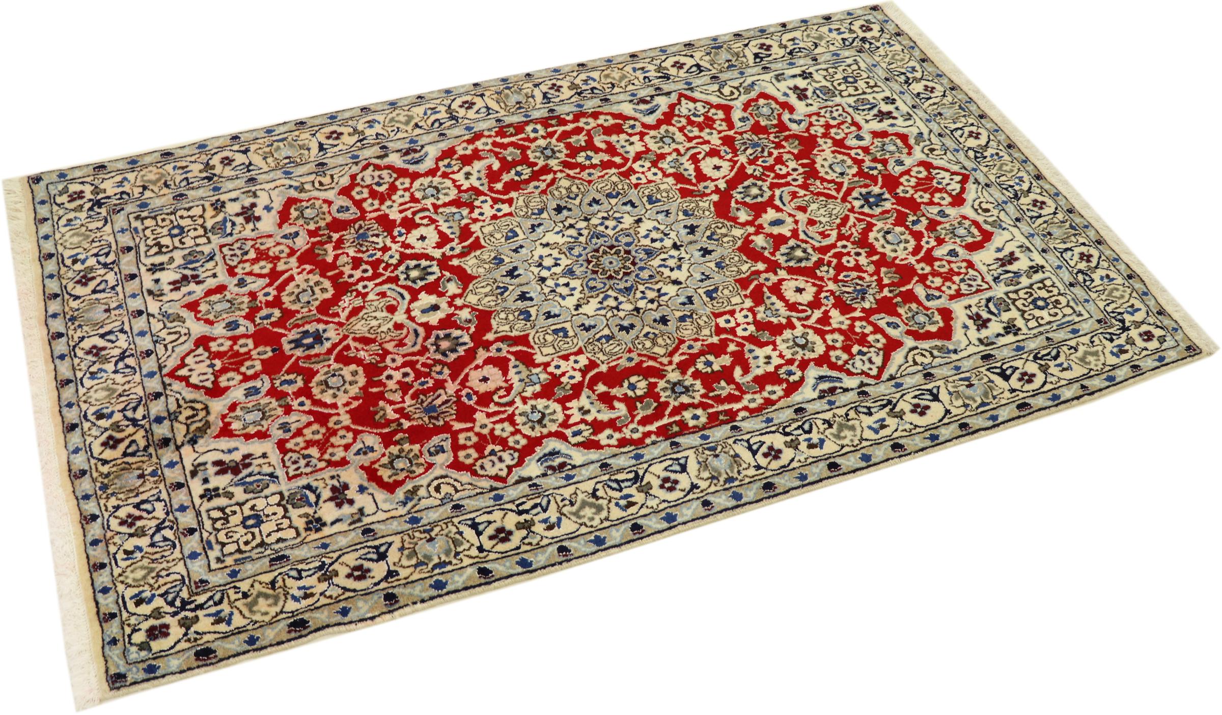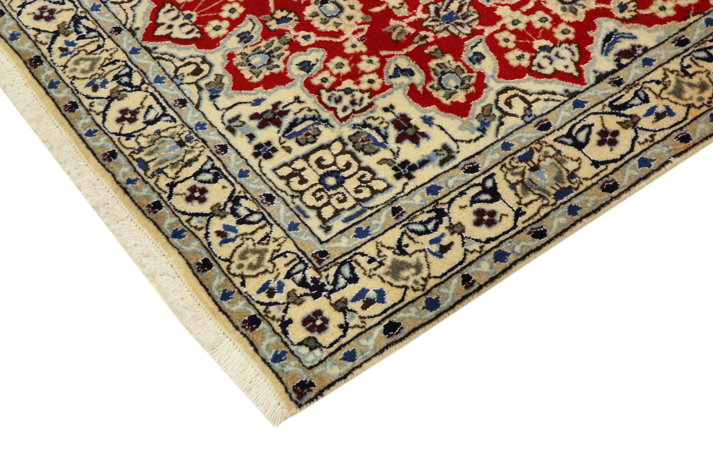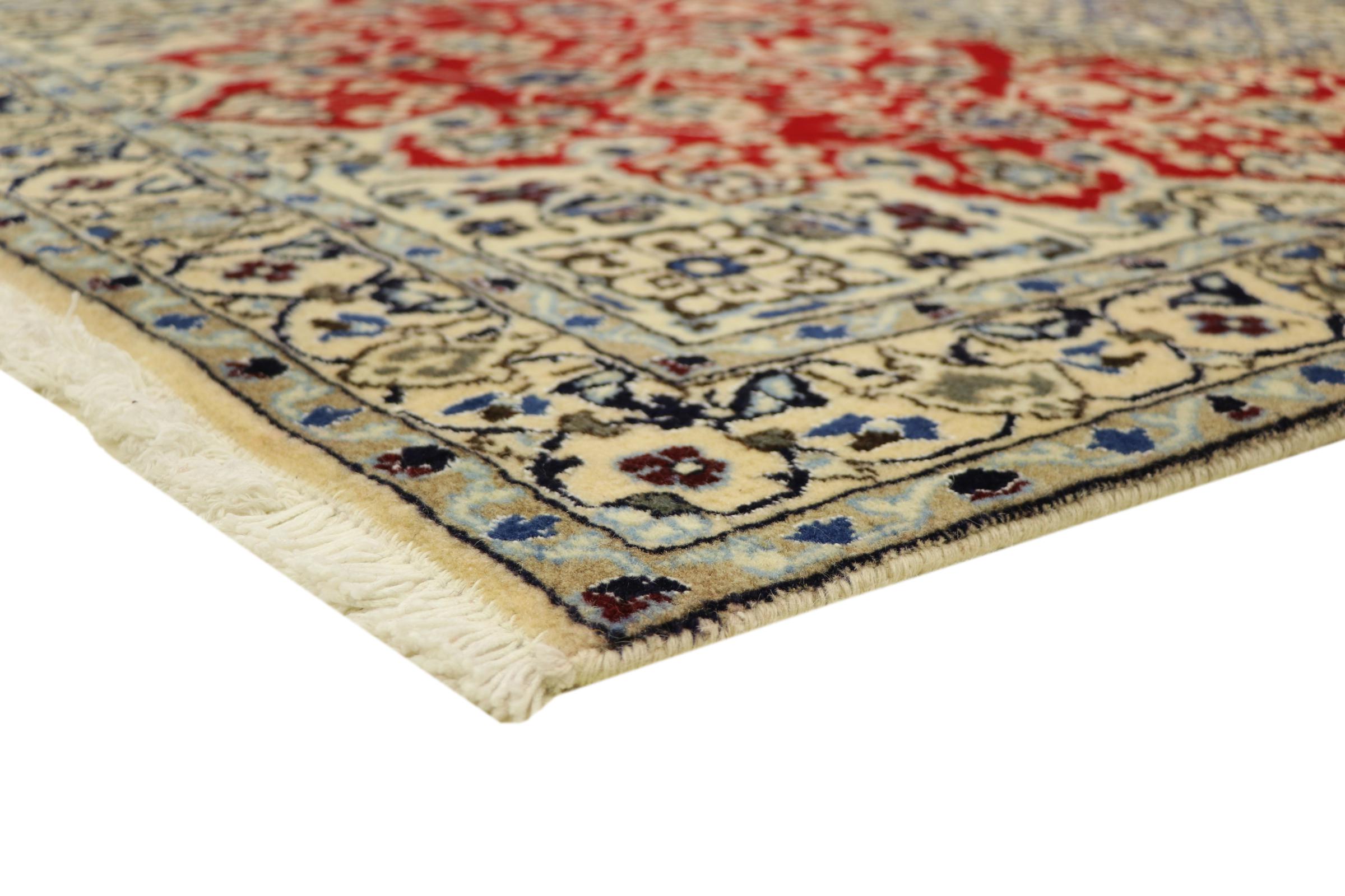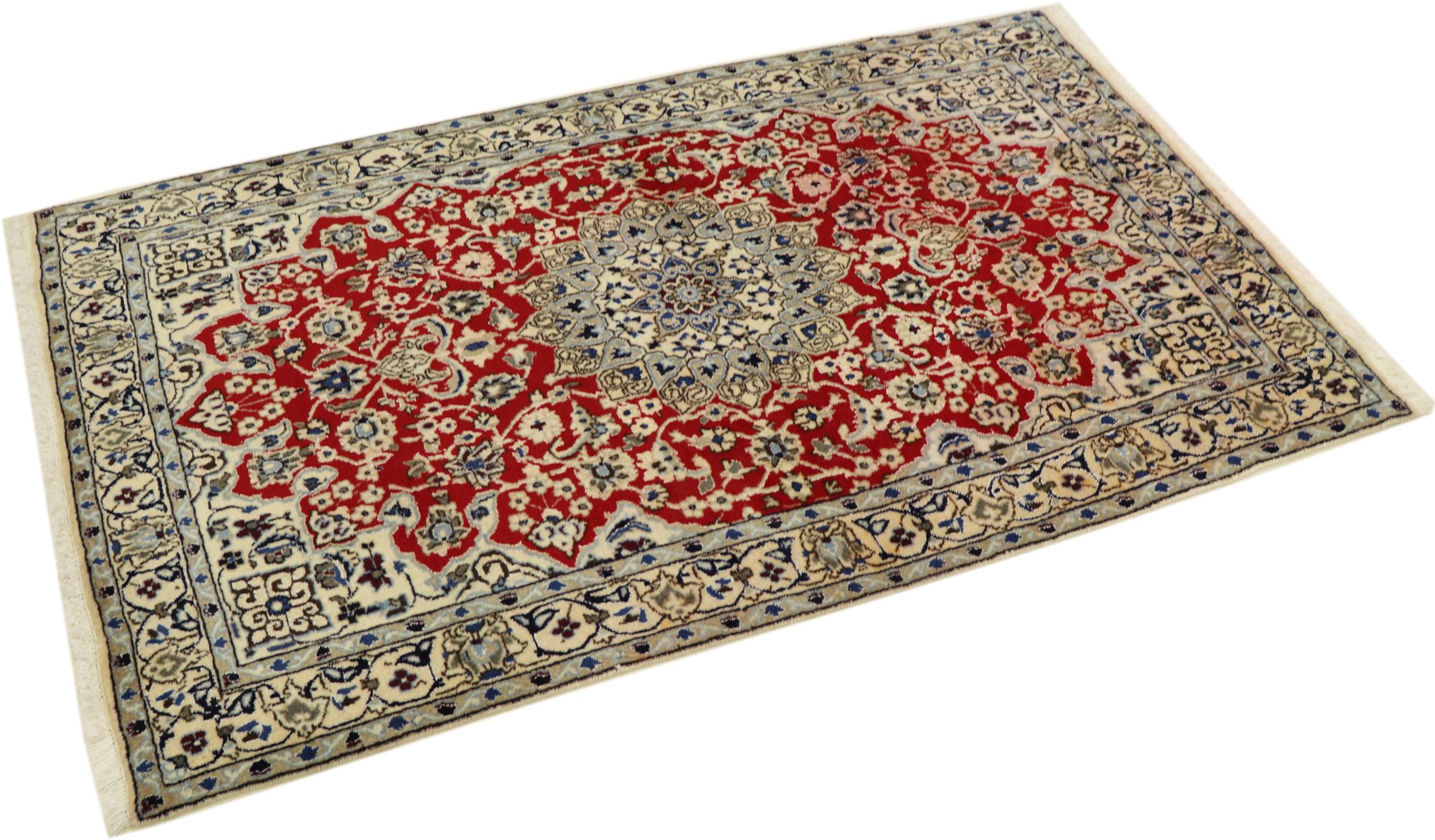 Rugs from the city of Nain, located near one of Iran's largest deserts, are among the most renowned Persian rugs in the world. Their typical design is unmistakable, featuring floral ornaments, a central medallion, and tones of beige, red, or blue. Thanks to their designations of 4La, 6La, 9La, and 12La, the fineness of a Nain rug can be easily identified at a glance. The rule is, the lower the "La" number, the higher the knot density and thus the finer the rug.