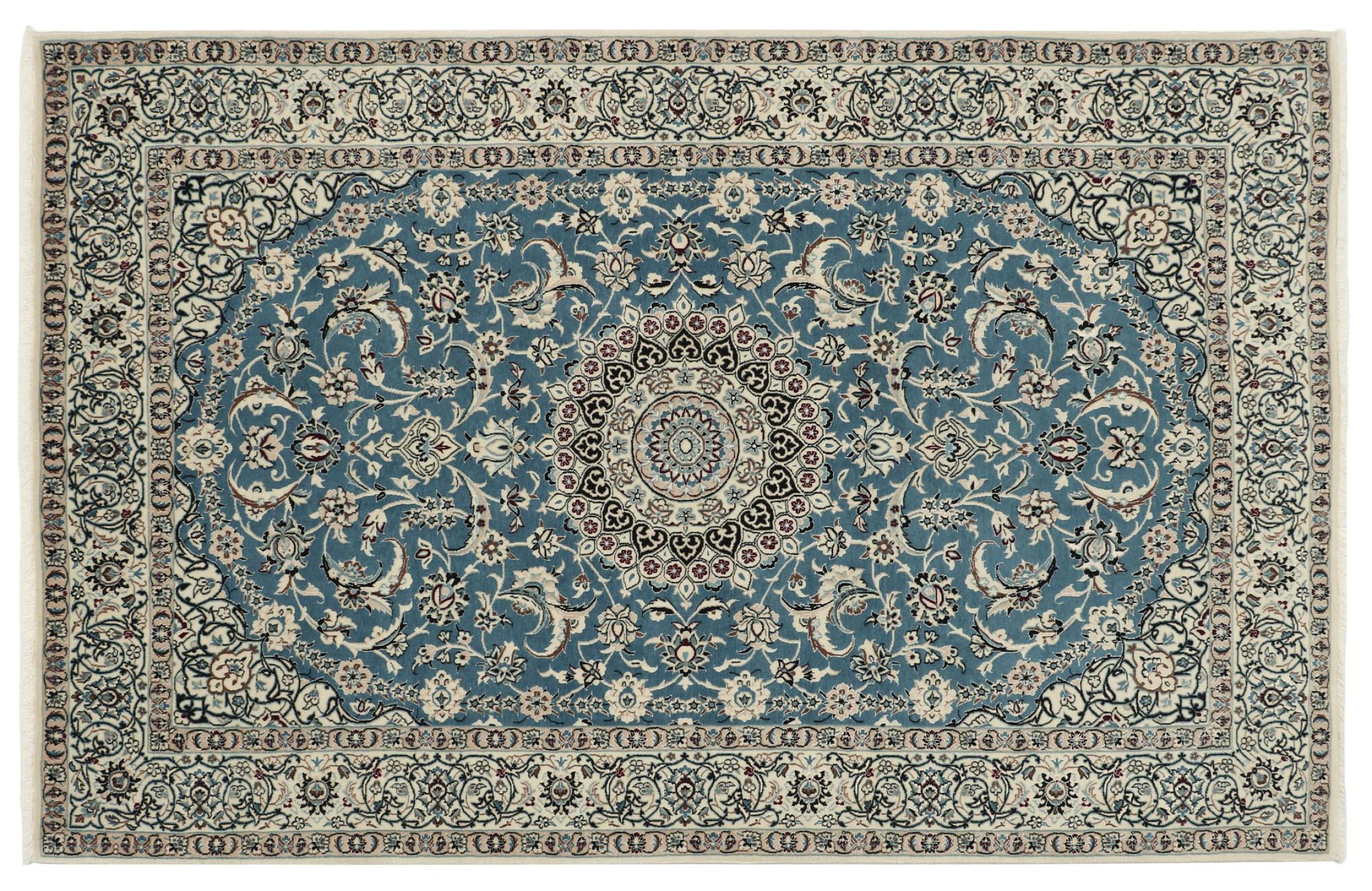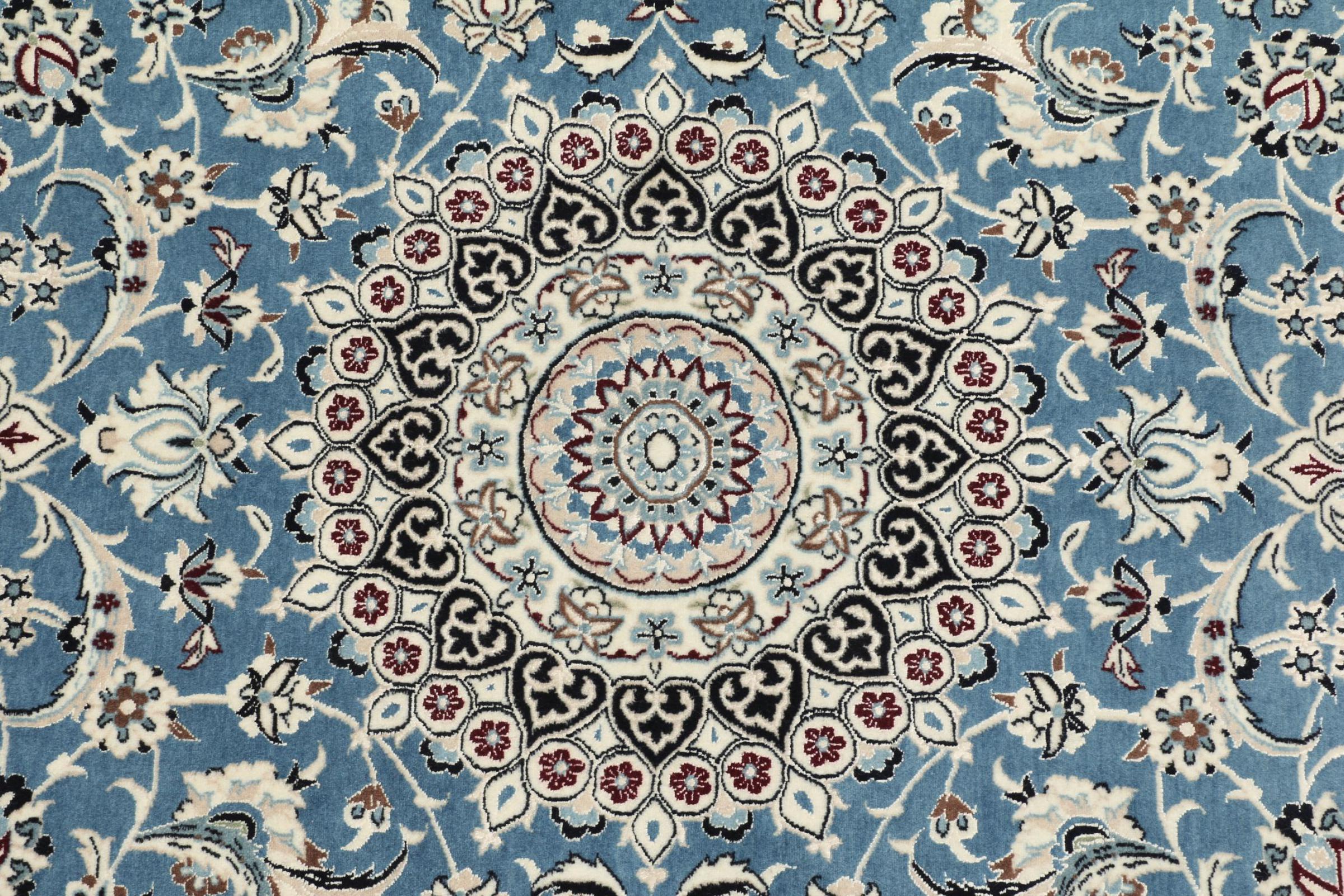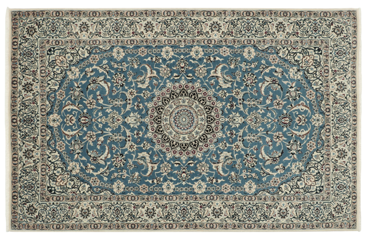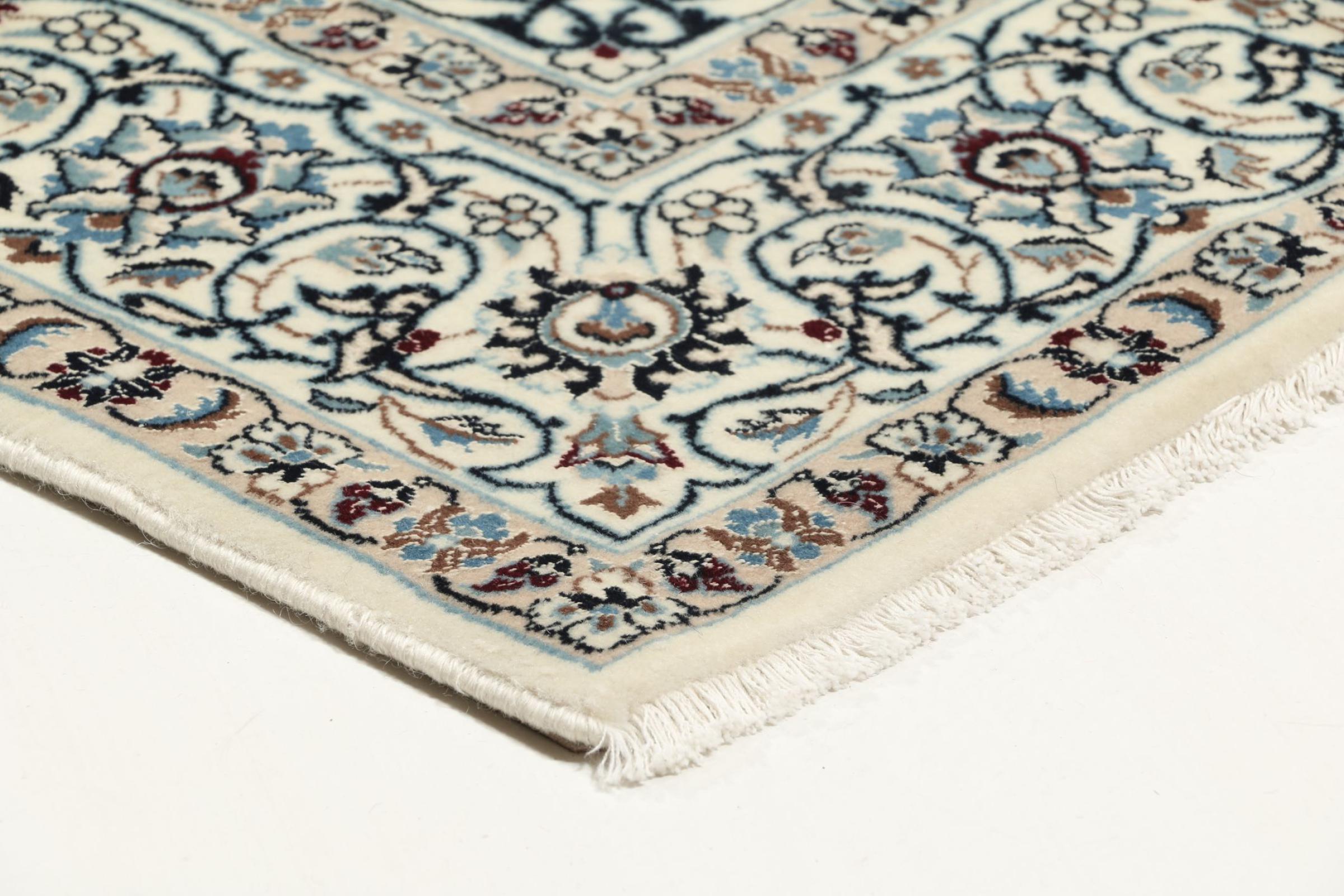 Rugs from the city of Nain, located near one of Iran's largest deserts, are among the most renowned Persian rugs in the world. Their typical design is unmistakable, featuring floral ornaments, a central medallion, and tones of beige, red, or blue. Thanks to their designations of 4La, 6La, 9La, and 12La, the fineness of a Nain rug can be easily identified at a glance. The rule is, the lower the "La" number, the higher the knot density and thus the finer the rug.