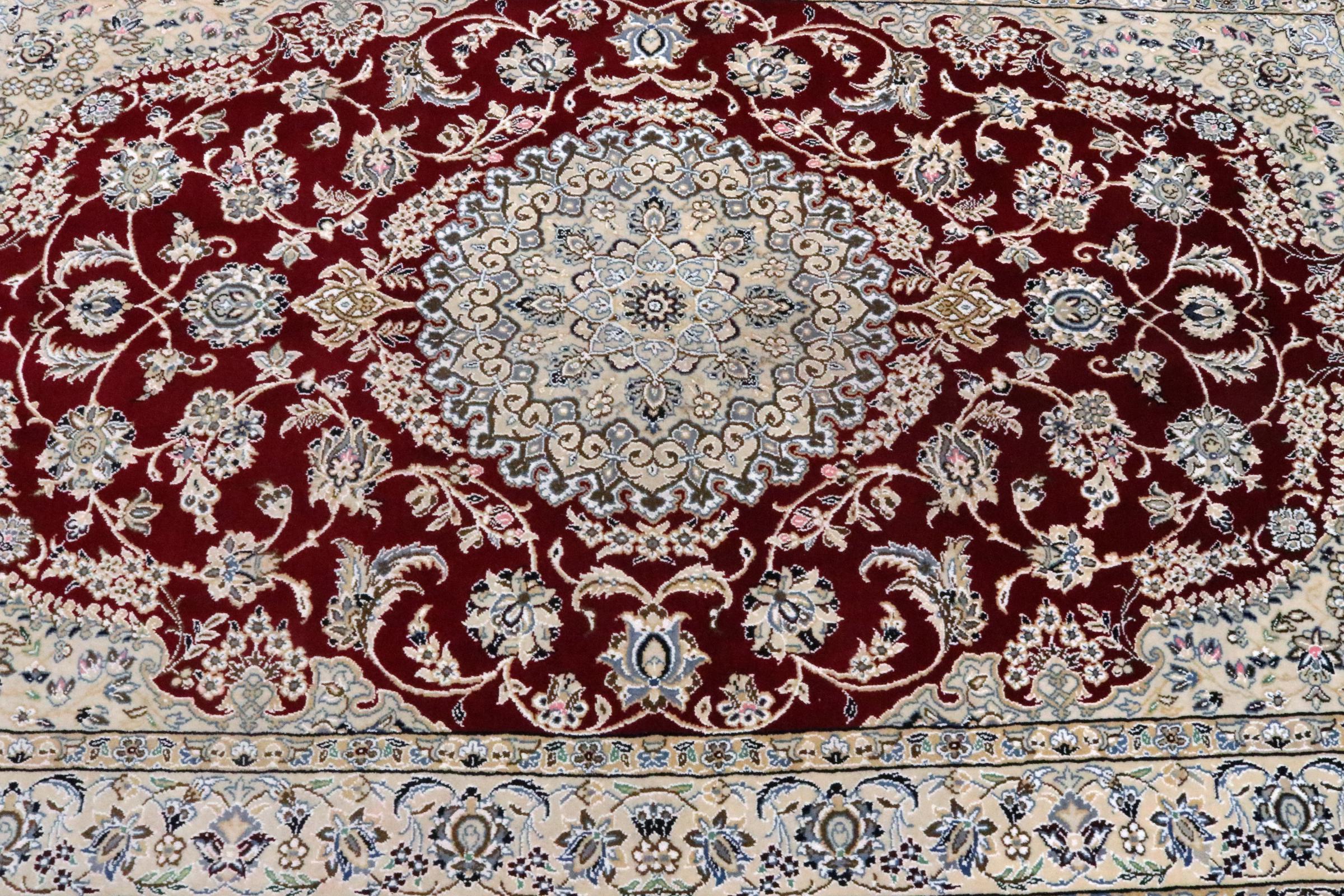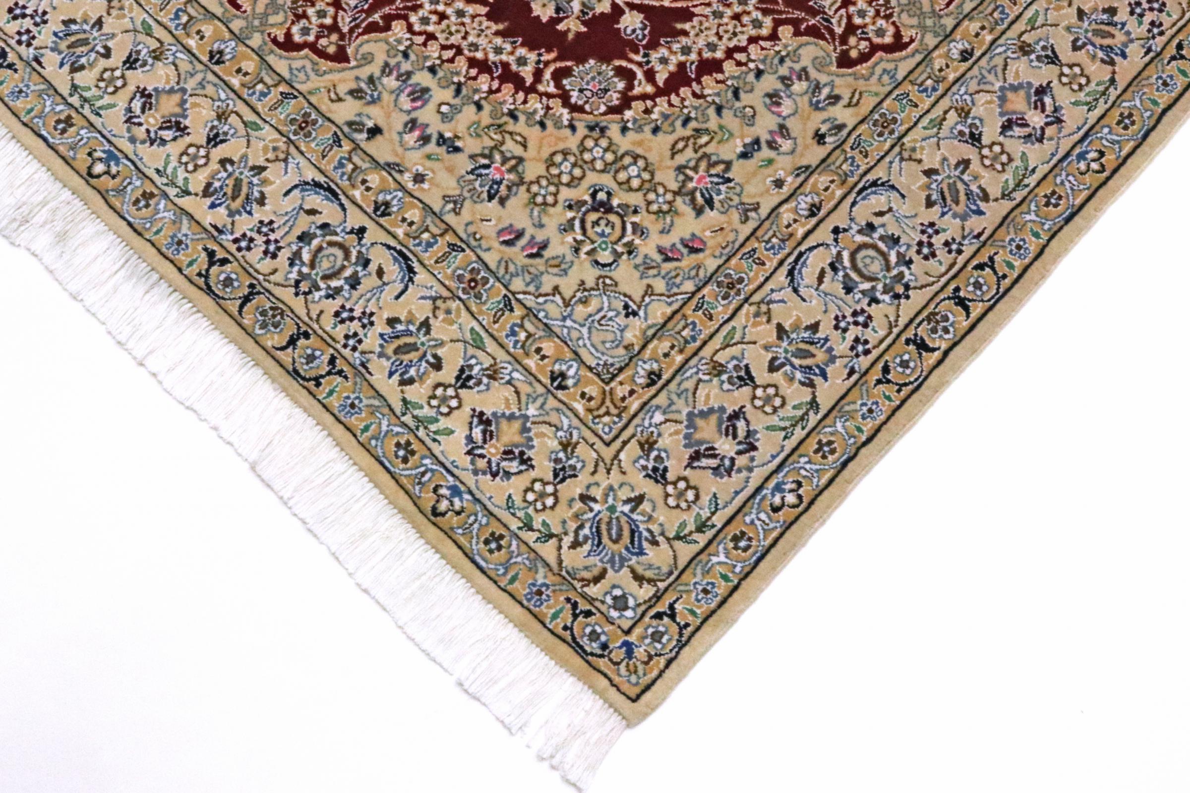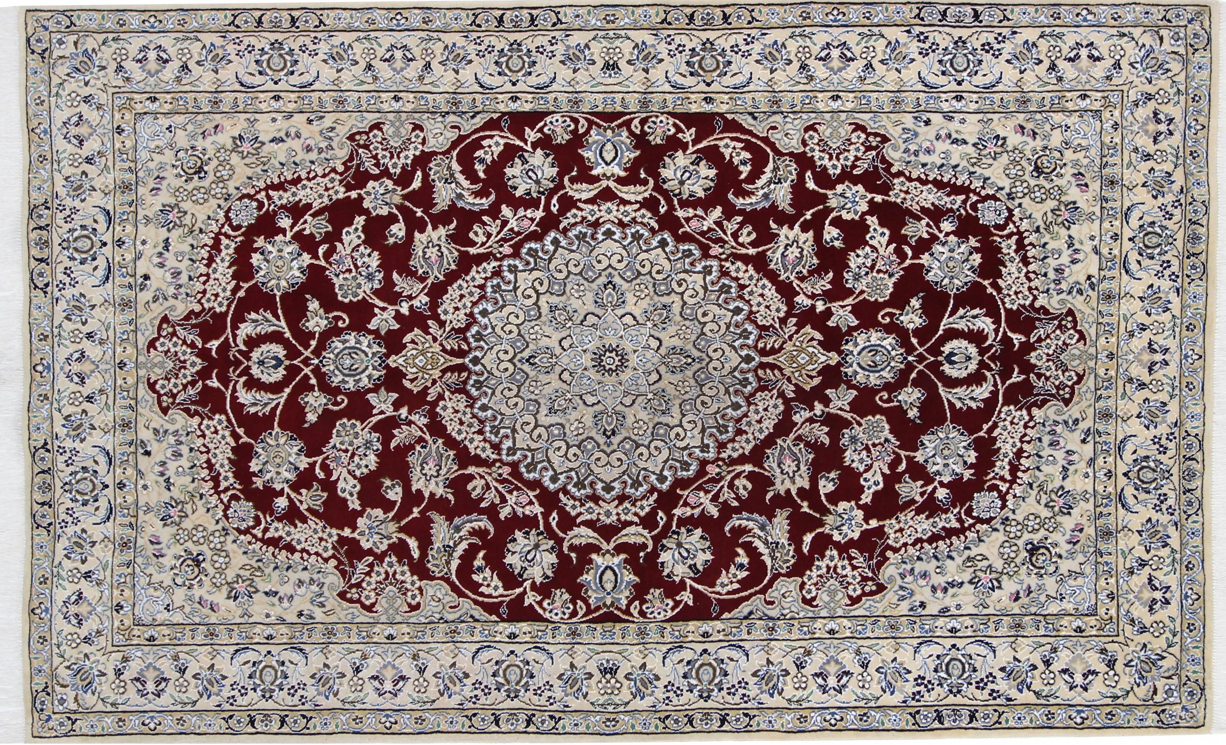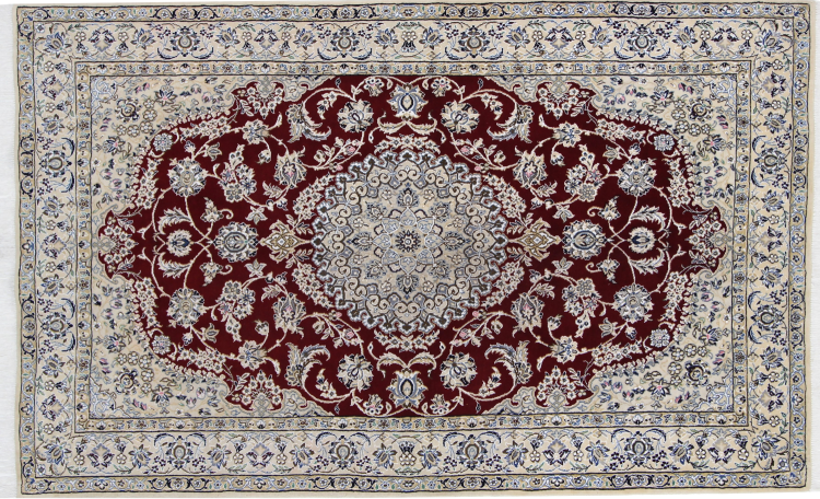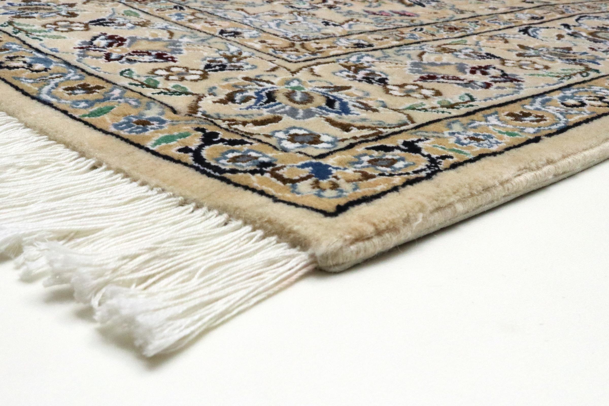 Rugs from the city of Nain, located near one of Iran's largest deserts, are among the most renowned Persian rugs in the world. Their typical design is unmistakable, featuring floral ornaments, a central medallion, and tones of beige, red, or blue. Thanks to their designations of 4La, 6La, 9La, and 12La, the fineness of a Nain rug can be easily identified at a glance. The rule is, the lower the "La" number, the higher the knot density and thus the finer the rug.