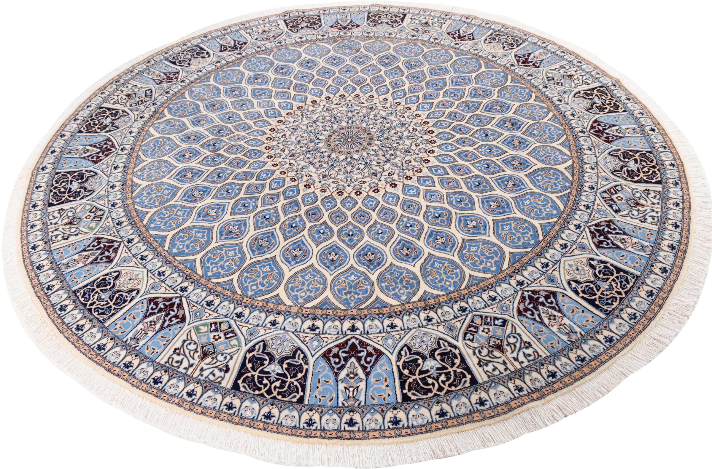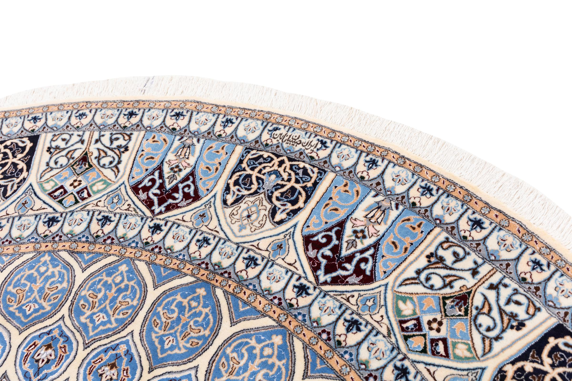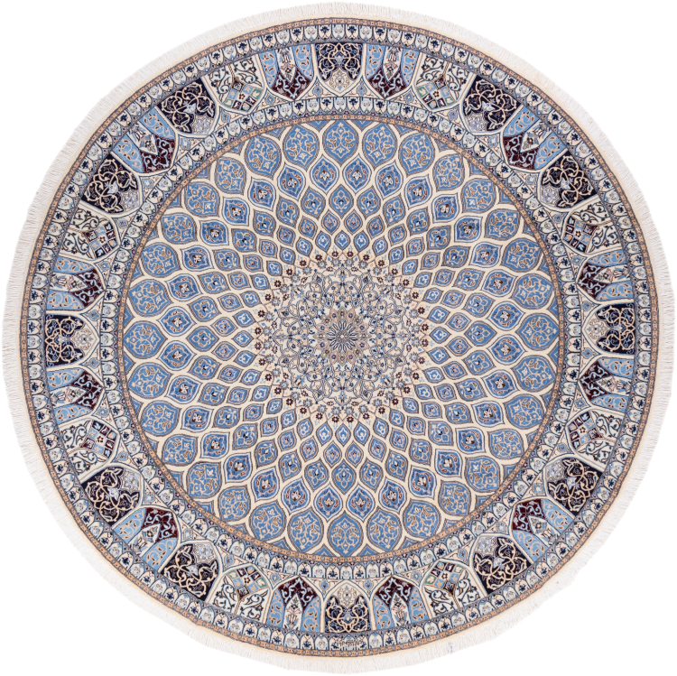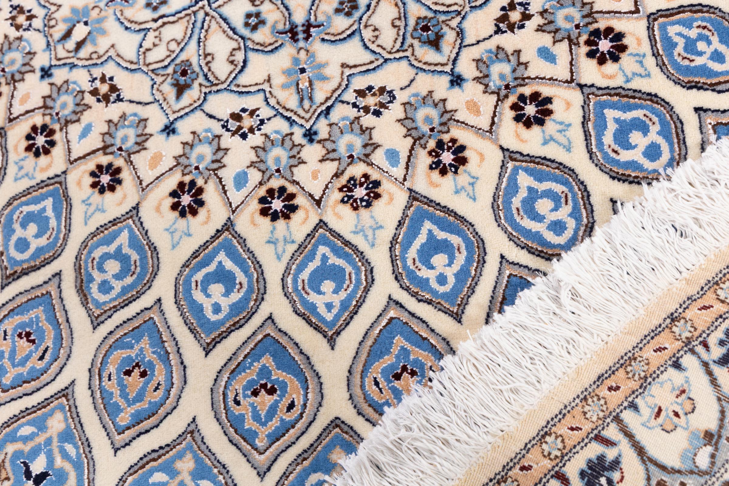 Rugs from the city of Nain, located near one of Iran's largest deserts, are among the most renowned Persian rugs in the world. Their typical design is unmistakable, featuring floral ornaments, a central medallion, and tones of beige, red, or blue. Thanks to their designations of 4La, 6La, 9La, and 12La, the fineness of a Nain rug can be easily identified at a glance. The rule is, the lower the "La" number, the higher the knot density and thus the finer the rug.