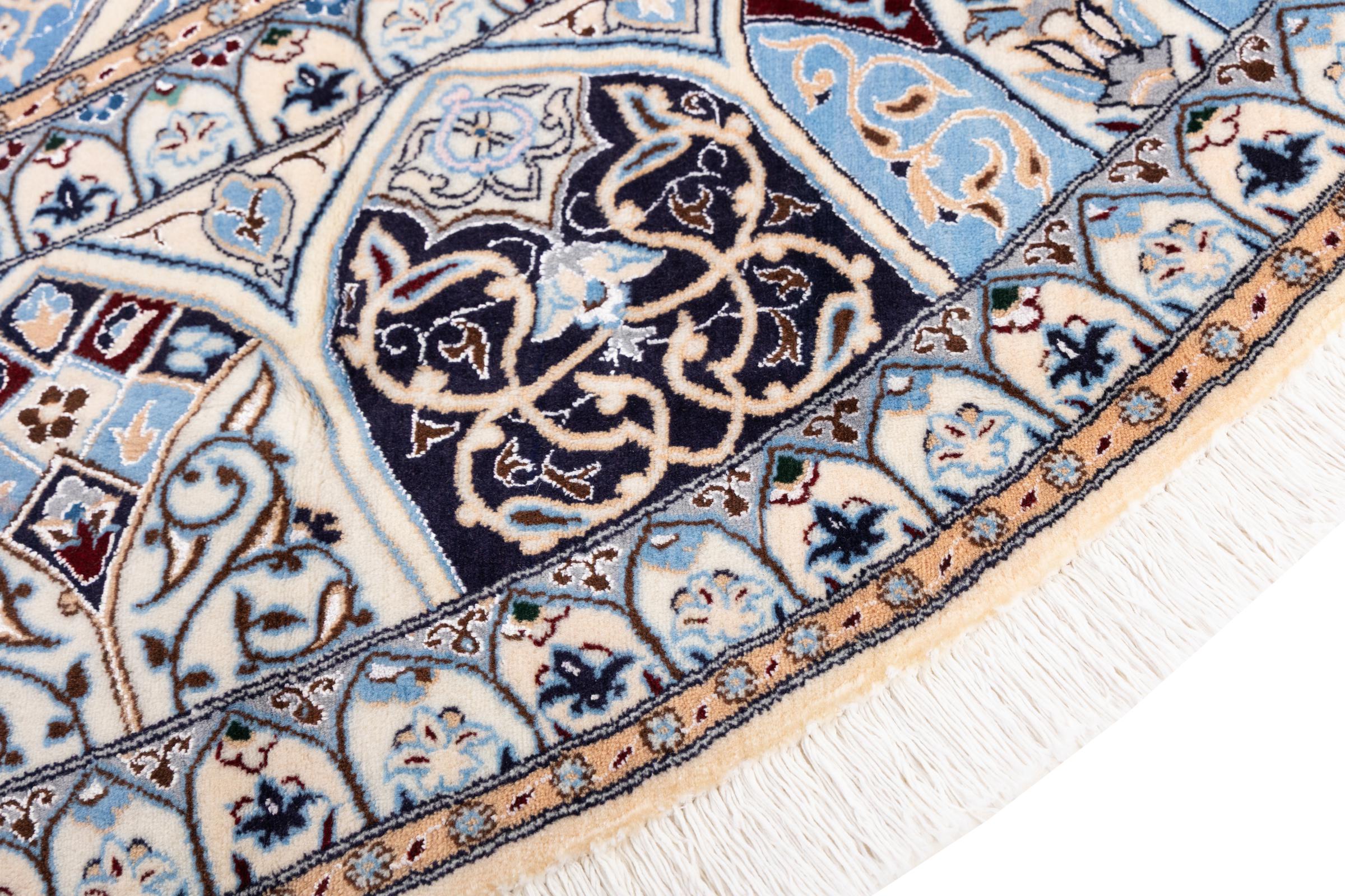 This Nain rug is categorized as 9La. It has a remarkable quality and a typical Persian curvilinear design for a great highlight for your home. This Persian rug has been knotted by hand from high grade sheep wool and natural silk in our own ateliers in Nain. This popular city is located in the western part of the desert Dasht-e-Kavir.