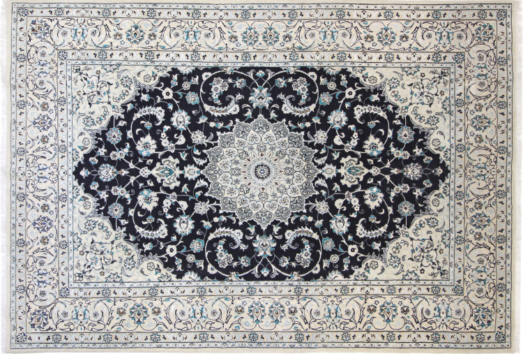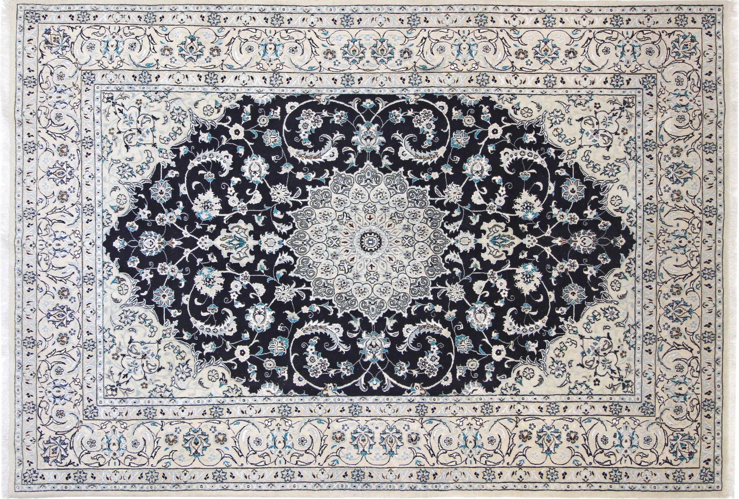 Rugs from the city of Nain, located near one of Iran's largest deserts, are among the most renowned Persian rugs in the world. Their typical design is unmistakable, featuring floral ornaments, a central medallion, and tones of beige, red, or blue. Thanks to their designations of 4La, 6La, 9La, and 12La, the fineness of a Nain rug can be easily identified at a glance. The rule is, the lower the "La" number, the higher the knot density and thus the finer the rug.