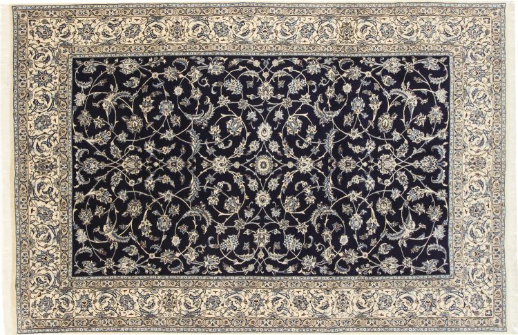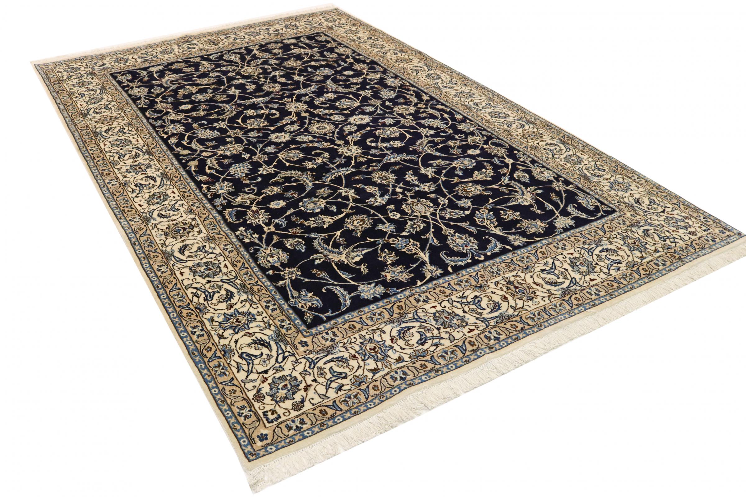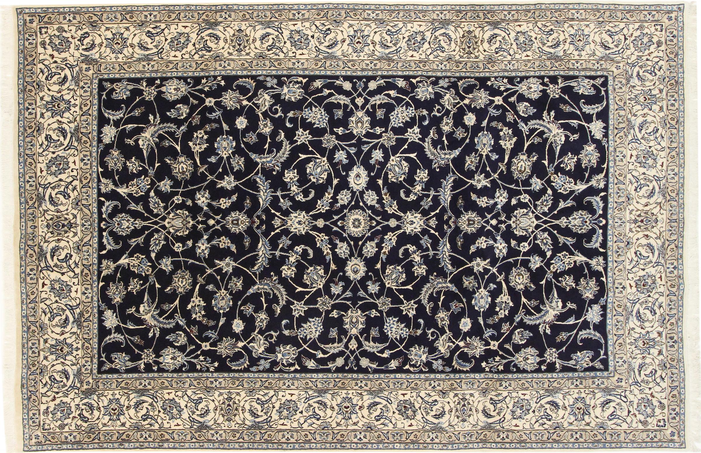 Rugs from the city of Nain, located near one of Iran's largest deserts, are among the most renowned Persian rugs in the world. Their typical design is unmistakable, featuring floral ornaments, a central medallion, and tones of beige, red, or blue. Thanks to their designations of 4La, 6La, 9La, and 12La, the fineness of a Nain rug can be easily identified at a glance. The rule is, the lower the "La" number, the higher the knot density and thus the finer the rug.