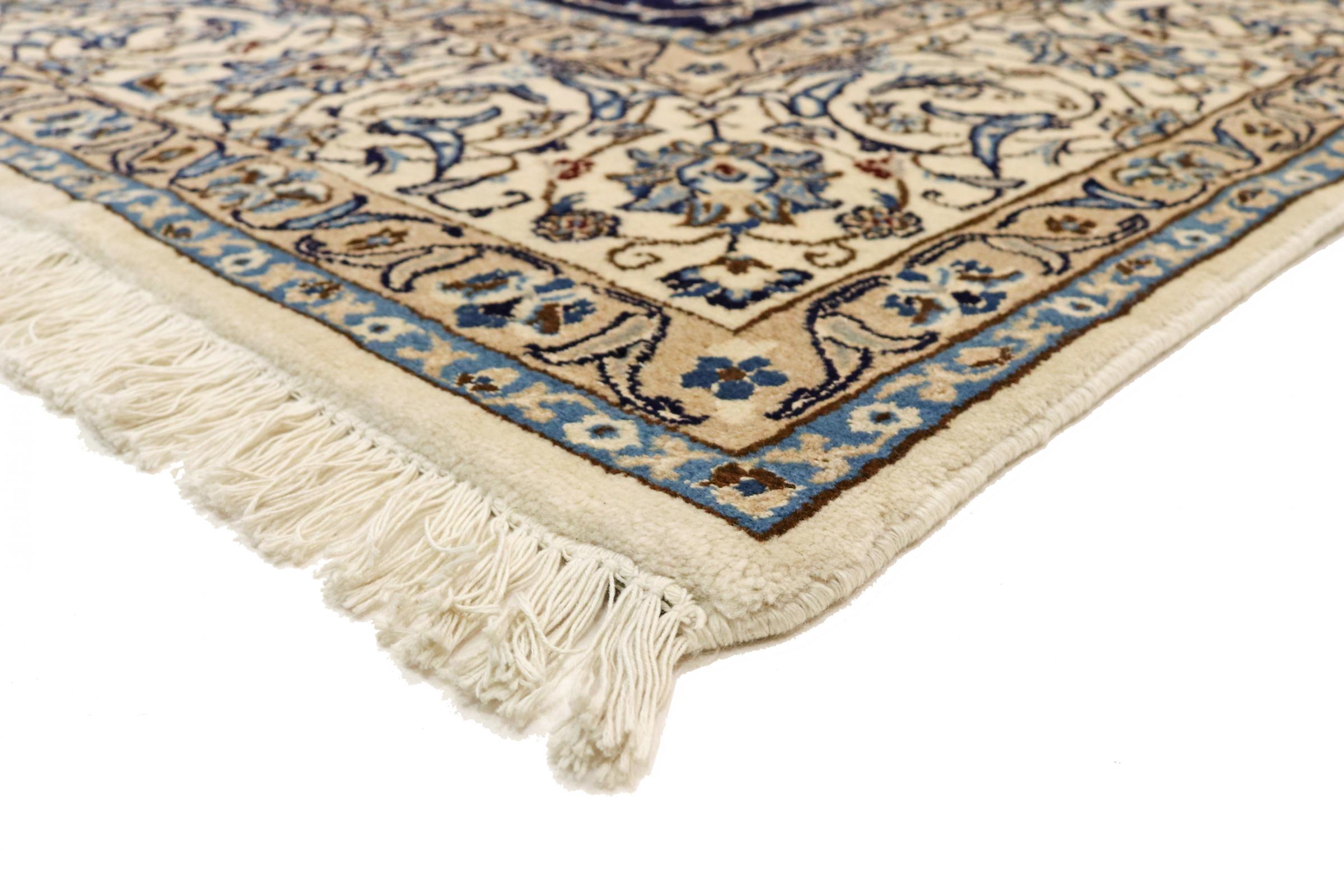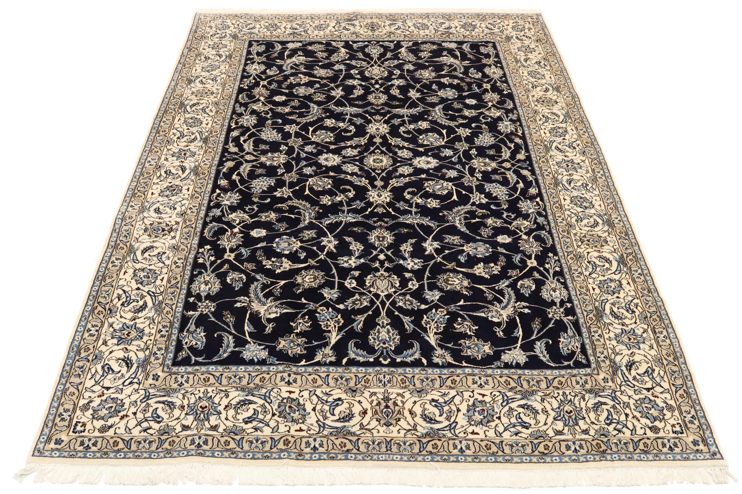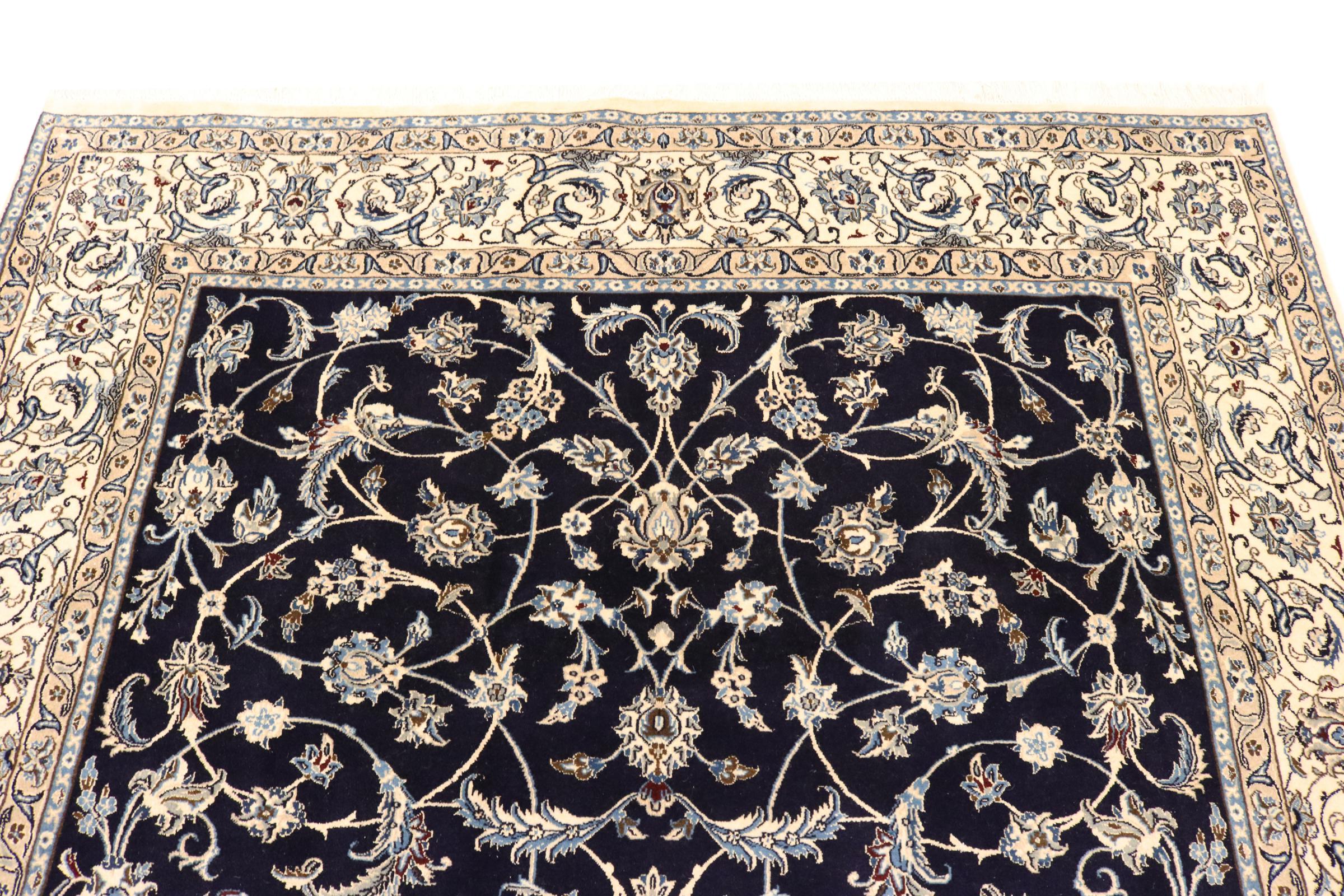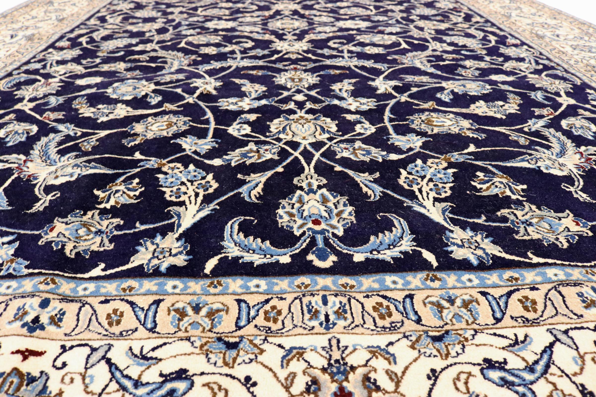This Nain rug is categorized as 9La. It has a remarkable quality and a typical Persian curvilinear design for a great highlight for your home. This Persian rug has been knotted by hand from high grade sheep wool and natural silk in our own ateliers in Nain. This popular city is located in the western part of the desert Dasht-e-Kavir.