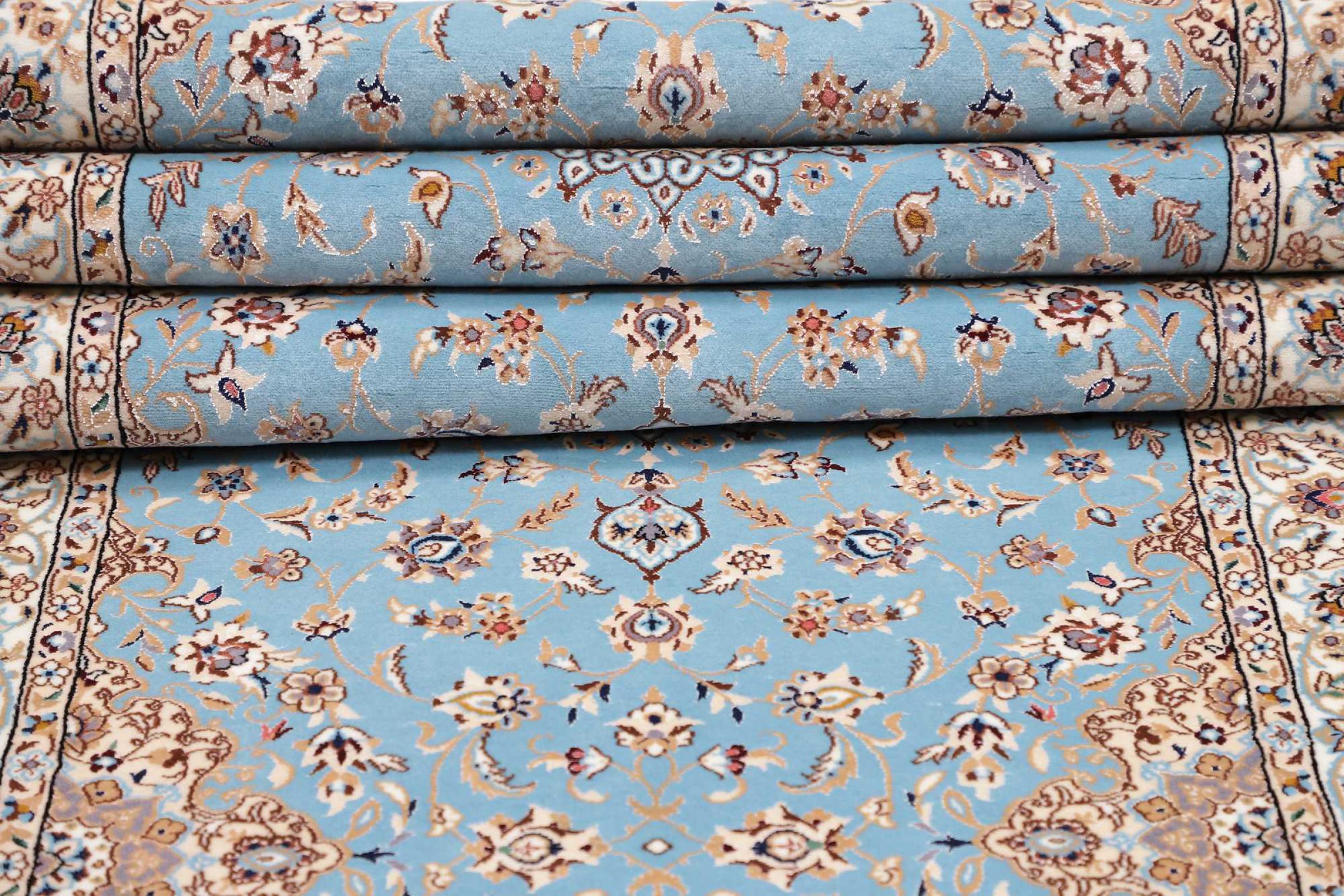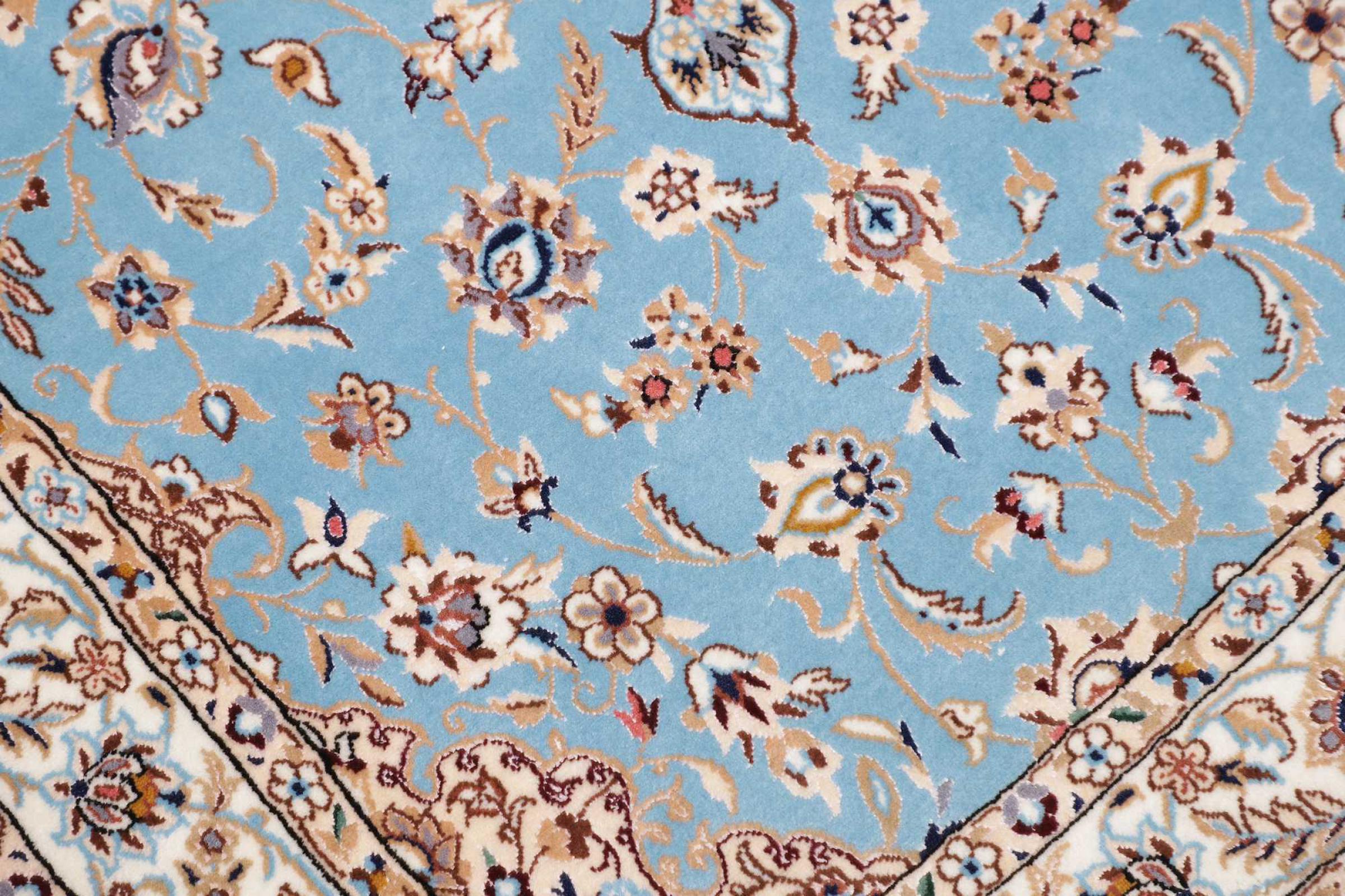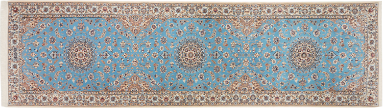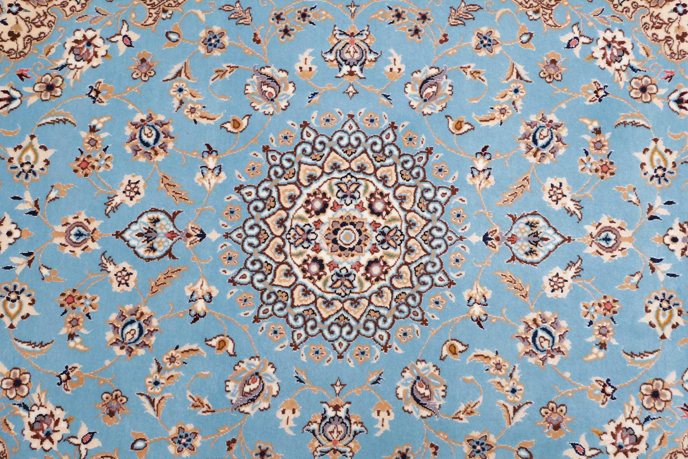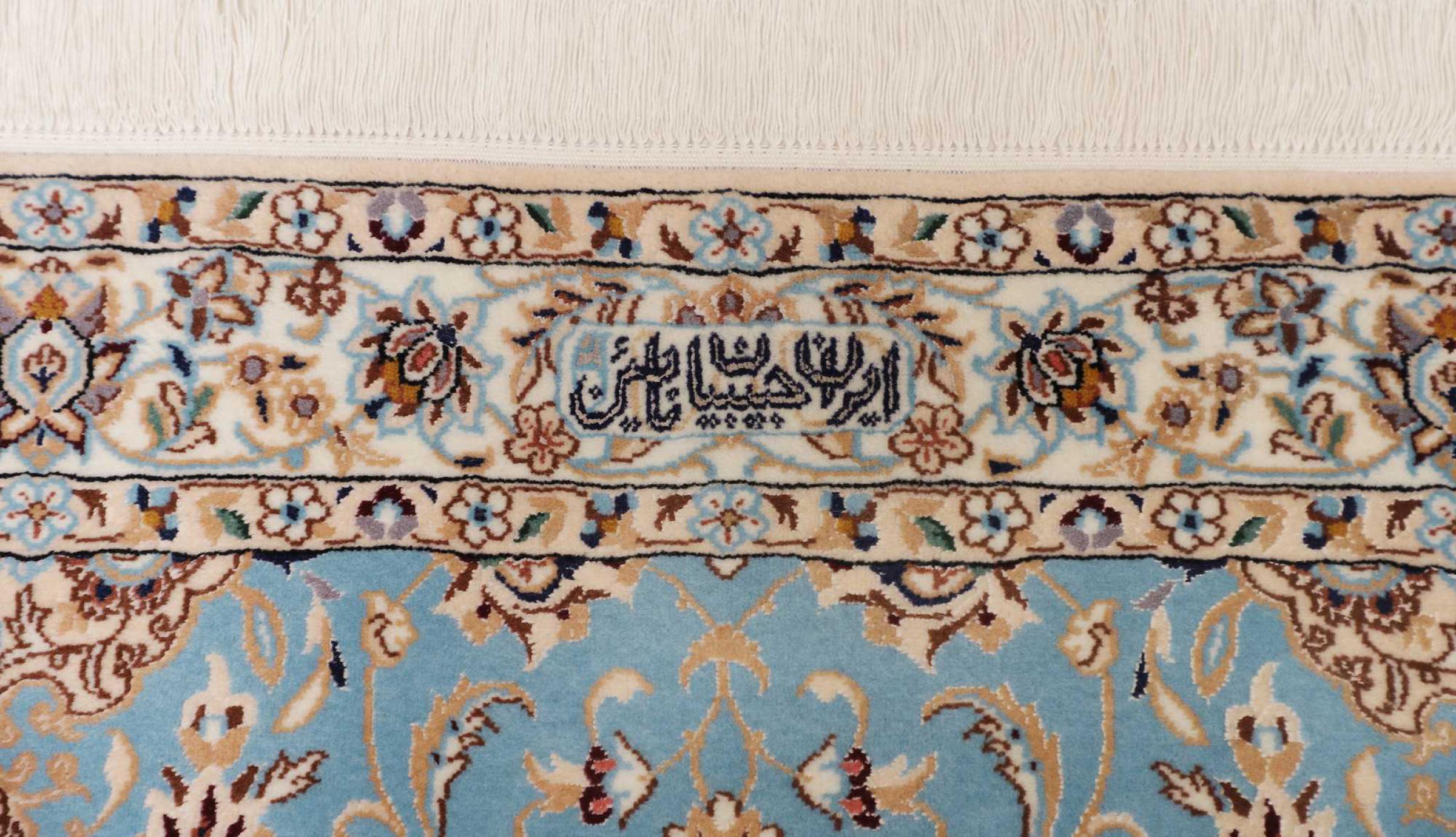Rugs from the city of Nain, located near one of Iran's largest deserts, are among the most renowned Persian rugs in the world. Their typical design is unmistakable, featuring floral ornaments, a central medallion, and tones of beige, red, or blue. Thanks to their designations of 4La, 6La, 9La, and 12La, the fineness of a Nain rug can be easily identified at a glance. The rule is, the lower the "La" number, the higher the knot density and thus the finer the rug.