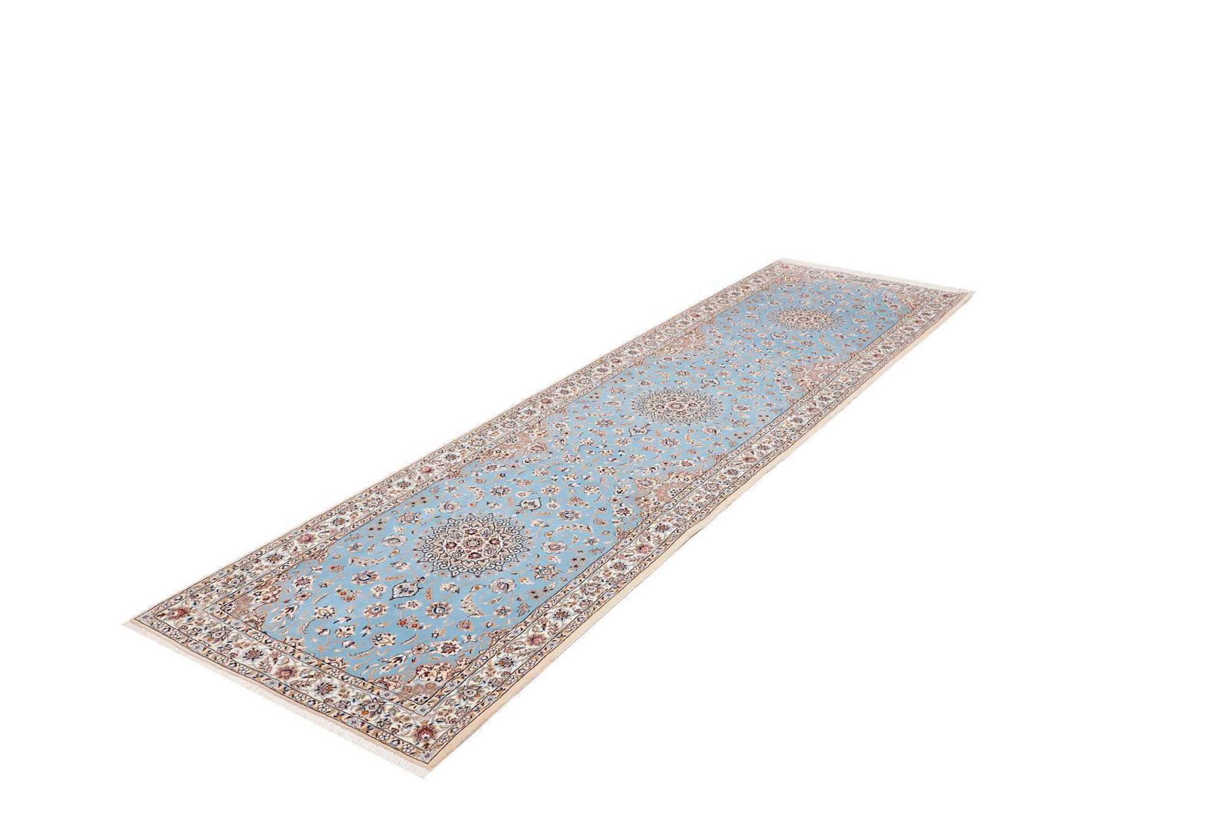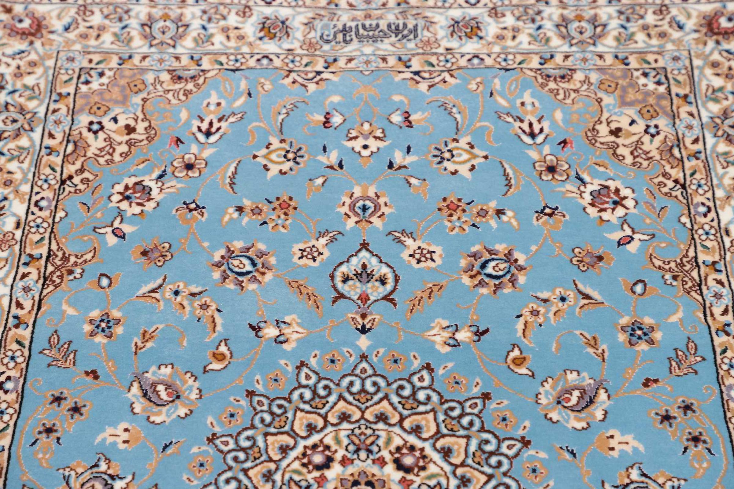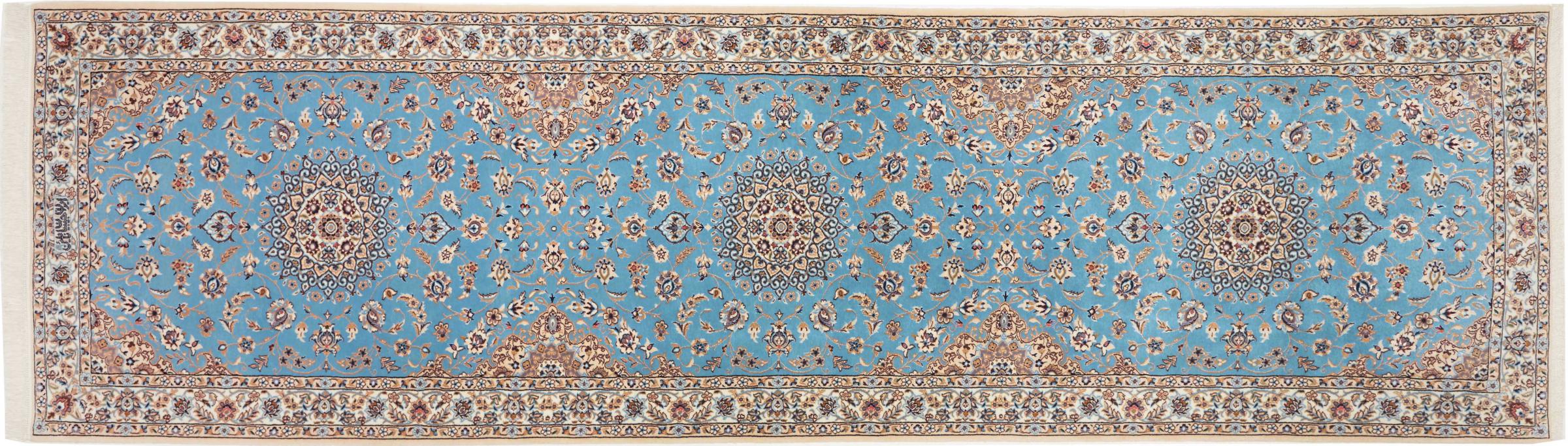 Rugs from the city of Nain, located near one of Iran's largest deserts, are among the most renowned Persian rugs in the world. Their typical design is unmistakable, featuring floral ornaments, a central medallion, and tones of beige, red, or blue. Thanks to their designations of 4La, 6La, 9La, and 12La, the fineness of a Nain rug can be easily identified at a glance. The rule is, the lower the "La" number, the higher the knot density and thus the finer the rug.