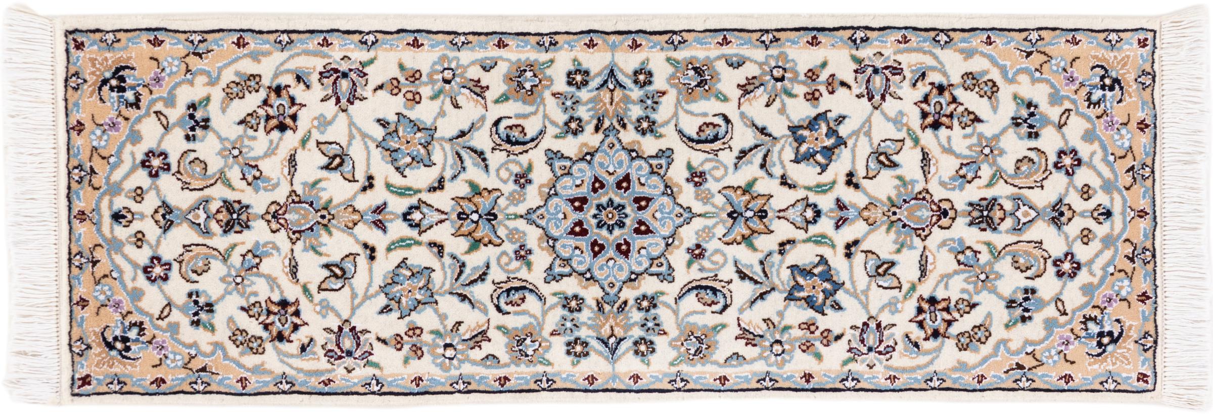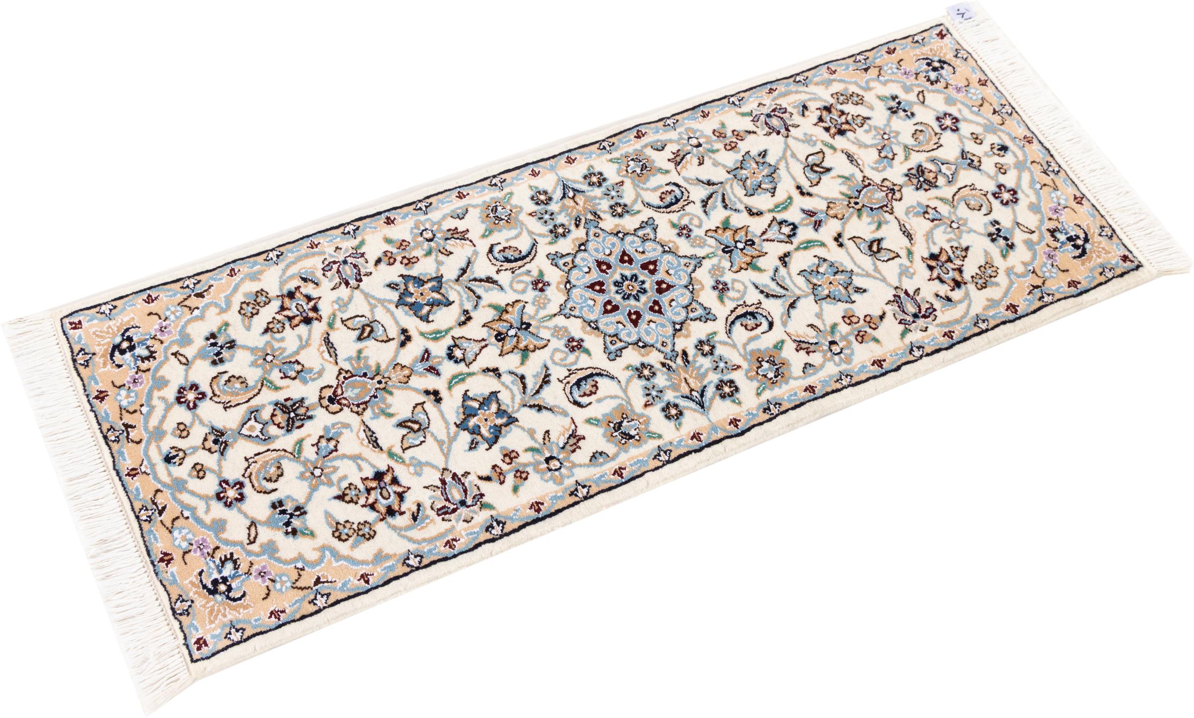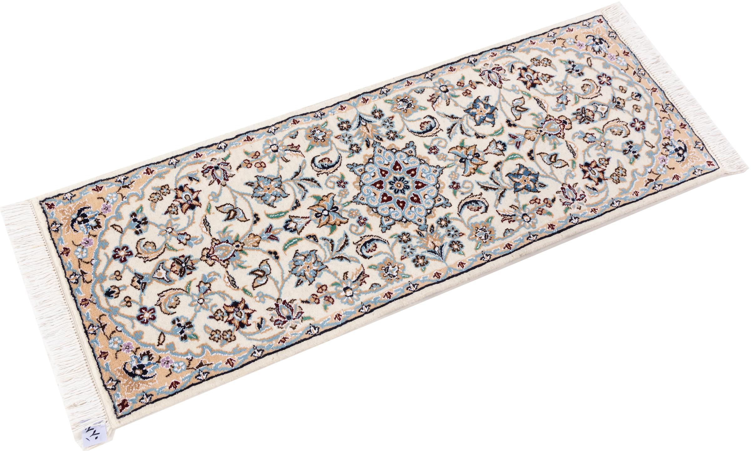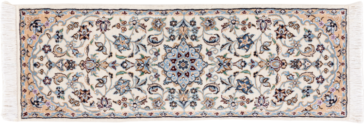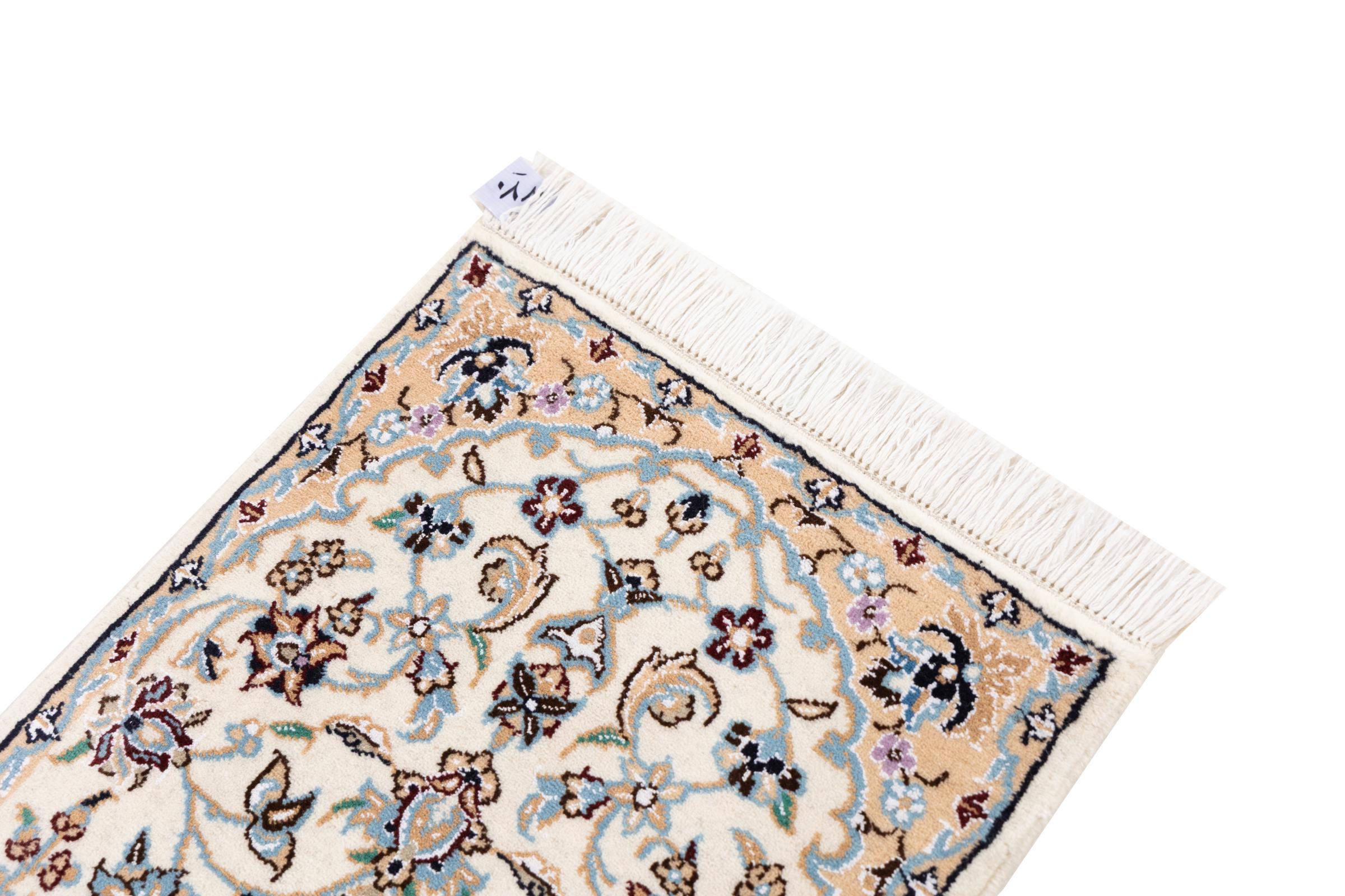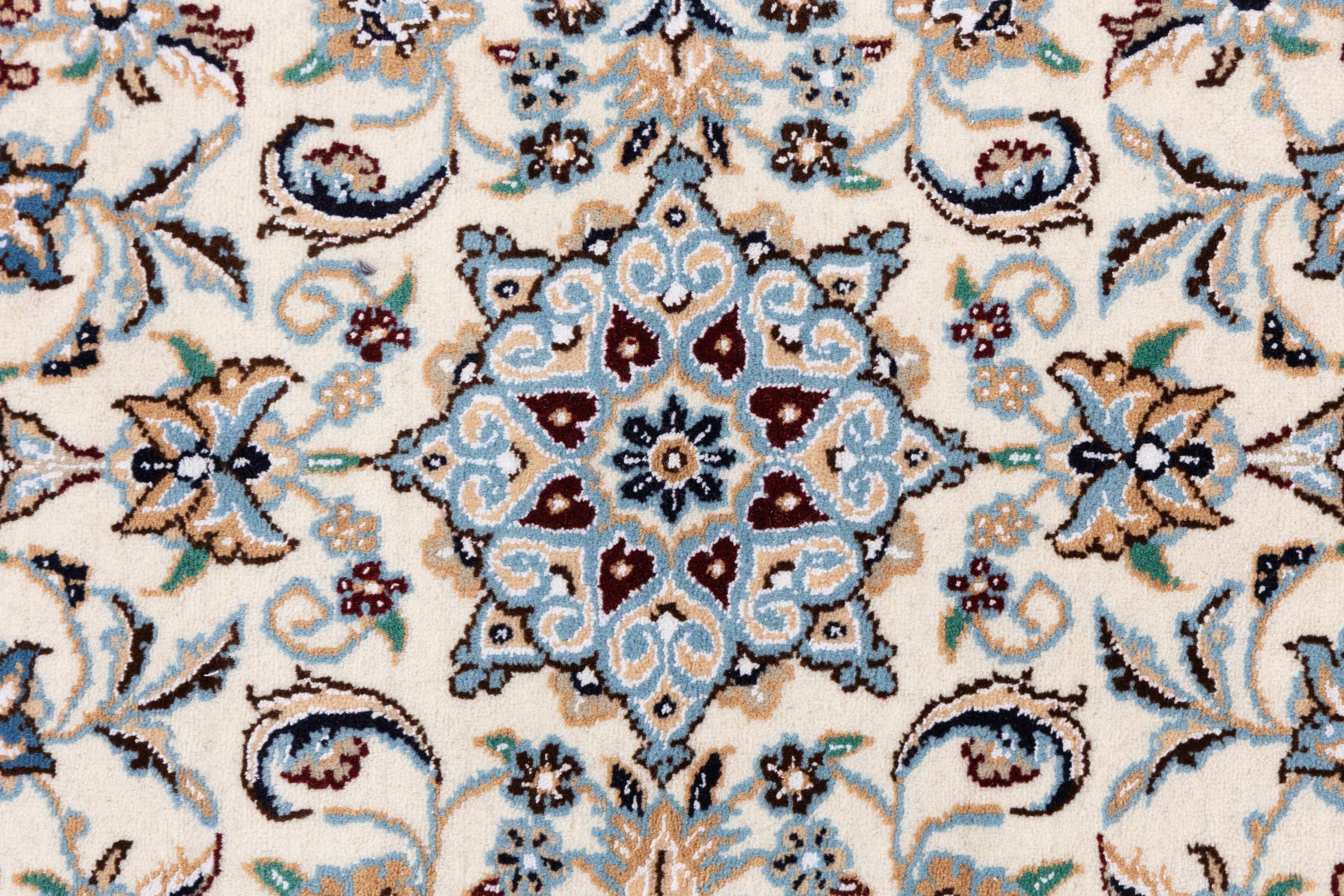 Rugs from the city of Nain, located near one of Iran's largest deserts, are among the most renowned Persian rugs in the world. Their typical design is unmistakable, featuring floral ornaments, a central medallion, and tones of beige, red, or blue. Thanks to their designations of 4La, 6La, 9La, and 12La, the fineness of a Nain rug can be easily identified at a glance. The rule is, the lower the "La" number, the higher the knot density and thus the finer the rug.