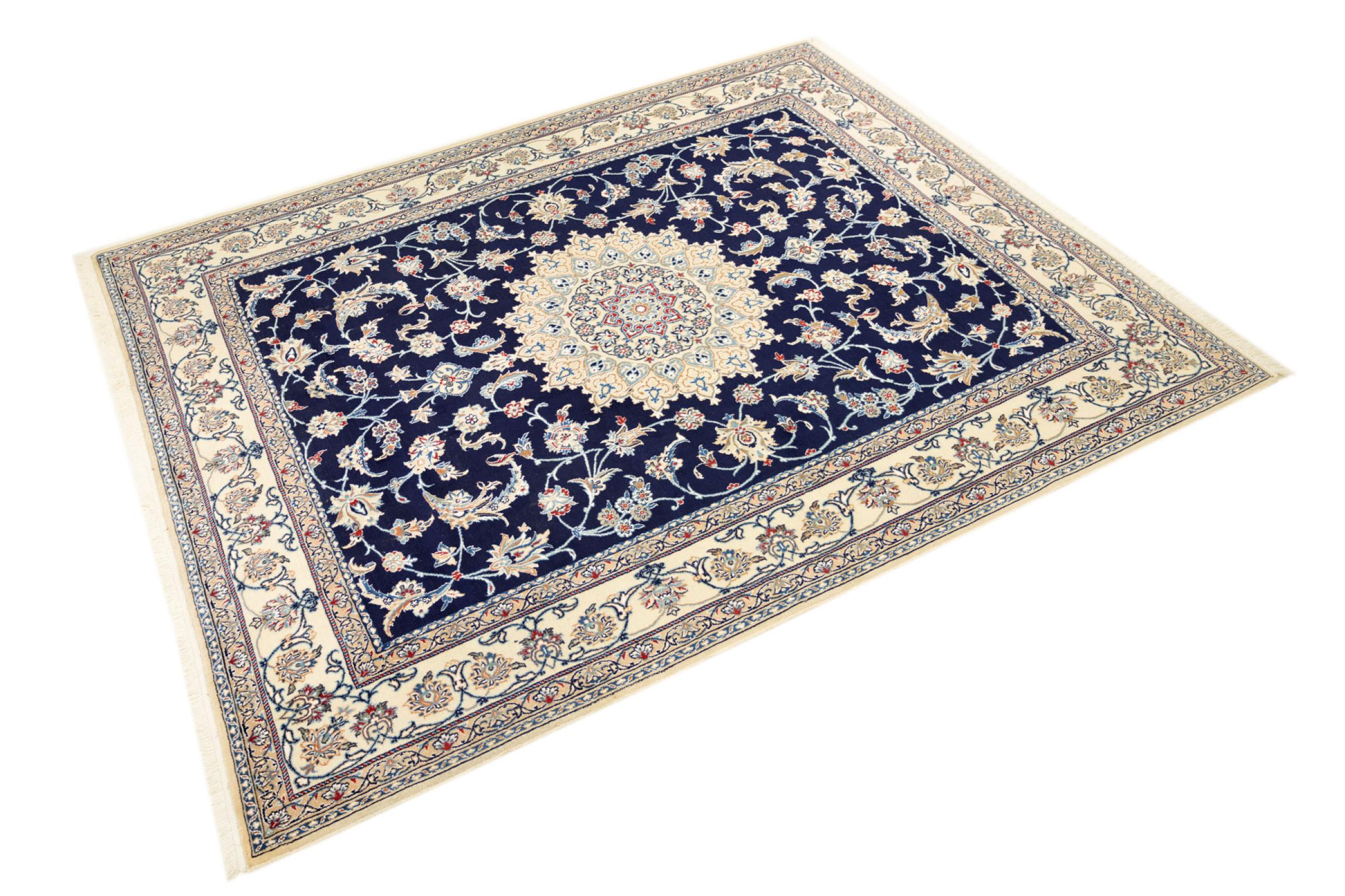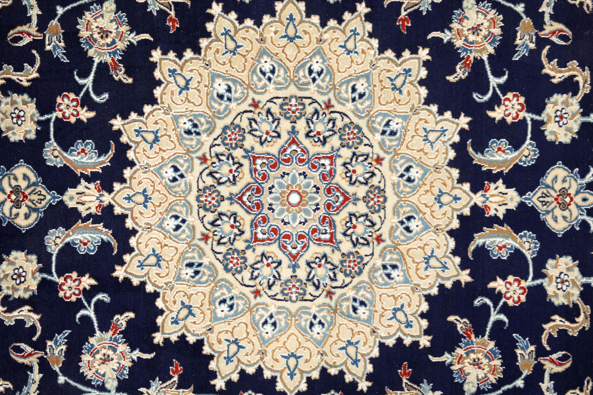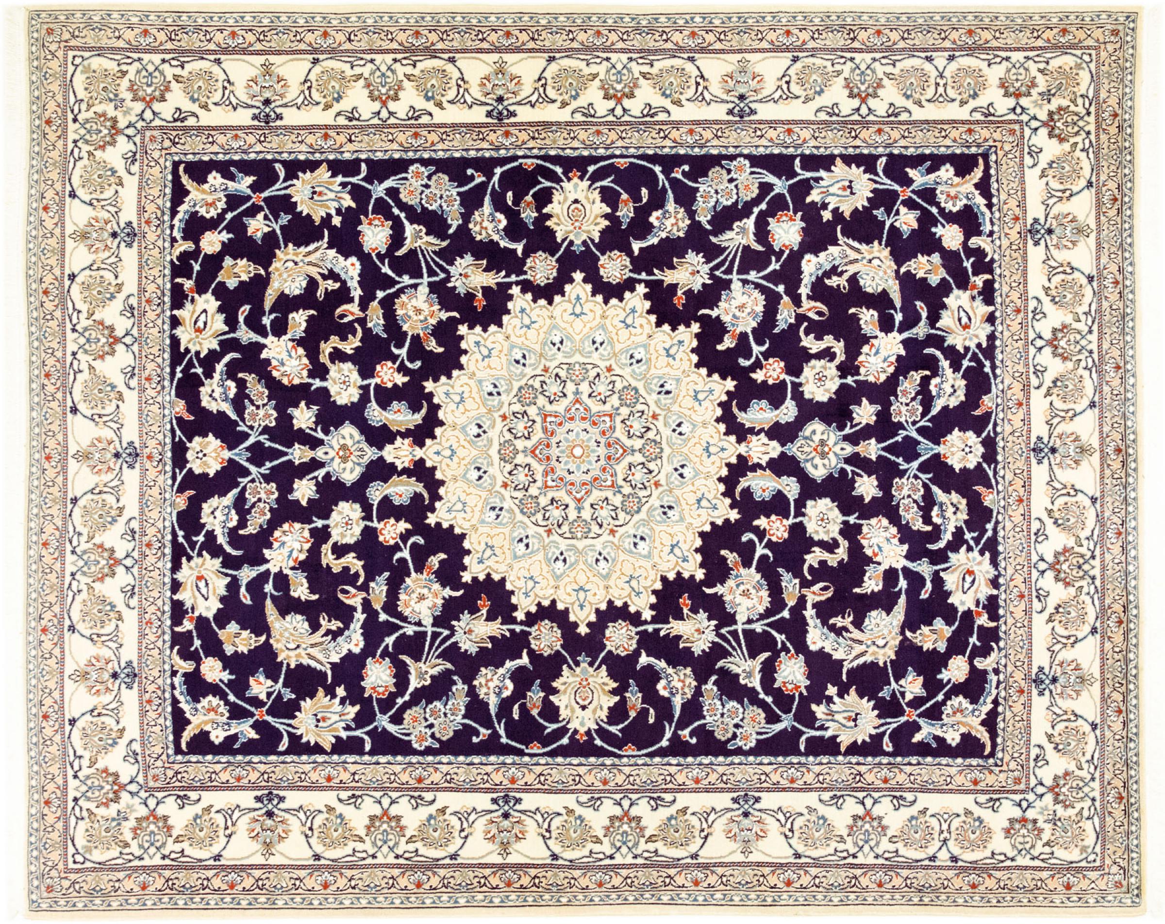 Rugs from the city of Nain, located near one of Iran's largest deserts, are among the most renowned Persian rugs in the world. Their typical design is unmistakable, featuring floral ornaments, a central medallion, and tones of beige, red, or blue. Thanks to their designations of 4La, 6La, 9La, and 12La, the fineness of a Nain rug can be easily identified at a glance. The rule is, the lower the "La" number, the higher the knot density and thus the finer the rug.