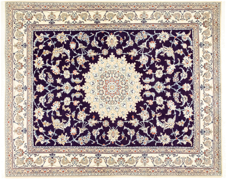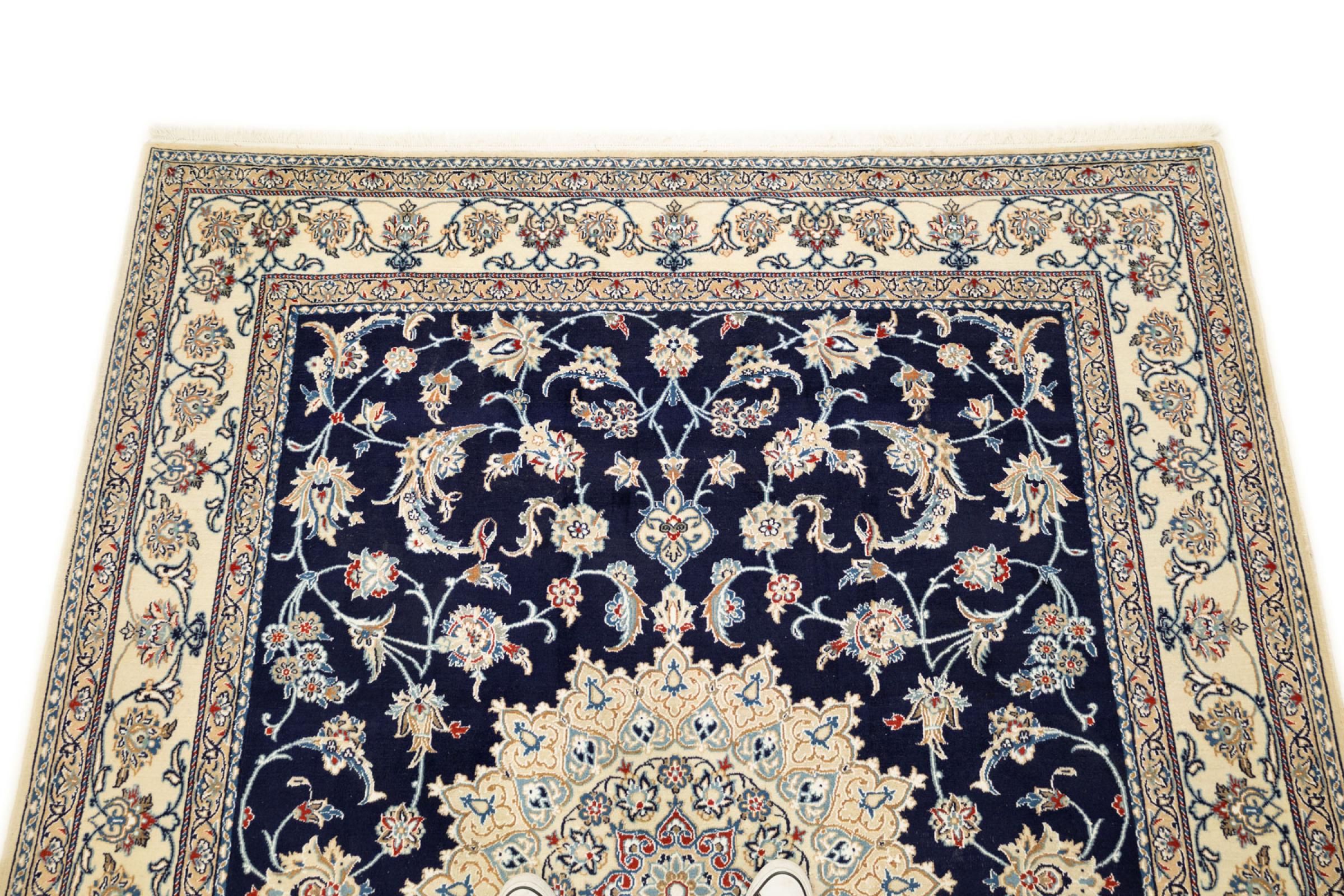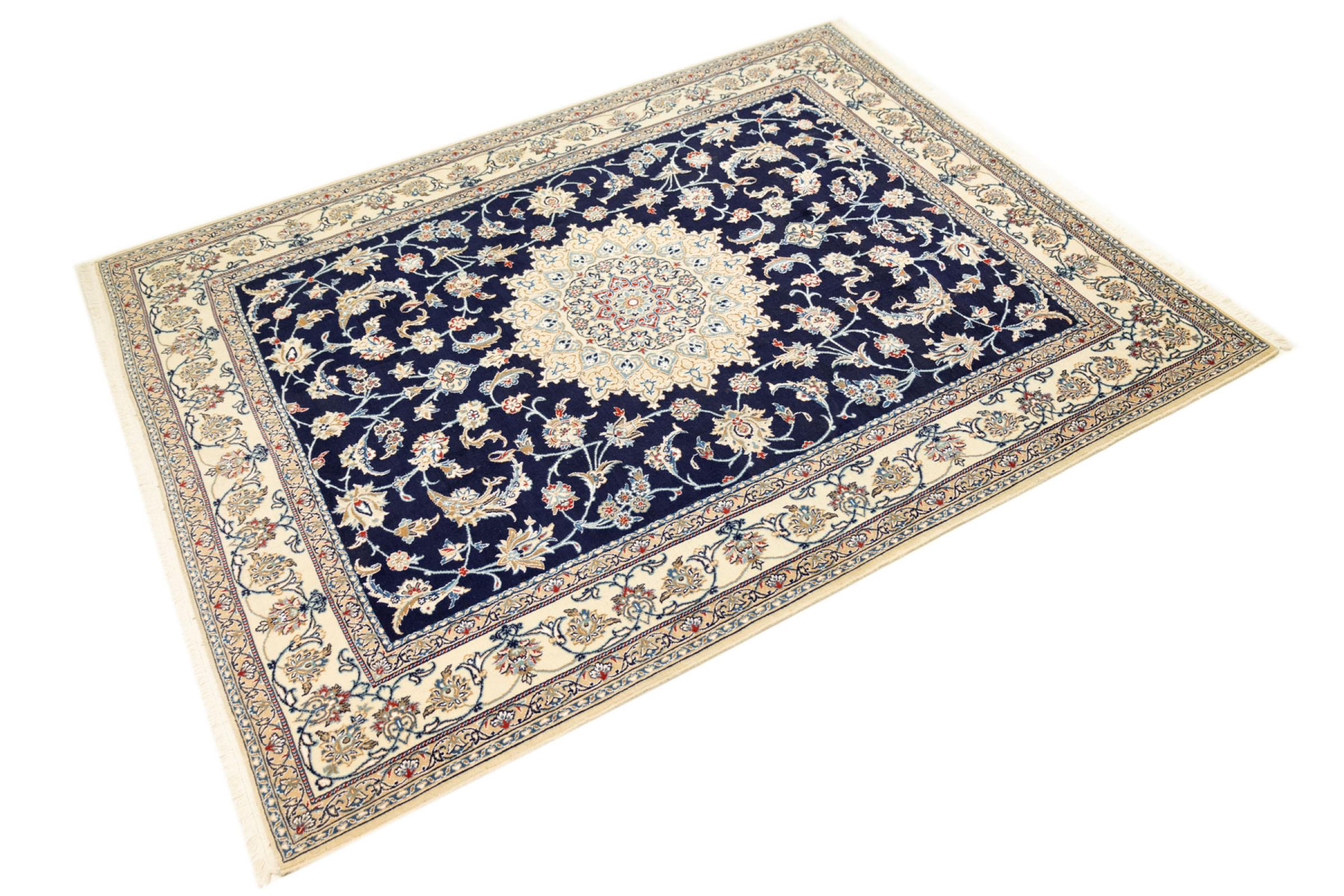 Rugs from the city of Nain, located near one of Iran's largest deserts, are among the most renowned Persian rugs in the world. Their typical design is unmistakable, featuring floral ornaments, a central medallion, and tones of beige, red, or blue. Thanks to their designations of 4La, 6La, 9La, and 12La, the fineness of a Nain rug can be easily identified at a glance. The rule is, the lower the "La" number, the higher the knot density and thus the finer the rug.