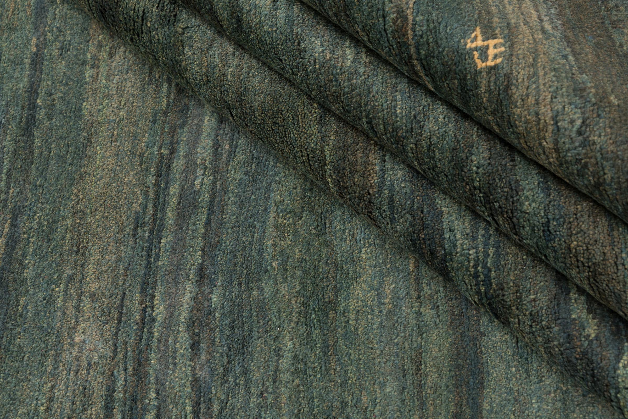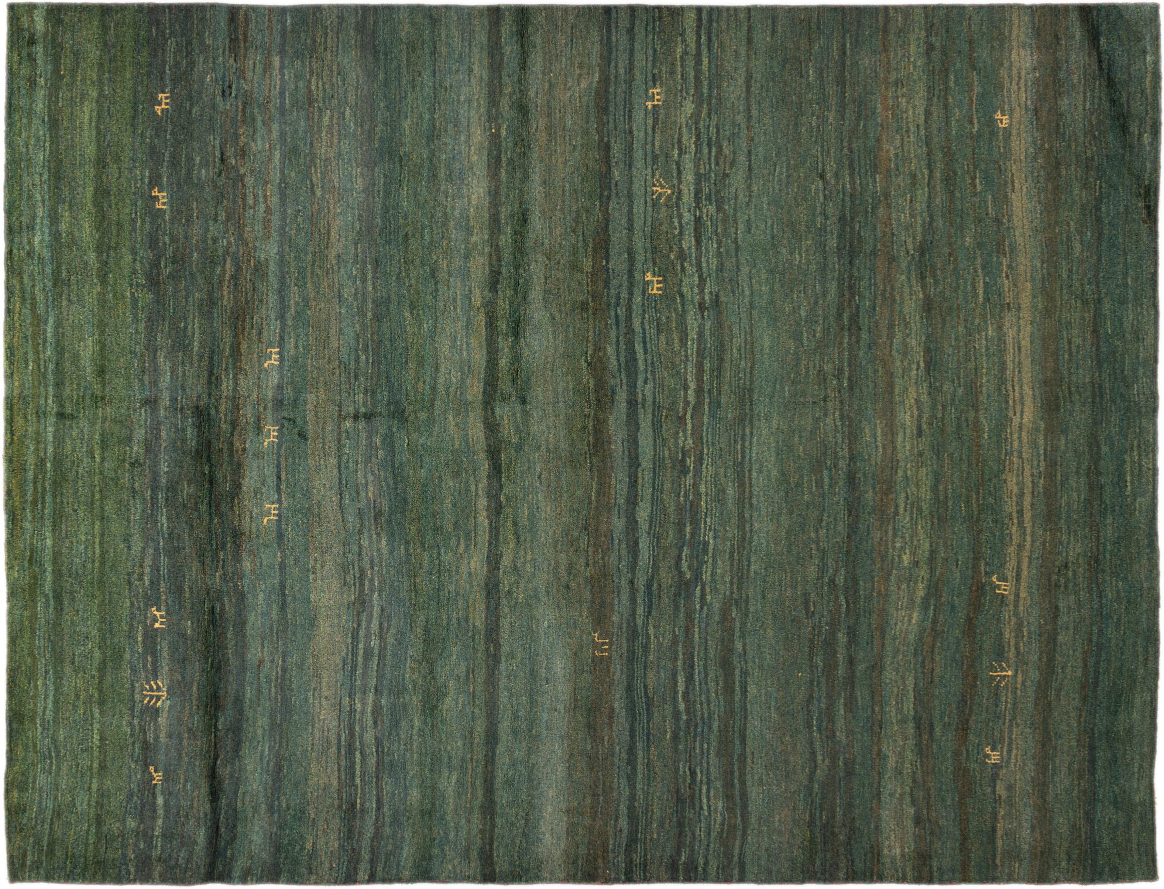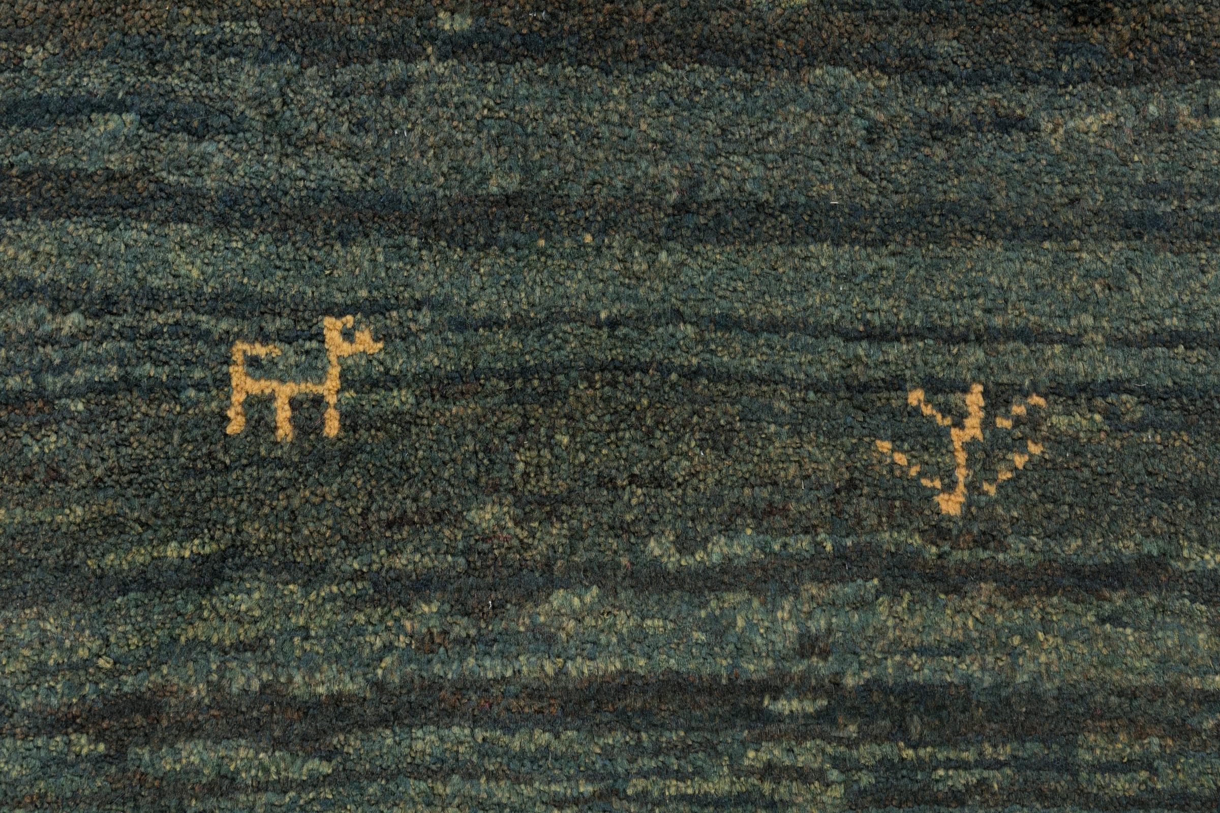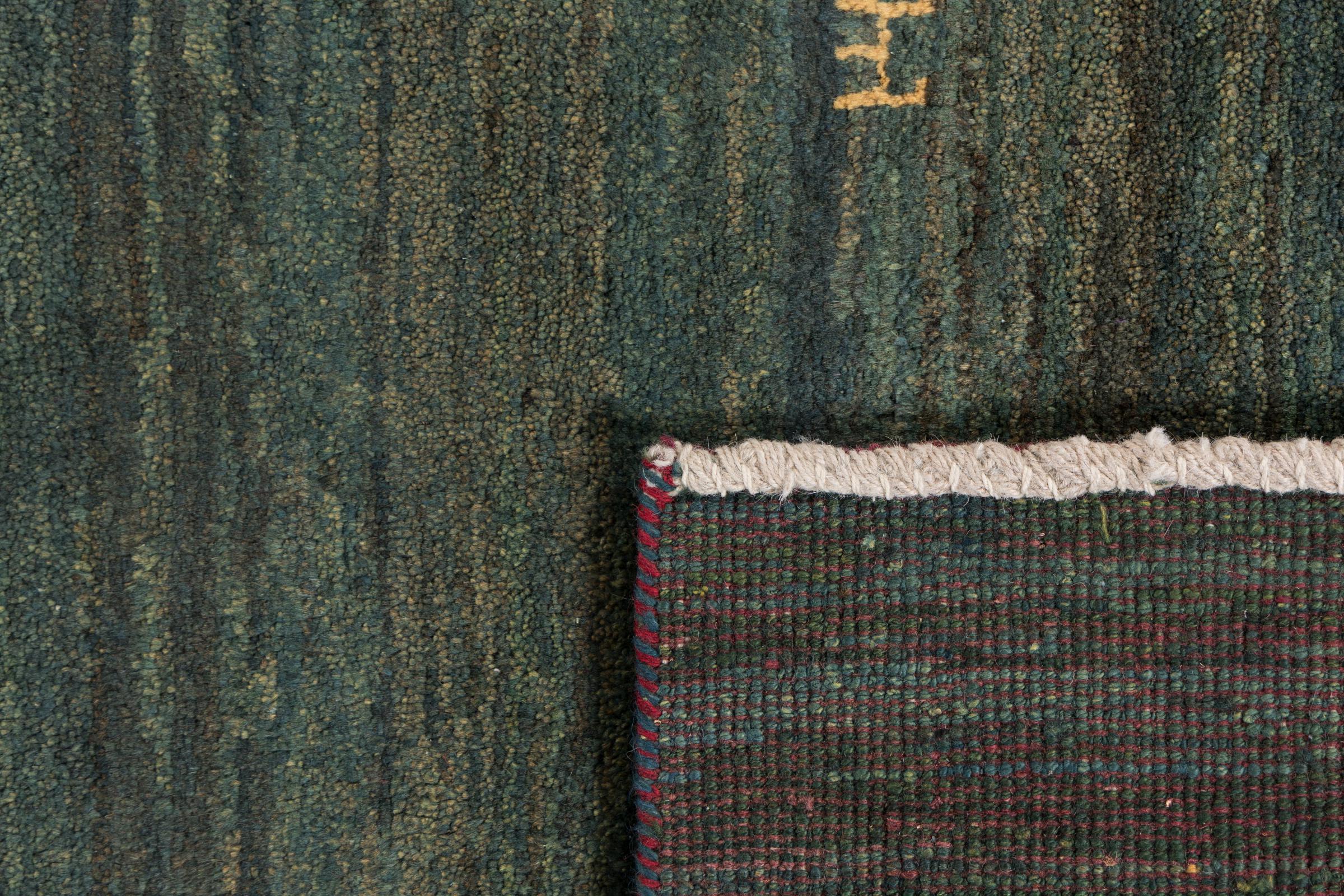 This beautiful rug is a Persian Gabbeh, one of the highest quality Gabbeh rugs available. These rugs are hand-knotted by nomads or semi-nomads in Iran using traditional artisan techniques. The simple motifs and patterns are often inspired by the nomads' immediate surroundings, featuring elements like camels, trees, or bushes. Persian Gabbeh carpets are made from wool sourced from locally raised sheep herds, with the wool typically spun by hand. Thus each of these Oriental rugs thus embodies a unique character steeped in centuries-old culture.