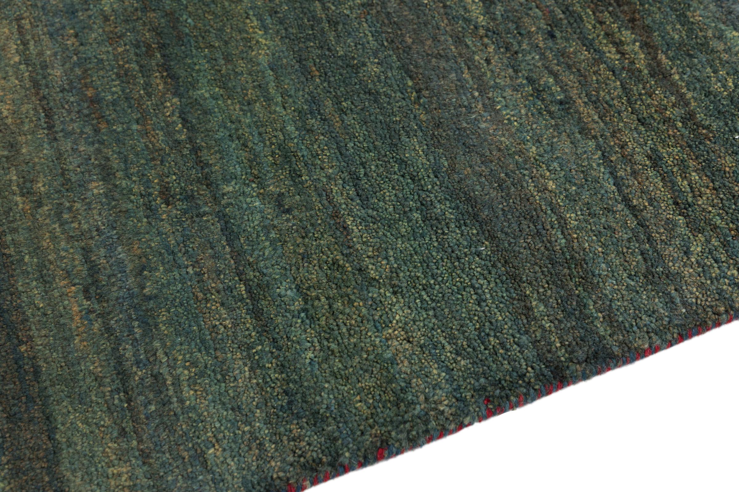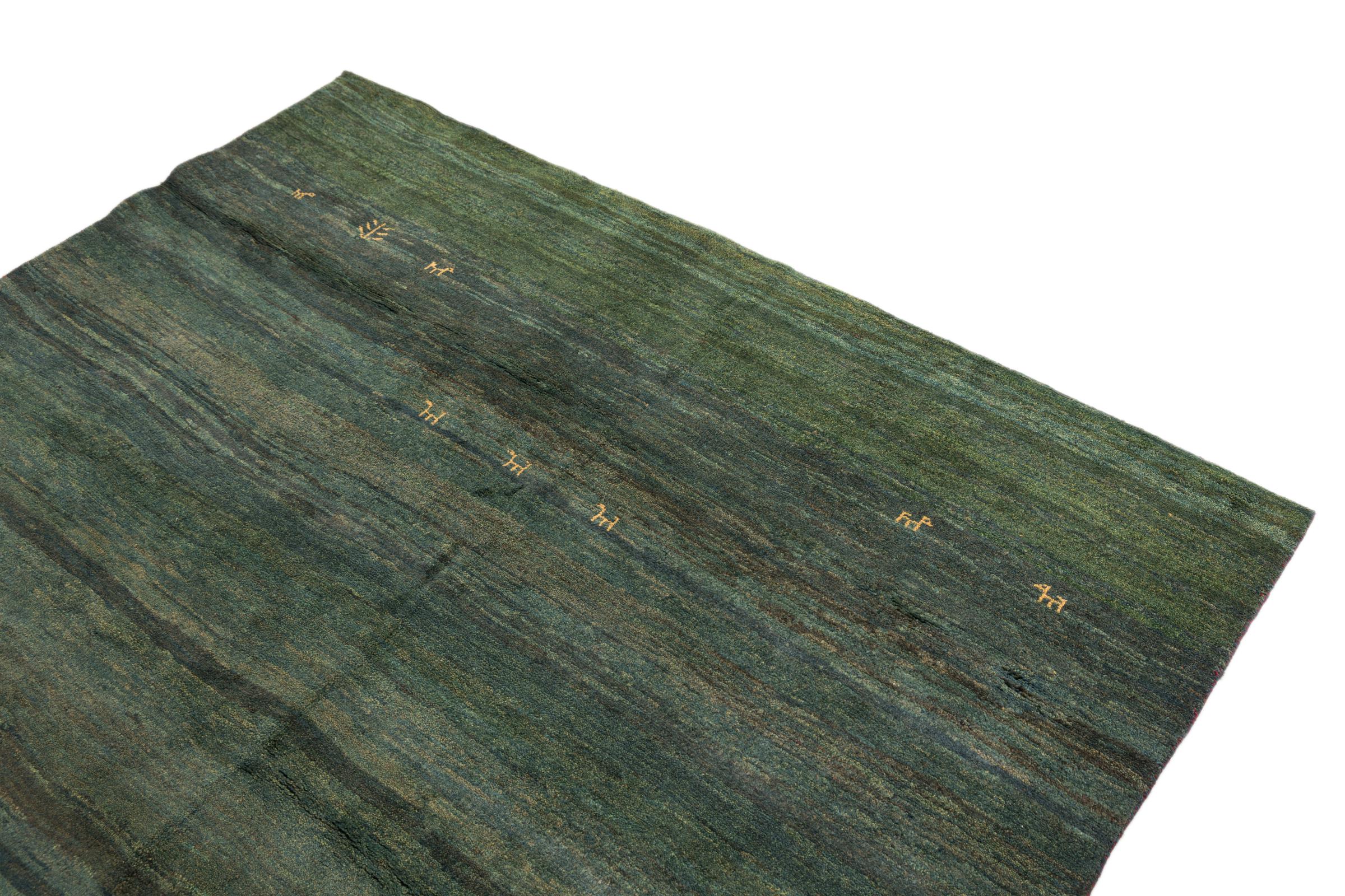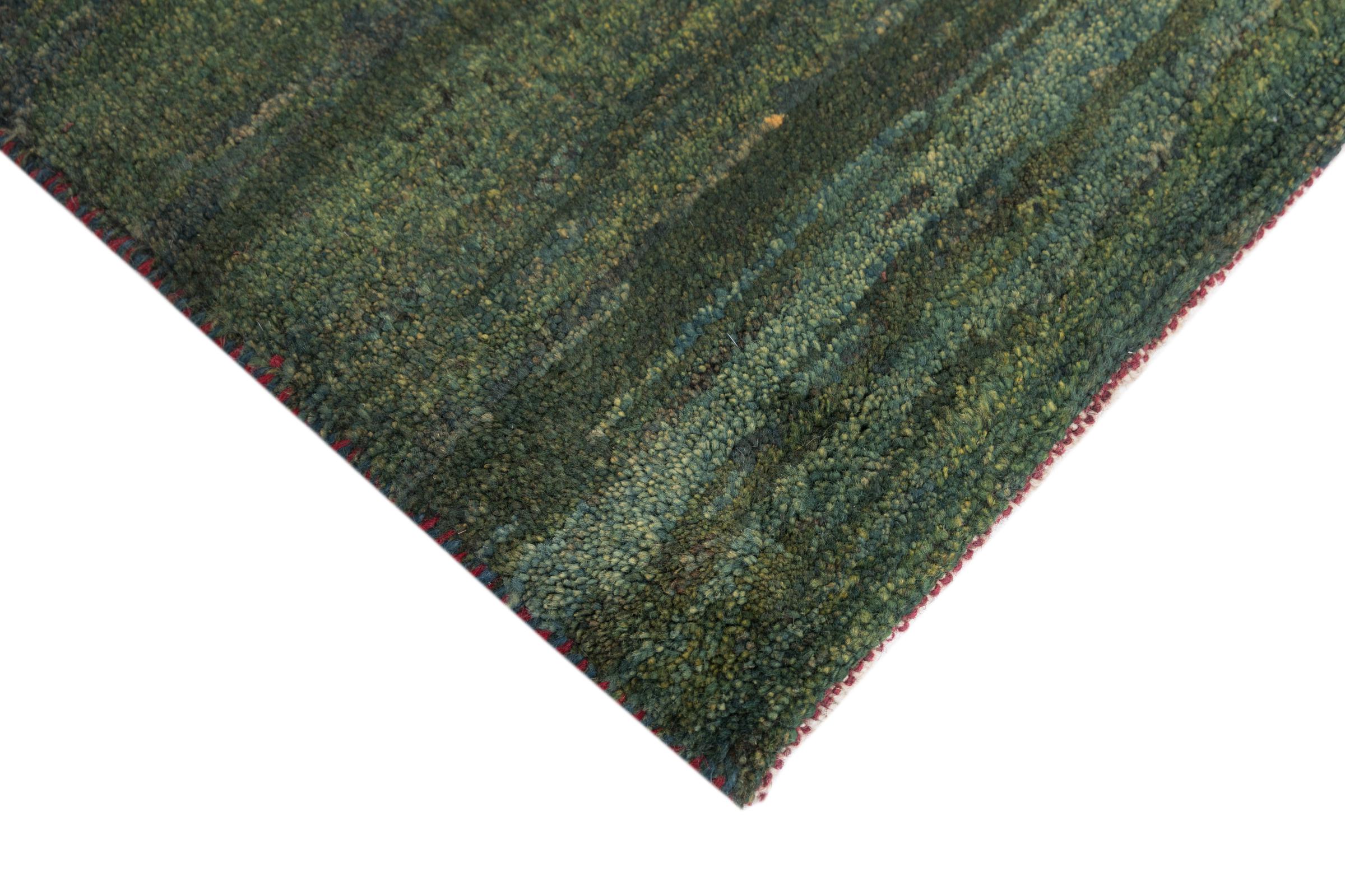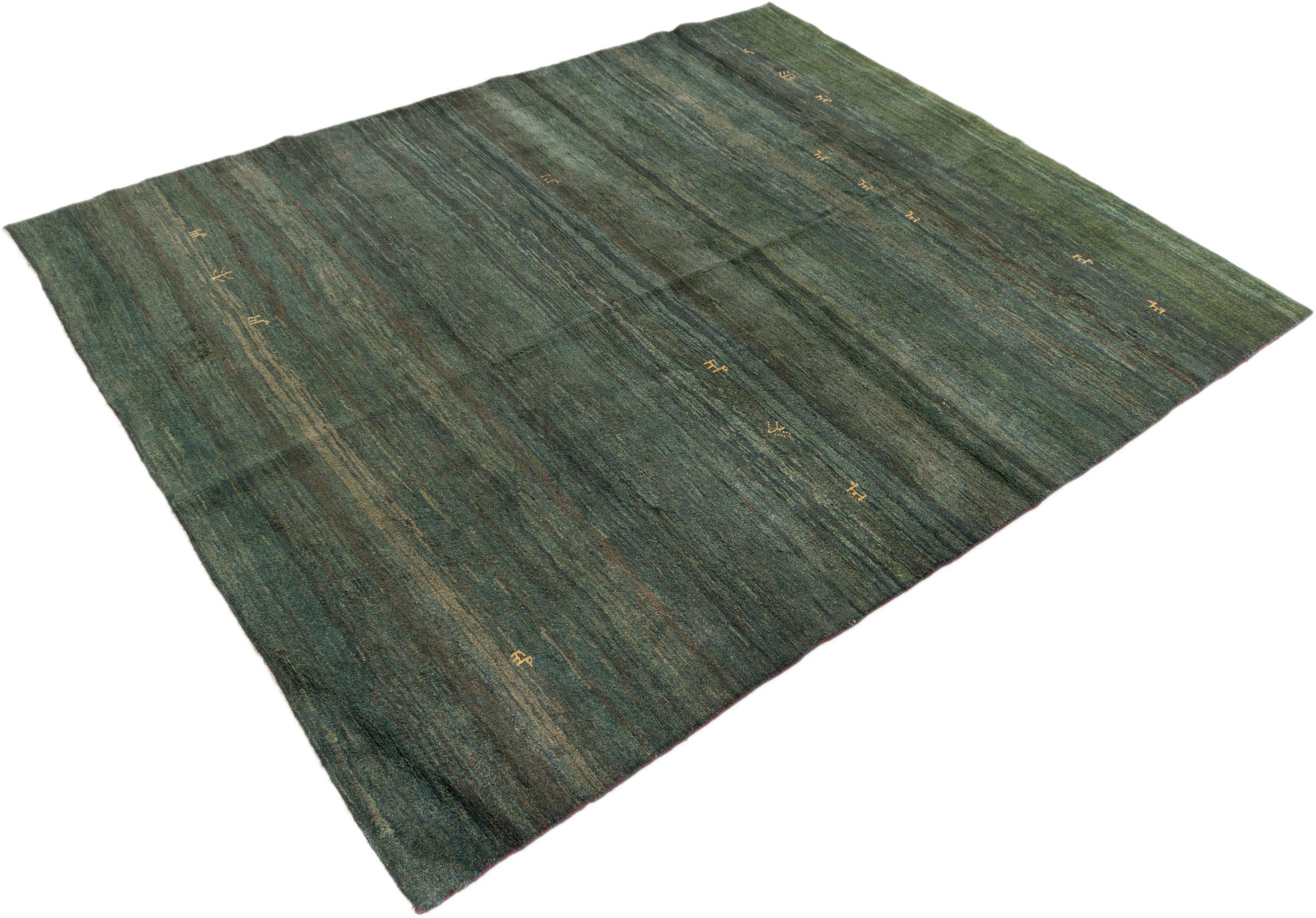 This beautiful rug is a Persian Gabbeh, one of the highest quality Gabbeh rugs available. These rugs are hand-knotted by nomads or semi-nomads in Iran using traditional artisan techniques. The simple motifs and patterns are often inspired by the nomads' immediate surroundings, featuring elements like camels, trees, or bushes. Persian Gabbeh carpets are made from wool sourced from locally raised sheep herds, with the wool typically spun by hand. Thus each of these Oriental rugs thus embodies a unique character steeped in centuries-old culture.