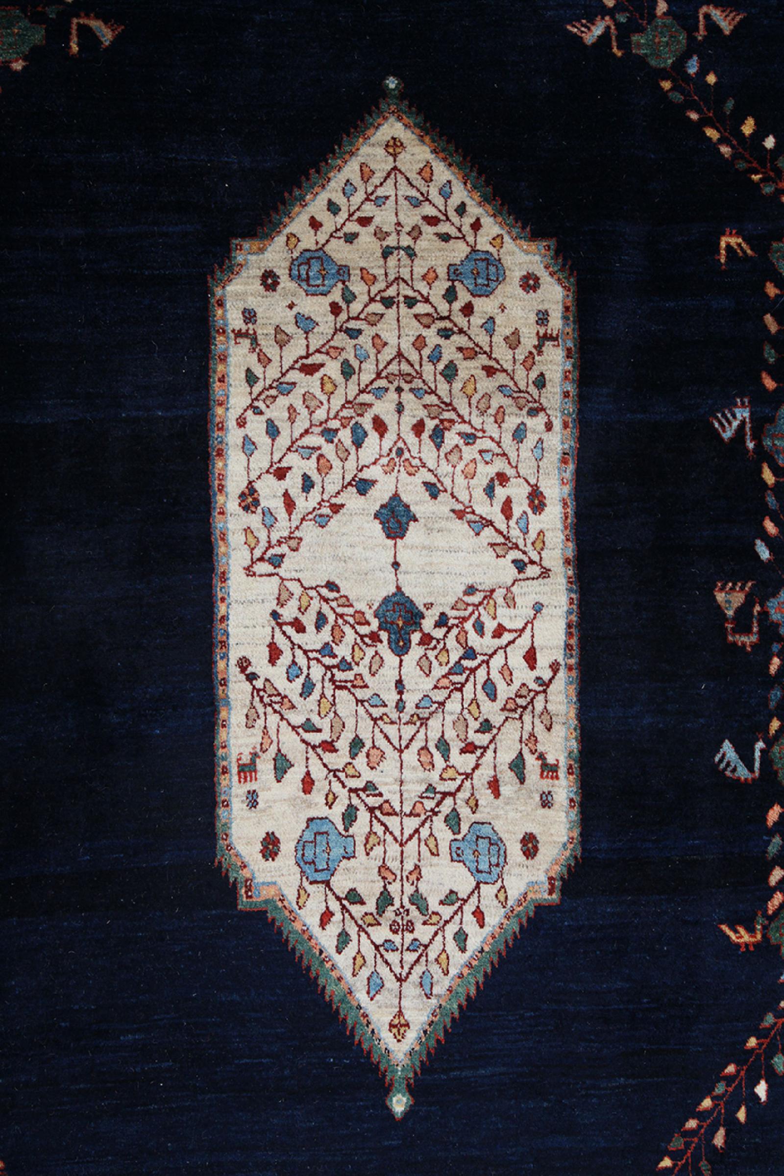 This beautiful rug is a Persian Gabbeh, one of the highest quality Gabbeh rugs available. These rugs are hand-knotted by nomads or semi-nomads in Iran using traditional artisan techniques. The simple motifs and patterns are often inspired by the nomads' immediate surroundings, featuring elements like camels, trees, or bushes. Persian Gabbeh carpets are made from wool sourced from locally raised sheep herds, with the wool typically spun by hand. Thus each of these Oriental rugs thus embodies a unique character steeped in centuries-old culture.
