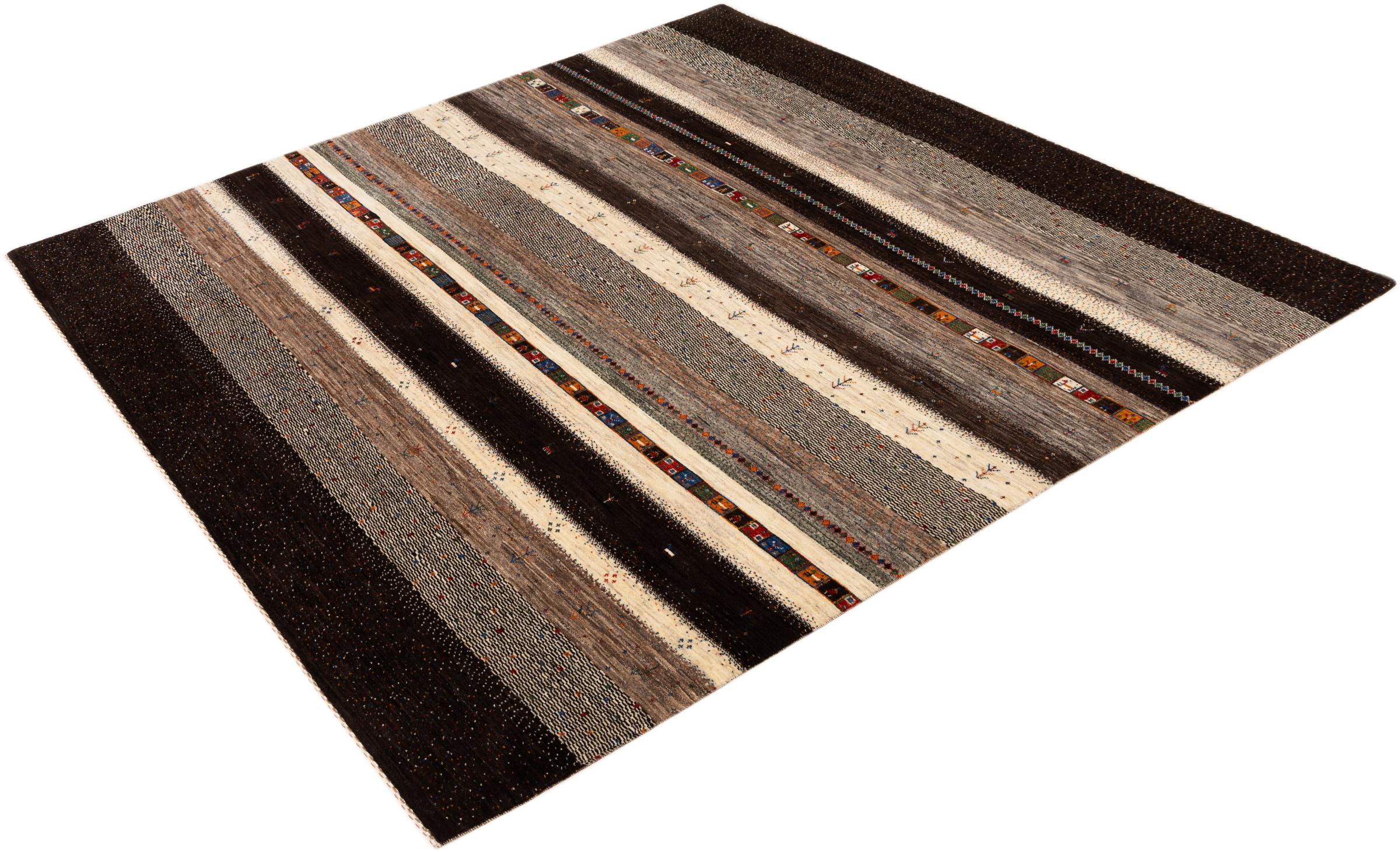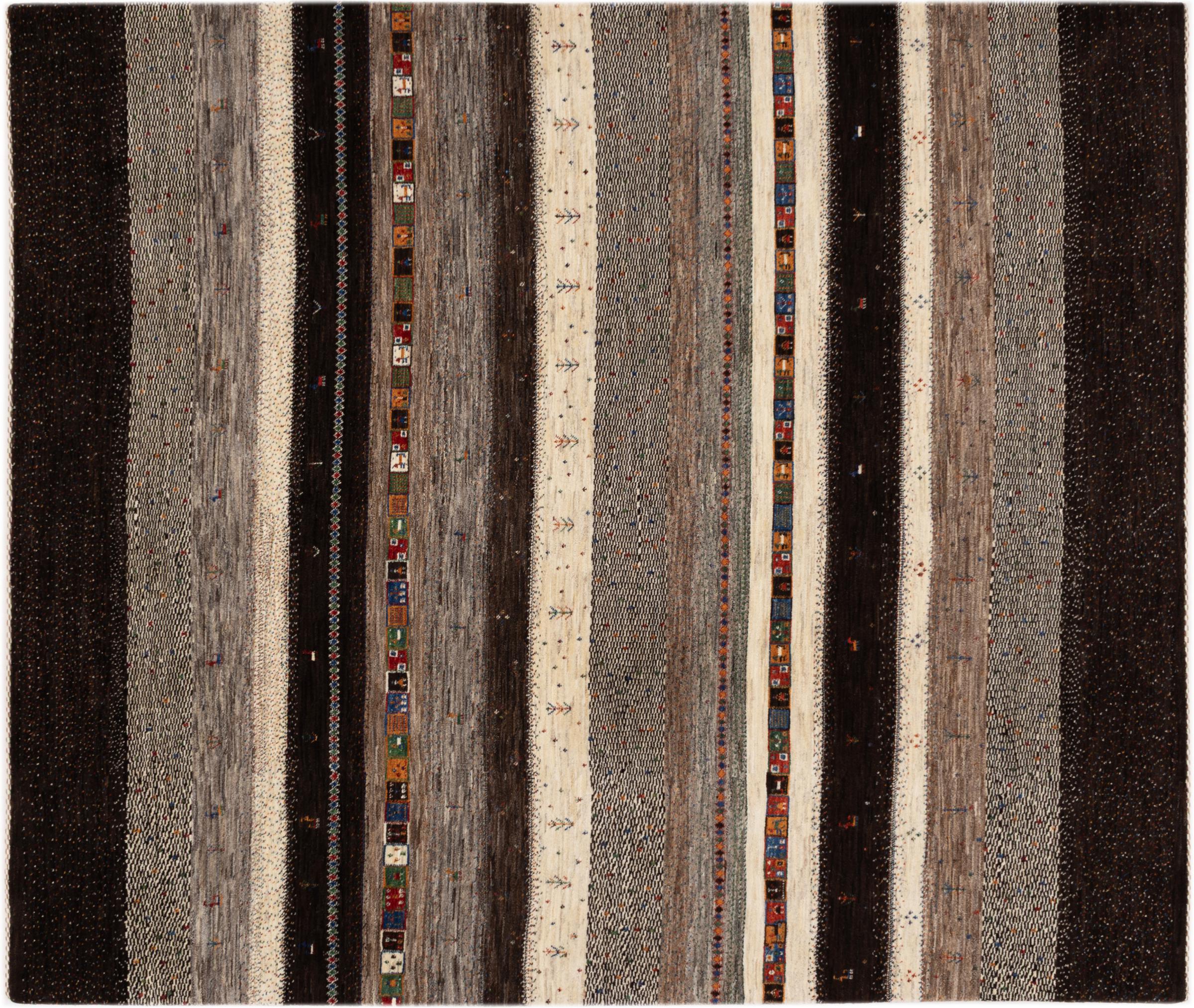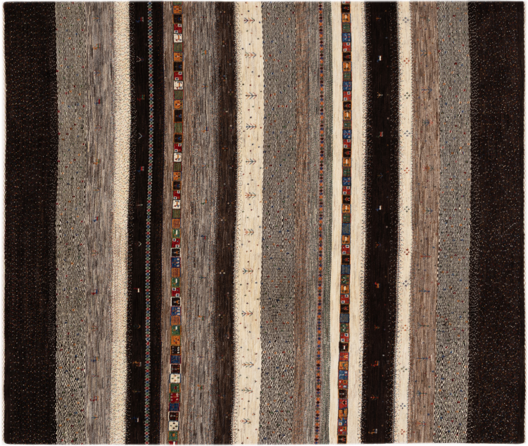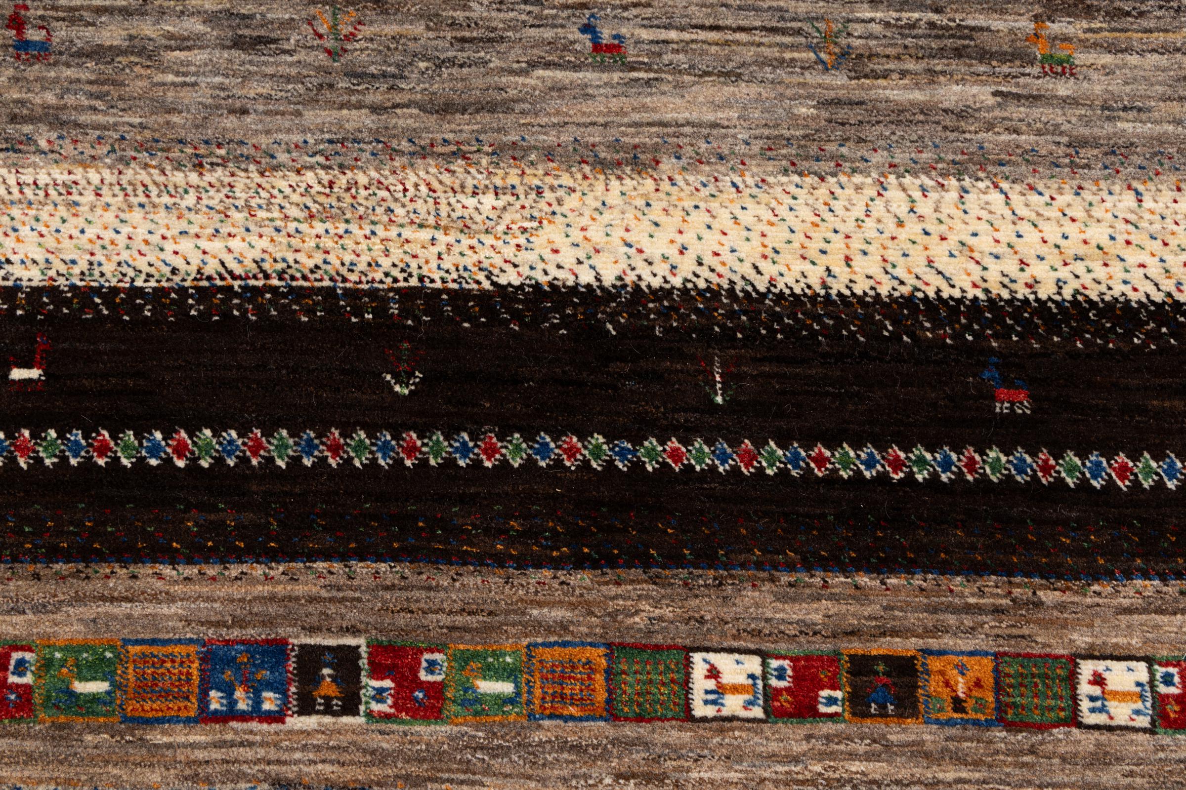 This beautiful rug is a Persian Gabbeh, one of the highest quality Gabbeh rugs available. These rugs are hand-knotted by nomads or semi-nomads in Iran using traditional artisan techniques. The simple motifs and patterns are often inspired by the nomads' immediate surroundings, featuring elements like camels, trees, or bushes. Persian Gabbeh carpets are made from wool sourced from locally raised sheep herds, with the wool typically spun by hand. Thus each of these Oriental rugs thus embodies a unique character steeped in centuries-old culture.