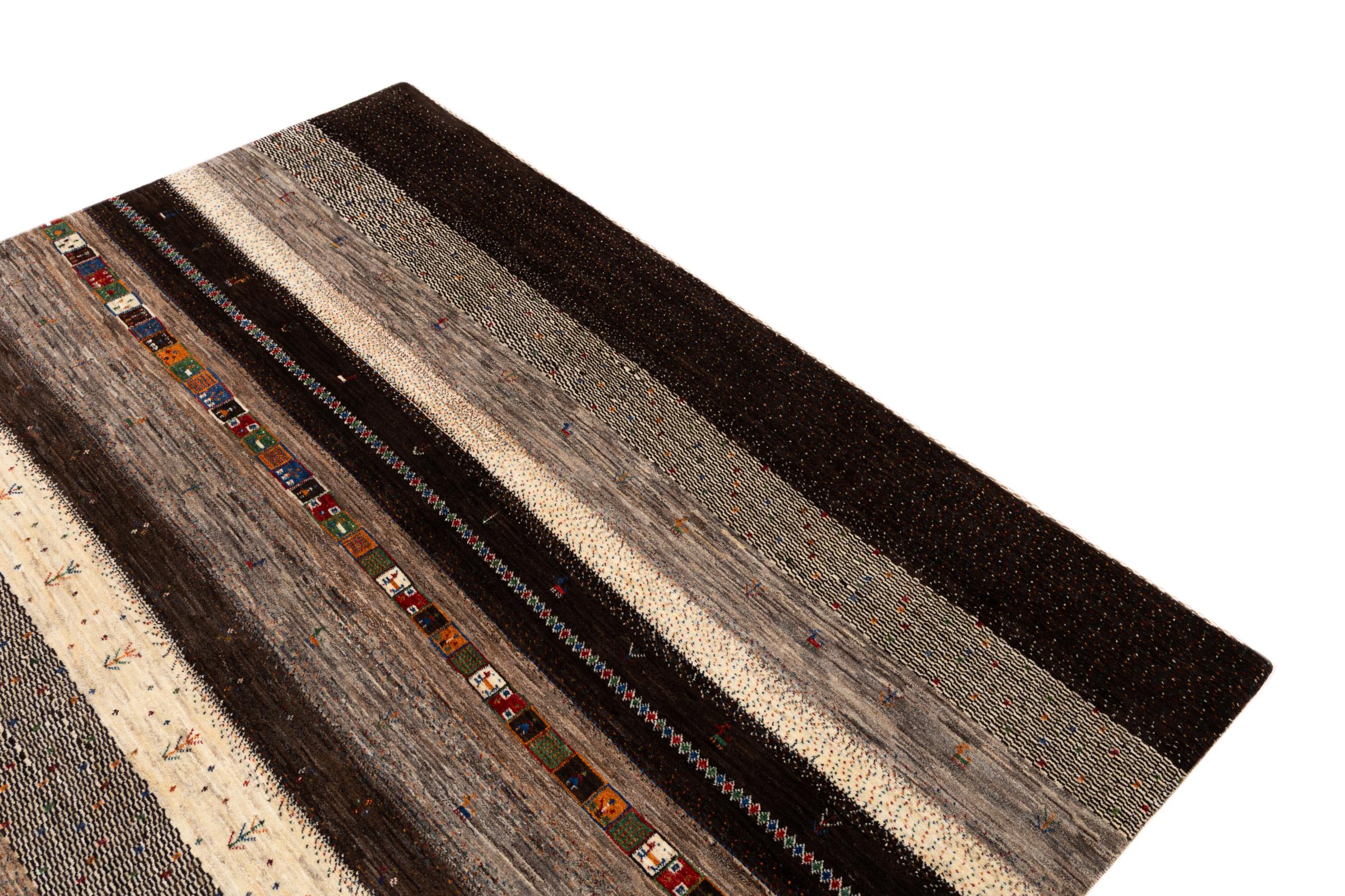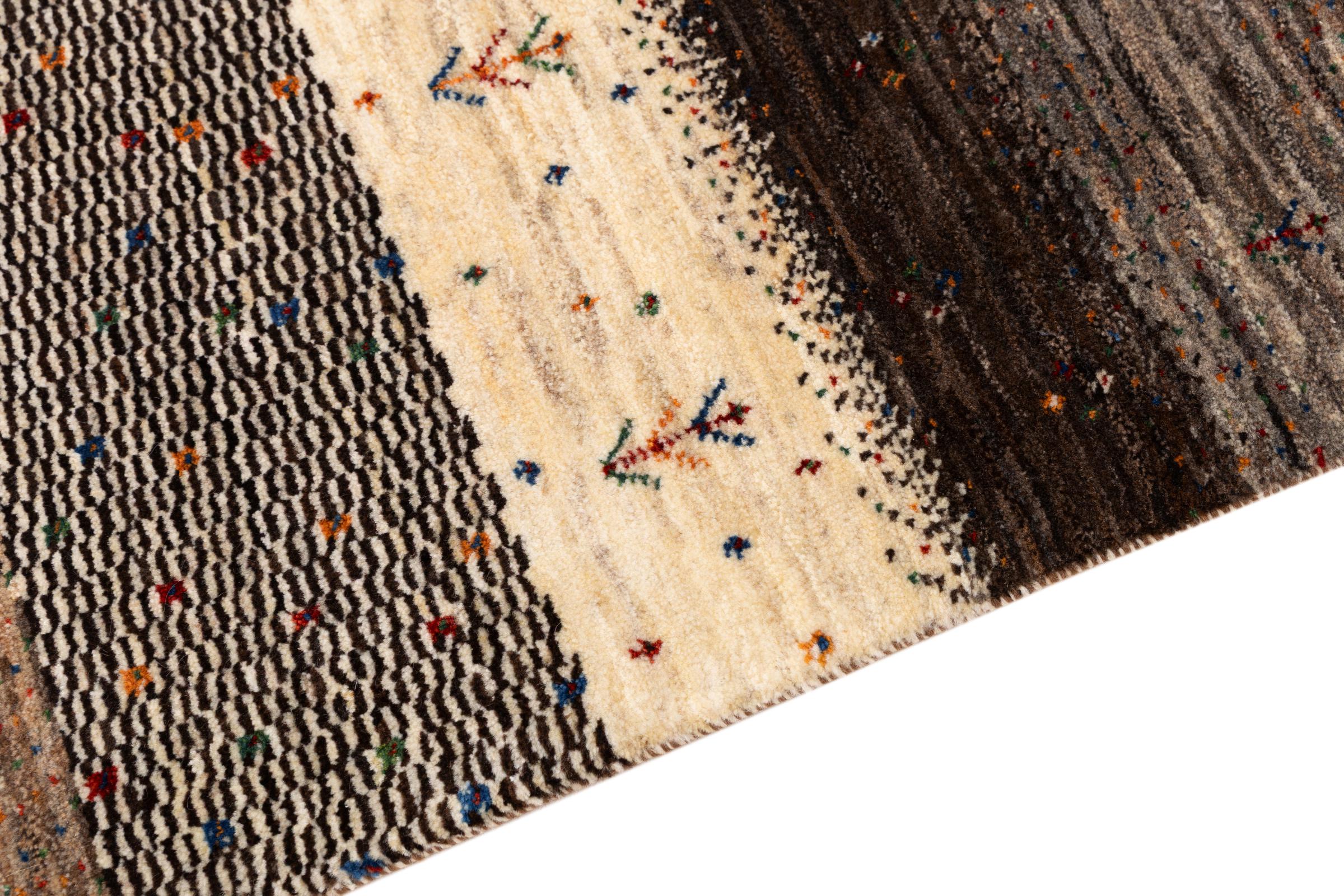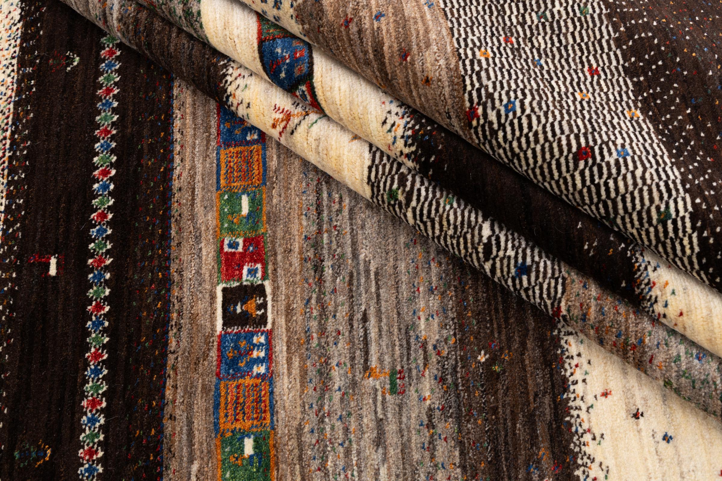 This beautiful rug is a Persian Gabbeh, one of the highest quality Gabbeh rugs available. These rugs are hand-knotted by nomads or semi-nomads in Iran using traditional artisan techniques. The simple motifs and patterns are often inspired by the nomads' immediate surroundings, featuring elements like camels, trees, or bushes. Persian Gabbeh carpets are made from wool sourced from locally raised sheep herds, with the wool typically spun by hand. Thus each of these Oriental rugs thus embodies a unique character steeped in centuries-old culture.
