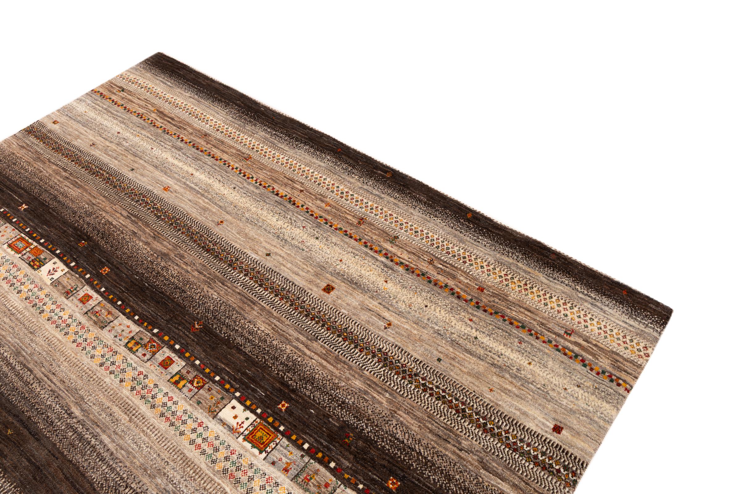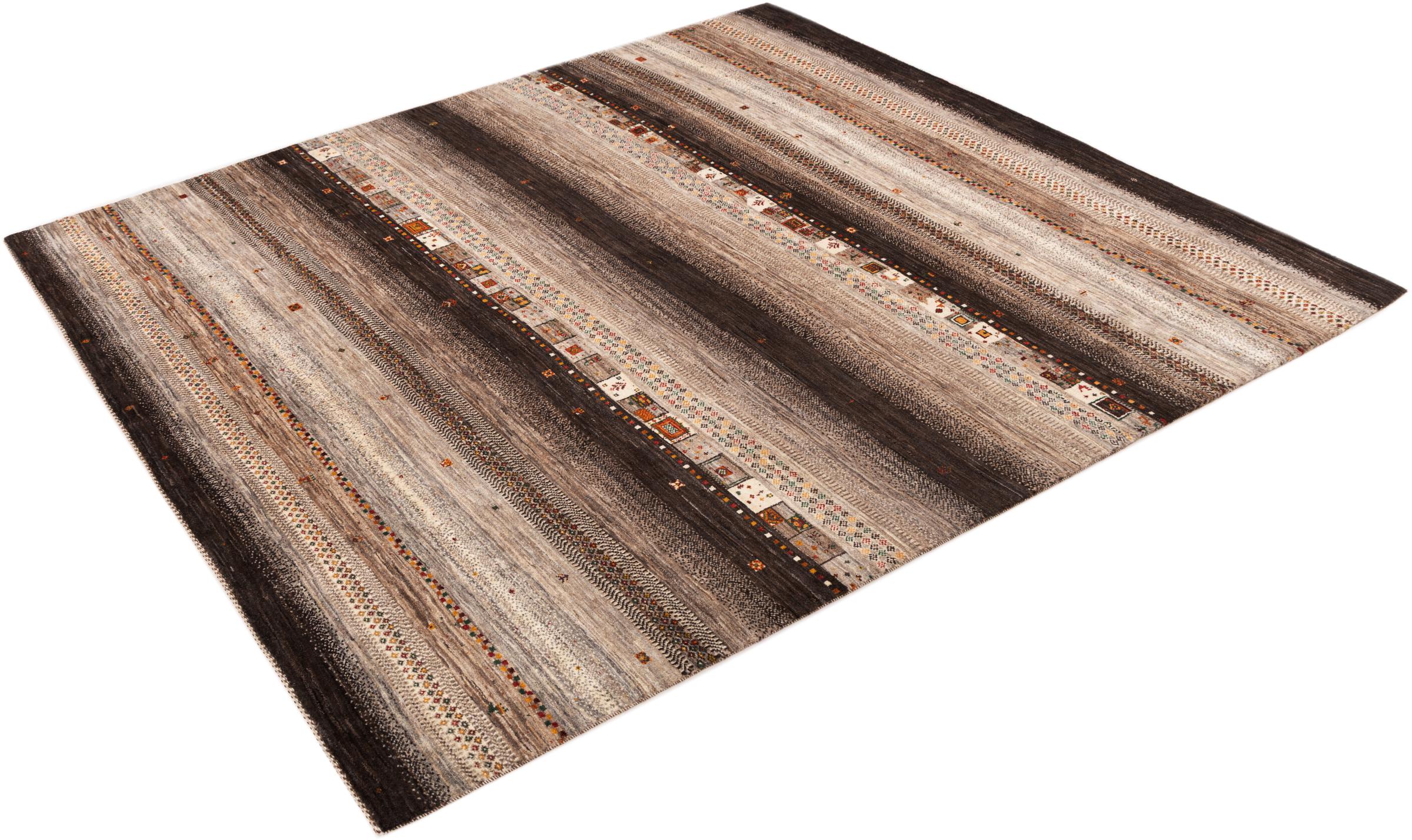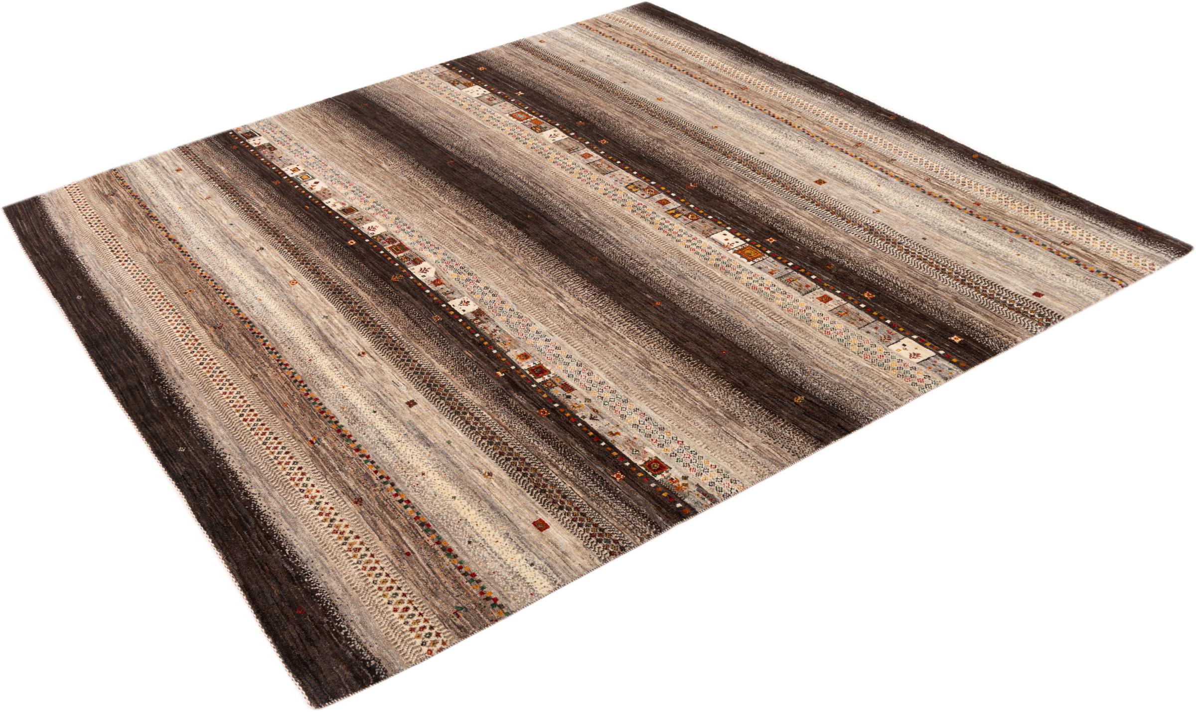 This beautiful rug is a Persian Gabbeh, one of the highest quality Gabbeh rugs available. These rugs are hand-knotted by nomads or semi-nomads in Iran using traditional artisan techniques. The simple motifs and patterns are often inspired by the nomads' immediate surroundings, featuring elements like camels, trees, or bushes. Persian Gabbeh carpets are made from wool sourced from locally raised sheep herds, with the wool typically spun by hand. Thus each of these Oriental rugs thus embodies a unique character steeped in centuries-old culture.