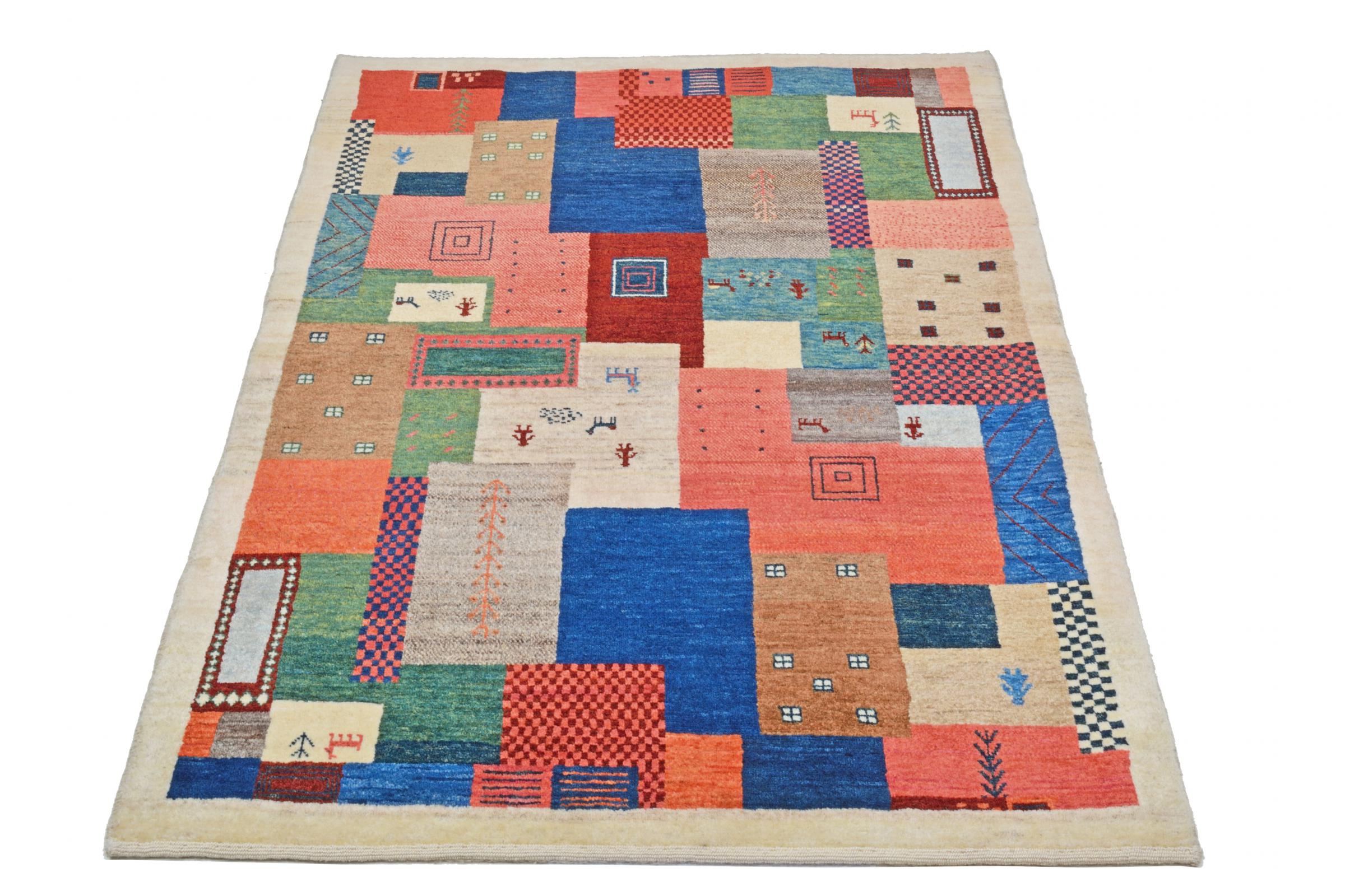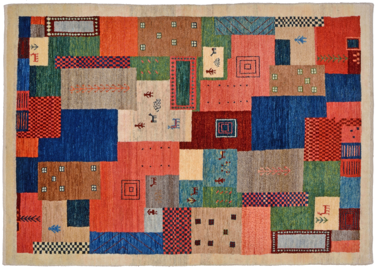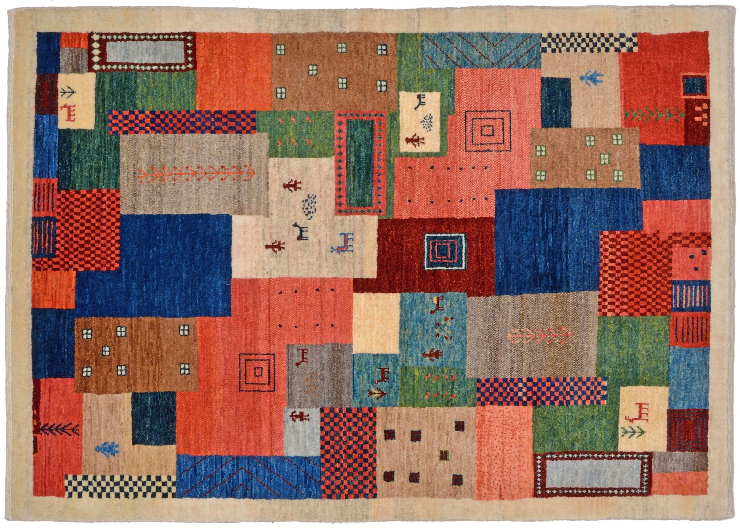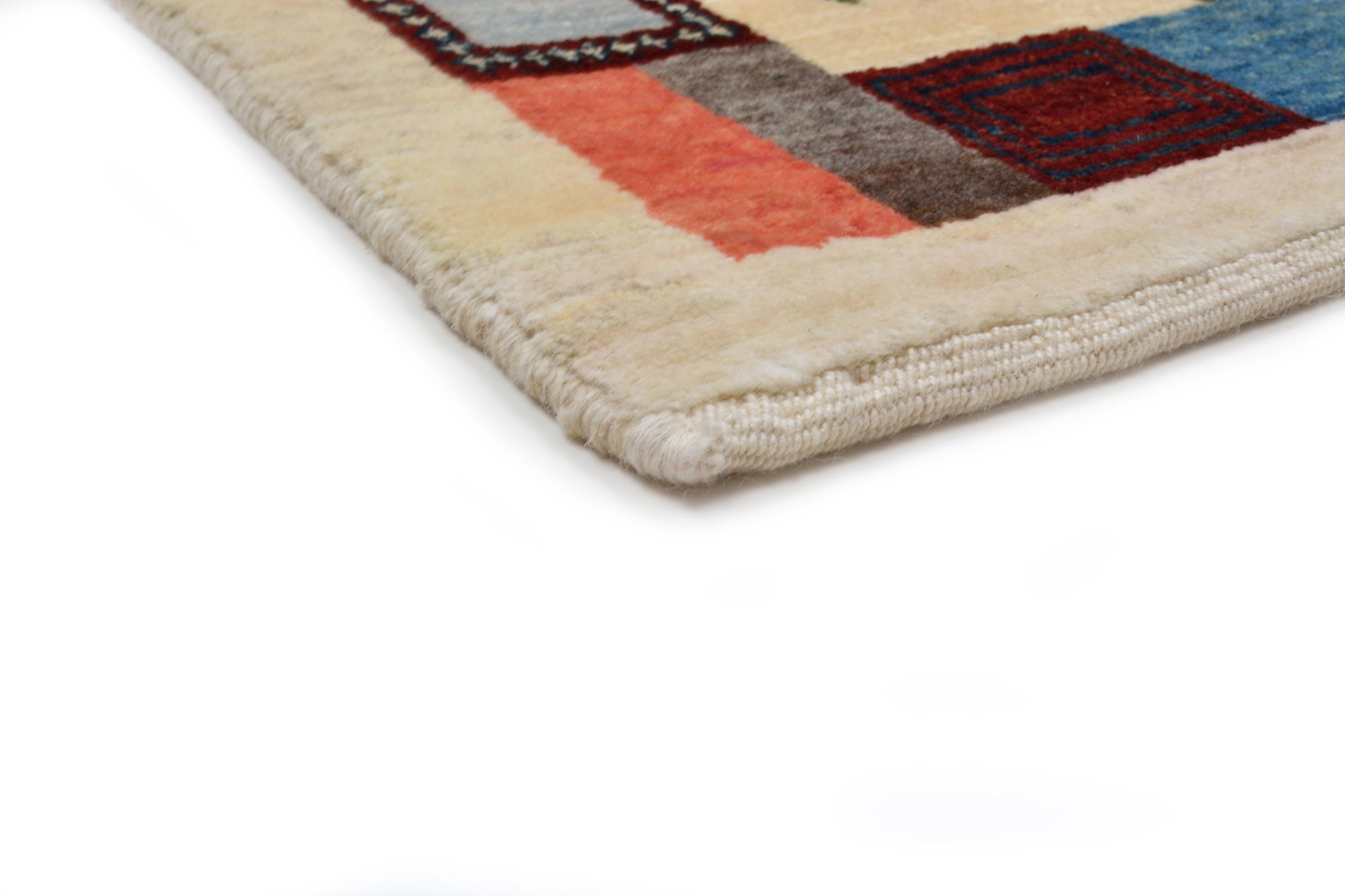 This beautiful rug is a Persian Gabbeh, one of the highest quality Gabbeh rugs available. These rugs are hand-knotted by nomads or semi-nomads in Iran using traditional artisan techniques. The simple motifs and patterns are often inspired by the nomads' immediate surroundings, featuring elements like camels, trees, or bushes. Persian Gabbeh carpets are made from wool sourced from locally raised sheep herds, with the wool typically spun by hand. Thus each of these Oriental rugs thus embodies a unique character steeped in centuries-old culture.